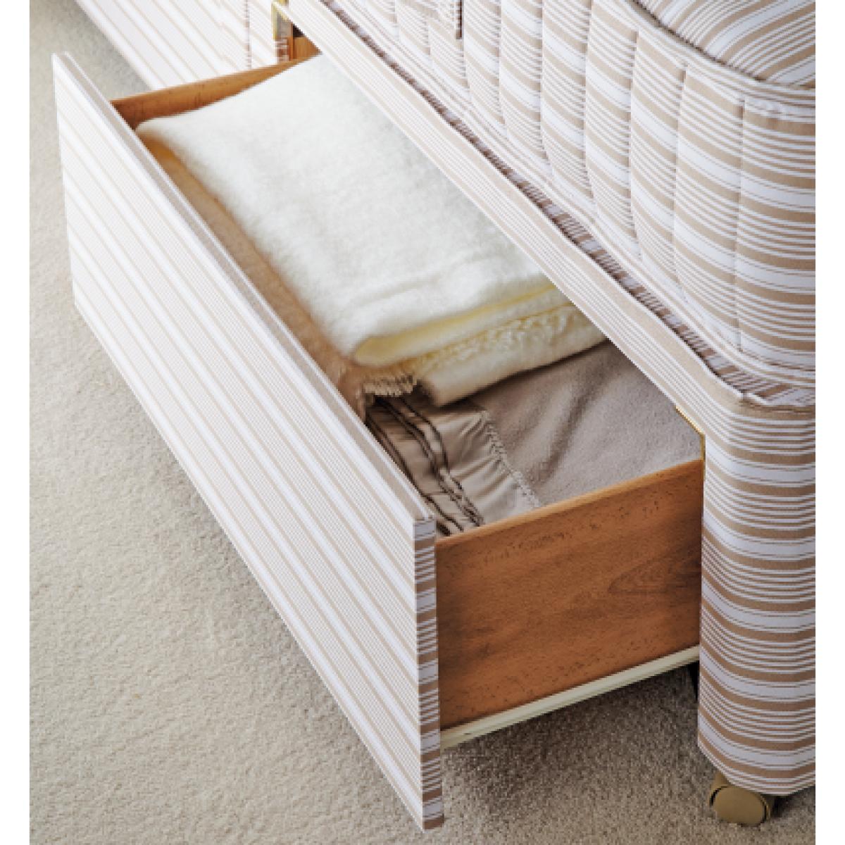 Our platform top standard divan base is ideal for those who like their bed to be a little bit firmer. Using time-honoured techniques, the wooden framed base is crafted from traceable timber, then padded and upholstered in 100% cotton ticking. The double standard divan bed base with drawers features four drawers for extra storage and comes on castors for effortless manoeuvring. Mattress sold separately; pair with our standard double mattress or upgrade to the deluxe double mattress for ultimate comfort.