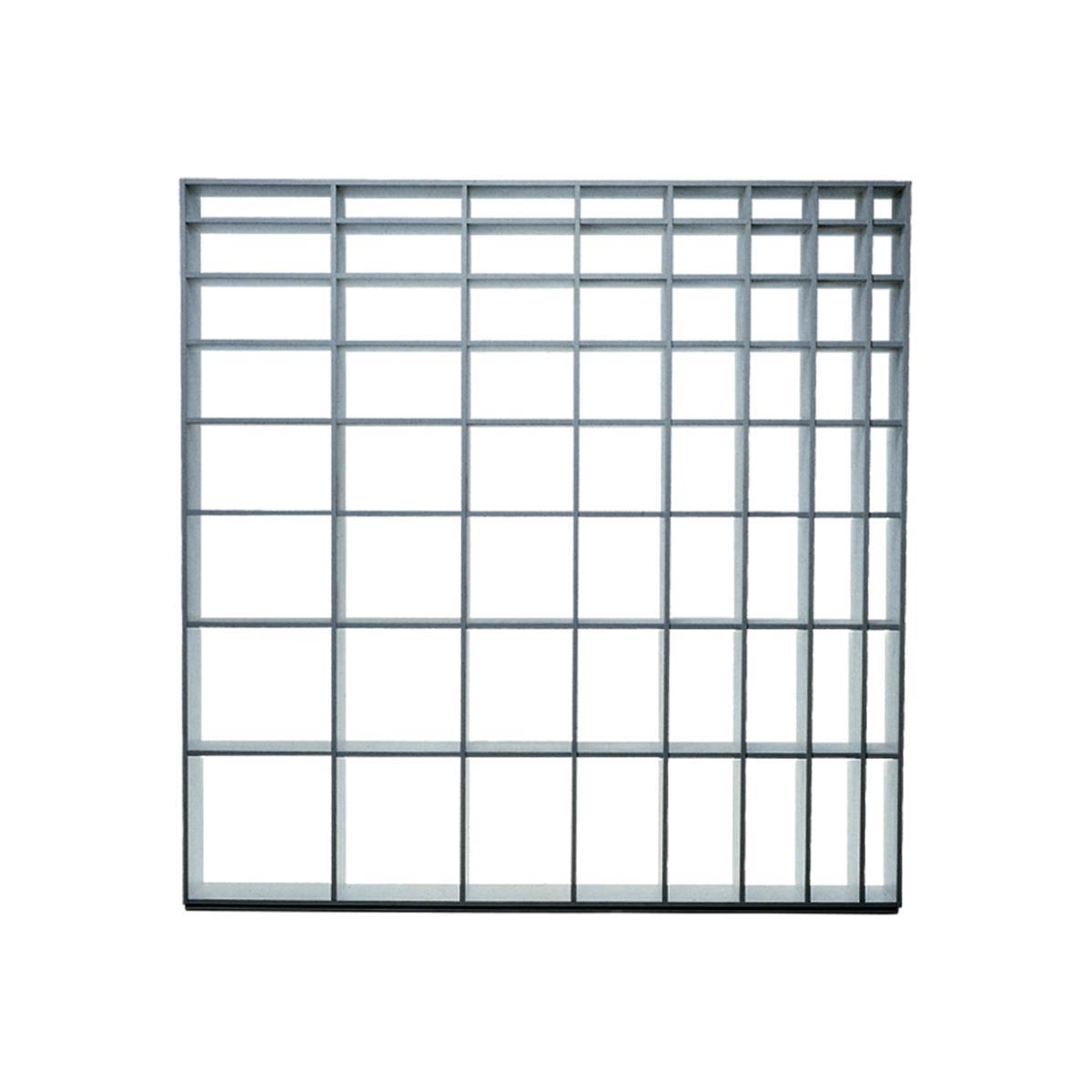 Designed in 1970 by Shiro Kuramata, this double-front bookcase is composed of panels in a white lacquer finish. Each compartment is of a slightly different size. The ultimate clean, chic storage unit, this piece and can be used as a conventional bookcase or a handsome room divider.