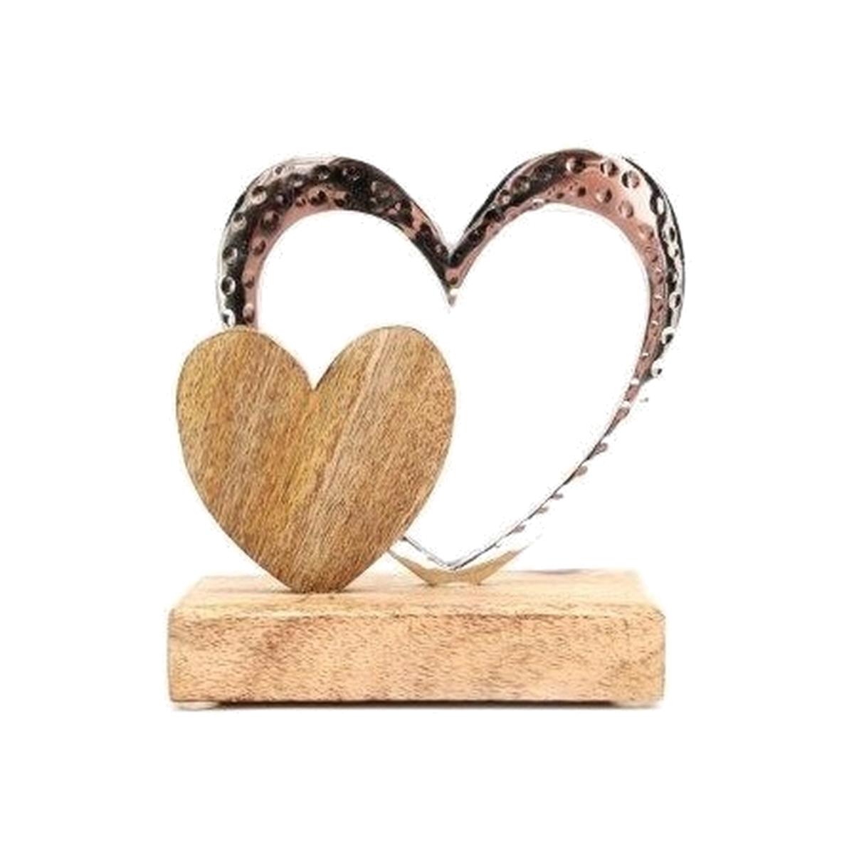 A small natural double heart ornament in wood and silver metal with a natural finish. Made of aluminium and mango wood and featuring protective pads to the underside to protect your furniture. This is a great home ornament or you can even provide this as a gift for a home, couple etc.