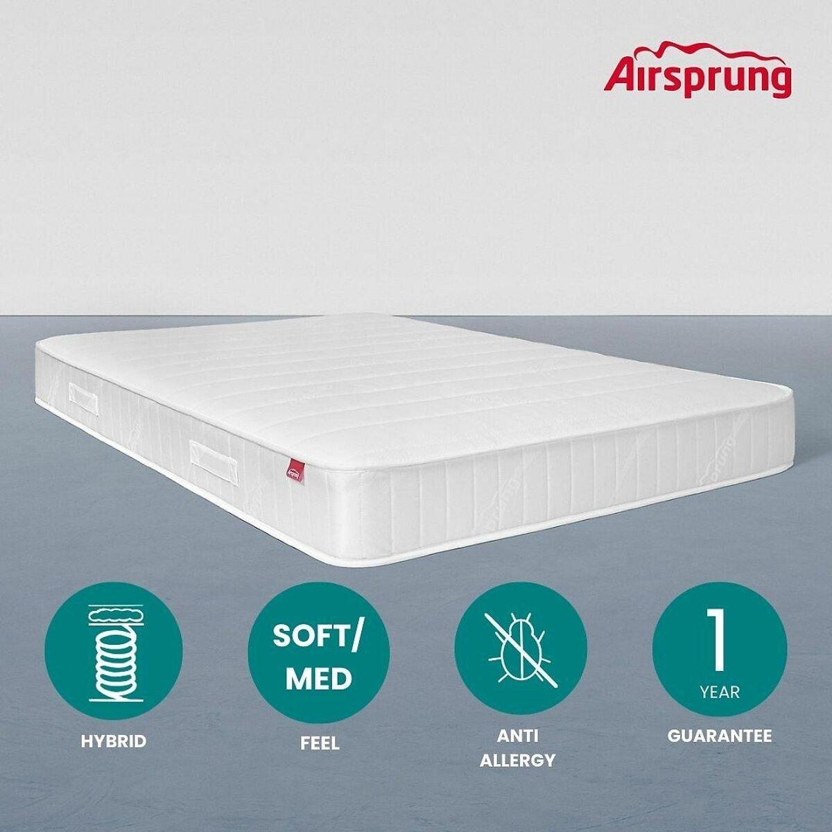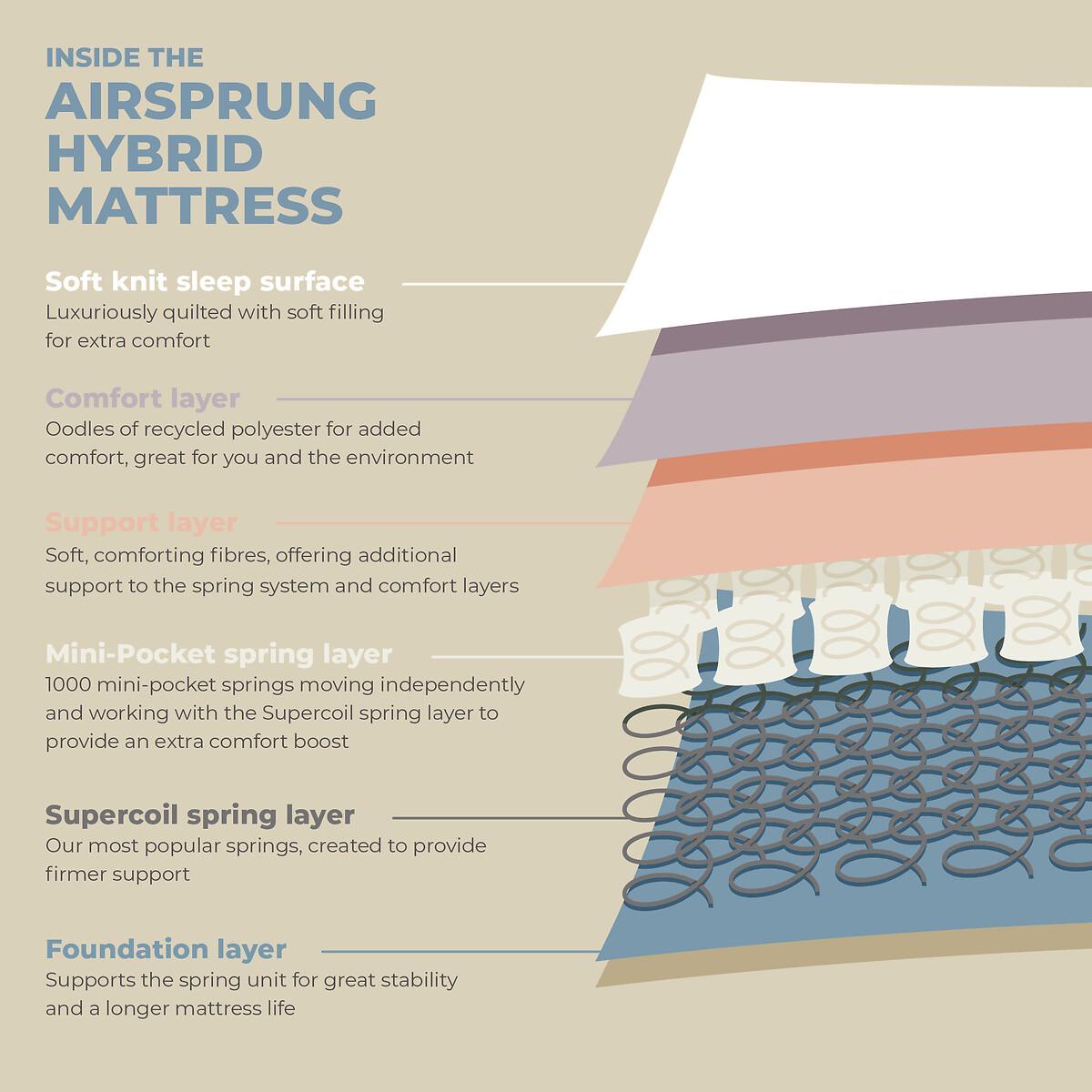 As you know, a hybrid is a cross between two things. Two things here mean double comfort. Cleverly, 1000 movement-reducing, individual mini pocket springs sit on top of Airsprung’s Supercoil® spring system. So that’s double springs in one mattress!On top of that - quite literally - the comfort layers are proudly made from 80% recycled plastic - soft sumptuous polyester fillings; super comfy and kinder to the environment. You don’t even need to turn it - just rotate occasionally to keep its longevity and liveliness. Then it’s time to say hello to maximum support and comfort. This Hybrid model is delivered rolled for maximum convenience. Just remove the packaging, watch the mattress unfurl then have a restful lie down having congratulated yourself on a smart purchase. Who would have thought - a hybrid rose, a hybrid car, and now our bang up to date hybrid mattress.• Medium/Soft feel• Airsprung Supercoil® springs + 1000 mini pocketed springs layer• Contains recycled materials• Triple AAA freshness treatment• 25cm depth• Handles for ease of rotating• Non turn• 1 year guarantee• NBF accredited• Meets all UK fire regulations - peace of mind. Product Dimensions:Single: Length: 190cm, Width: 90cm, Height: 25cm. Double:Length: 190cm, Width: 135cm, Height: 25cm. King:Length: 200cm, Width: 150cm, Height: 25cm. Super King: Length: 200cm, Width: 180cm, Height: 25cm. Please remember to measure your available space before ordering. Packaged Dimensions:Single: Weight: 18.2kg, Length: 96cm, Width: 39cm, Height: 39cm. Double:Weight: 27.4kg, Length: 141cm, Width: 39cm, Height: 39cm. King:Weight: 32kg, Length: 156cm, Width: 39cm, Height: 39cmSuper. King:Weight: 38.3kg, Length: 186cm, Width: 39cm, Height: 39cm. This product will be dispatched by one of our trusted suppliers. You’ll be contacted by their selected courier about your delivery. AIRSP01