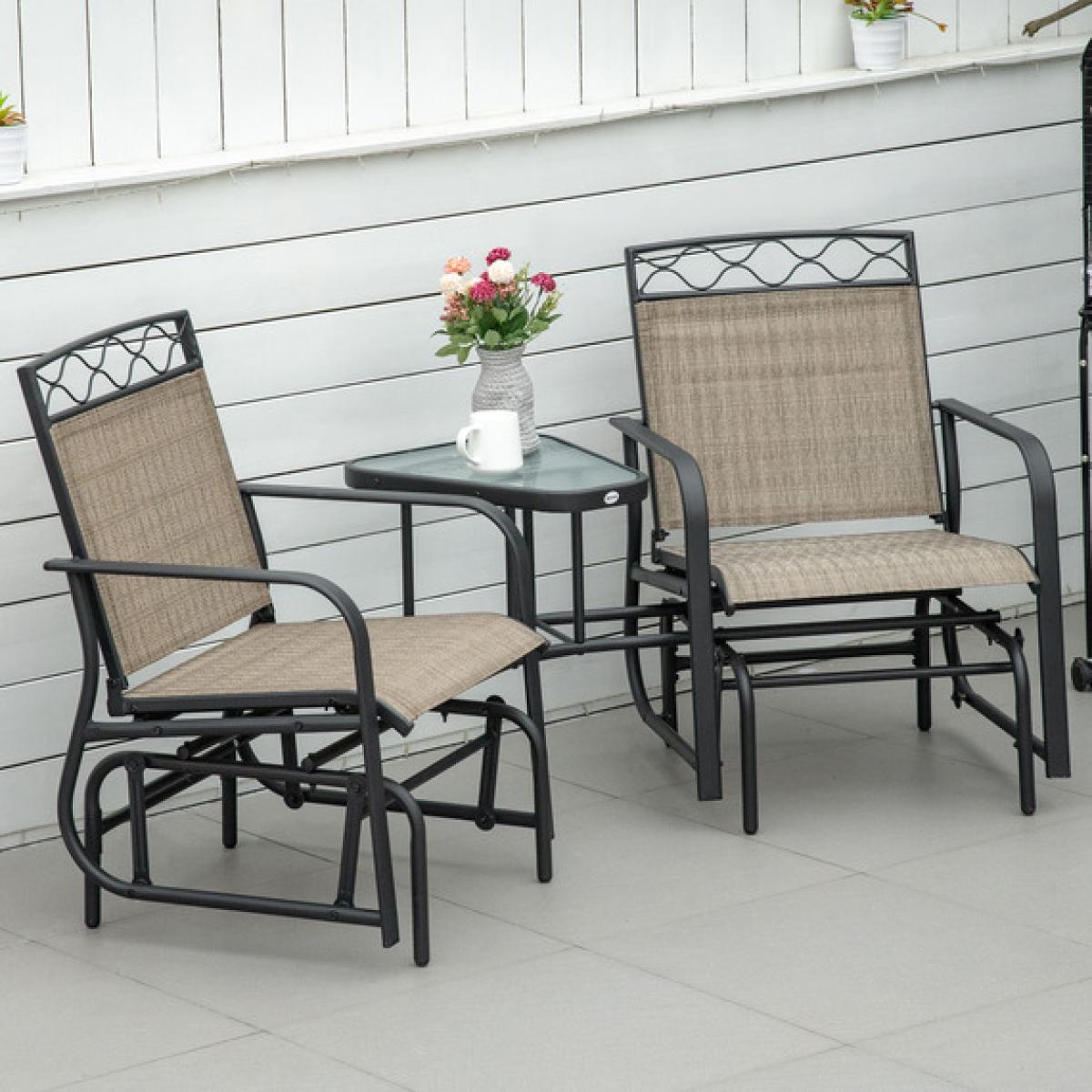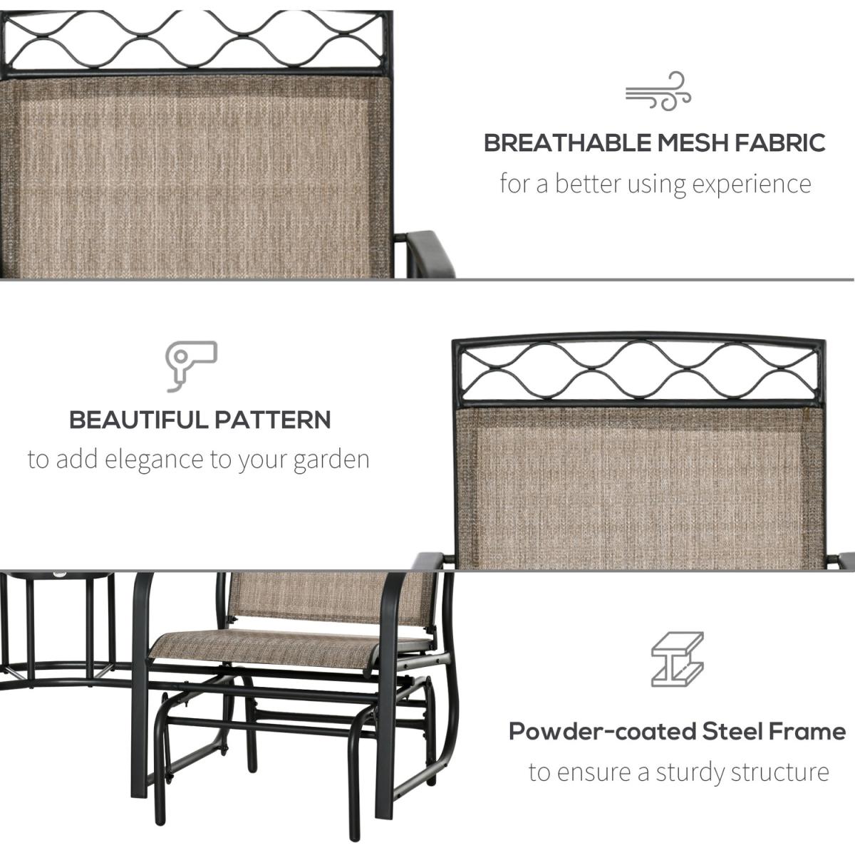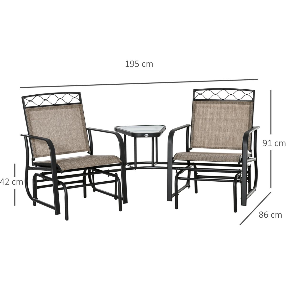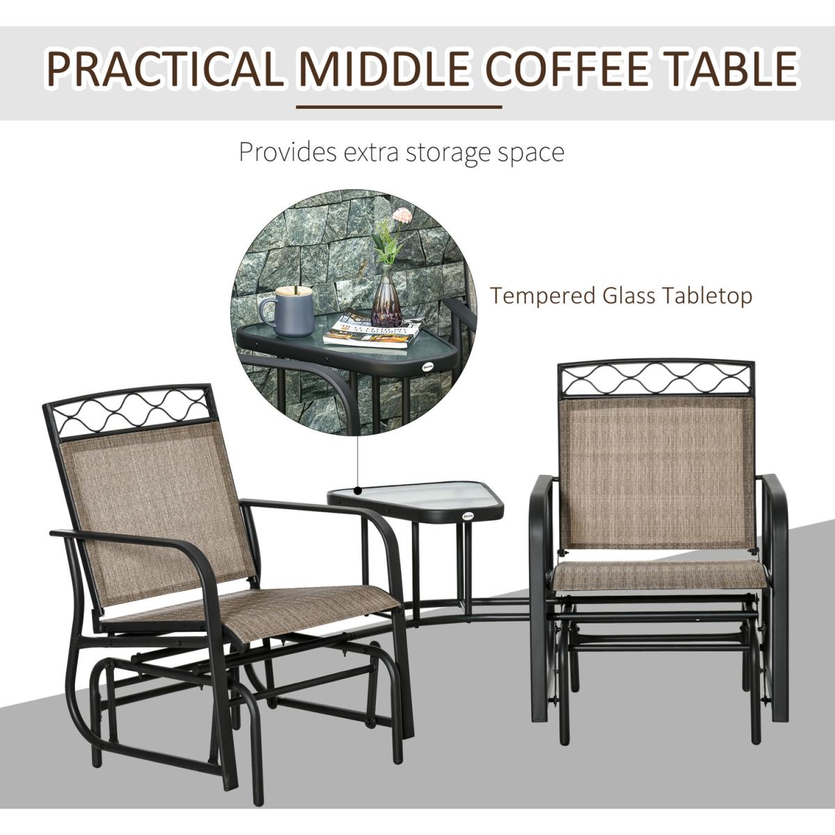 Whether it's for the patio, conservatory, or balcony, this outdoor glider chair for two from Outsunny is ideal for relaxing the day away with your friend. Ergonomically designed, both rocker chairs are comfortable with their curved seats and fabric mesh covers. Fixed in the middle of the seats is the glass-top table to put coffee cup and more. Enjoy leisure time outside, gently gliding the day away.