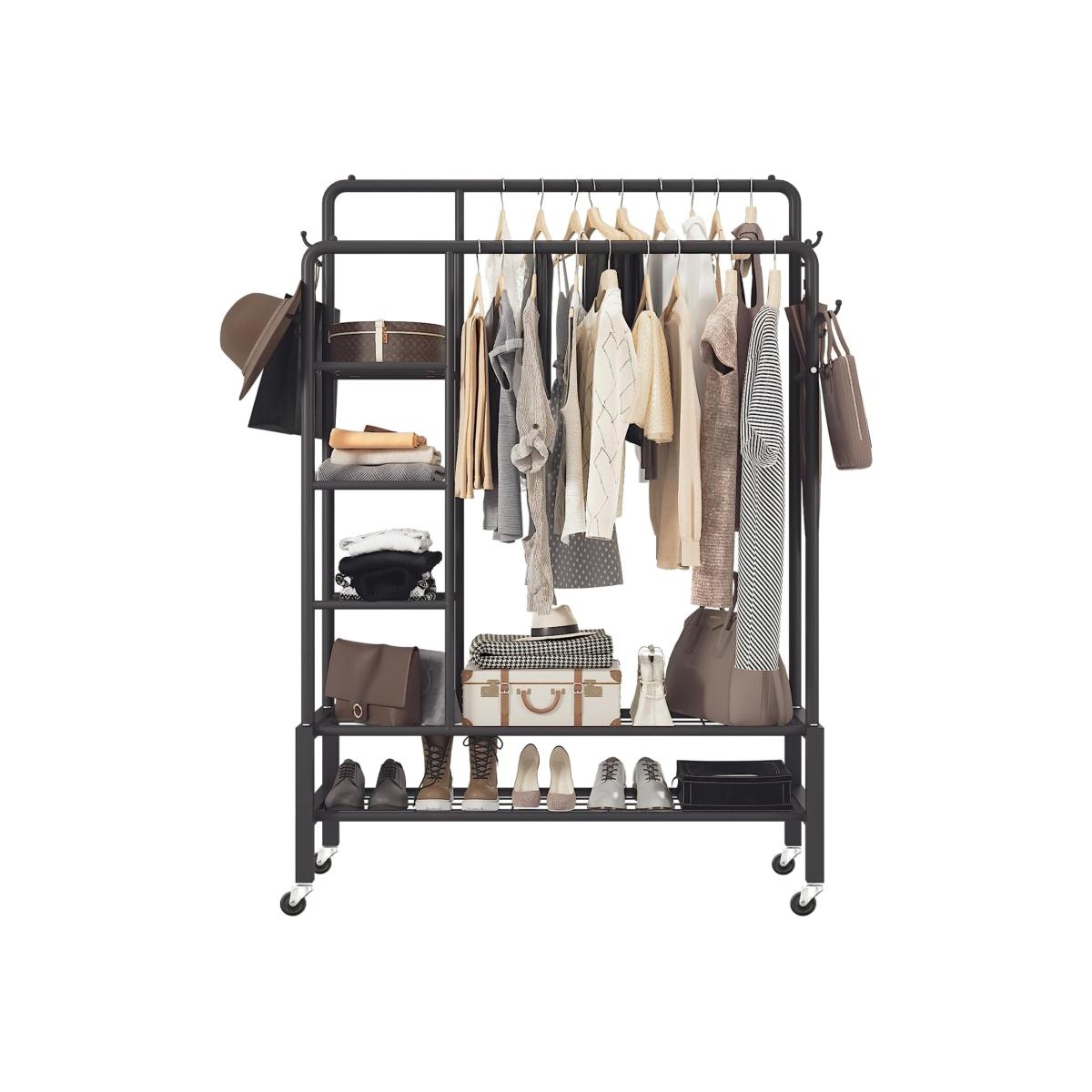 It is a solid clothes rack constructed with high-quality steel tubes for unmatched durability & stability. The 4-in-1 solution with a double clothes rail with anti-slip beads, two shoe rack shelves, four side storage shelves & four hanging hooks. Organise clothes, coats, shoes, bags & accessories effortlessly. Sleek, efficient & stylish space management. An ideal hanging rail for small spaces and temporary wardrobes. Effortlessly assemble this black clothes rail with shelves using the provided tools. It is a versatile open wardrobe clothing rack suitable for clothes rails for bedrooms, shops, and offices.