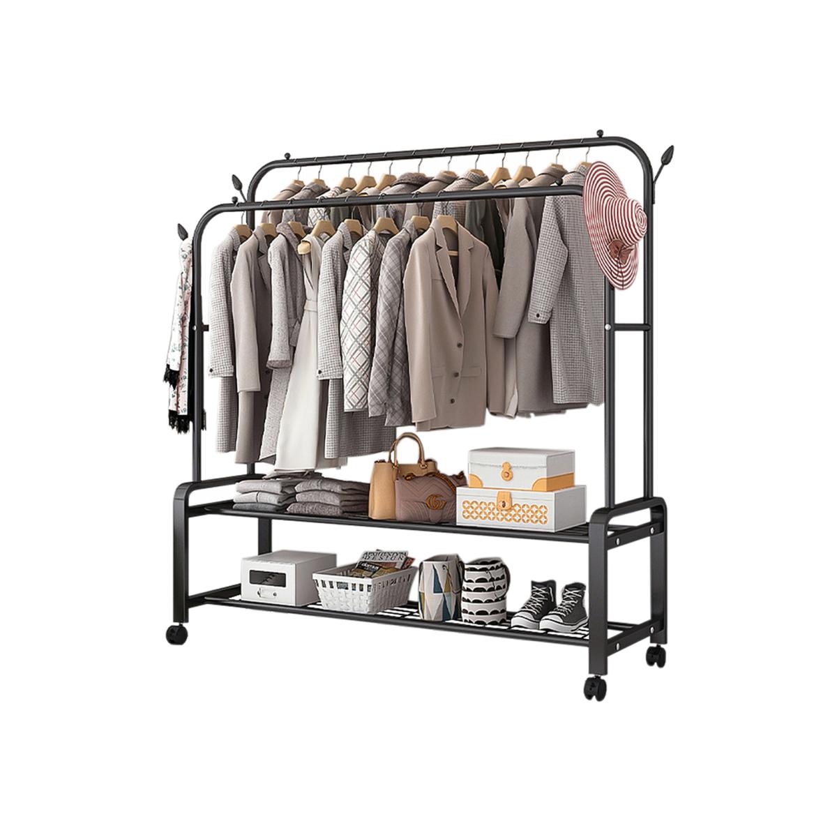 Efficiently organise your wardrobe with this double-rod clothes rack, designed to accommodate a variety of garments. Crafted from high-quality metal, it offers exceptional durability and weight capacity for long-term use. The dual-bar design provides ample hanging space, while the smooth-rolling wheels with locking mechanisms ensure easy mobility and stability. Side hooks are ideal for accessories like hats and scarves, and the two-tiered bottom shelves offer additional storage for shoes or folded clothes. Its sleek, modern design seamlessly complements any home decor.