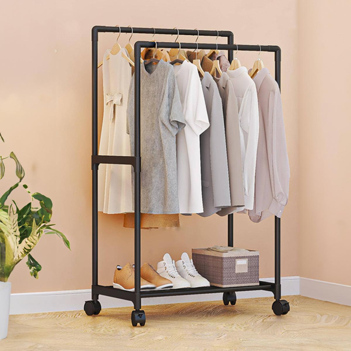 Double Rod Iron Clothes Rack on Wheels - Black / 57.5*30*115 cm