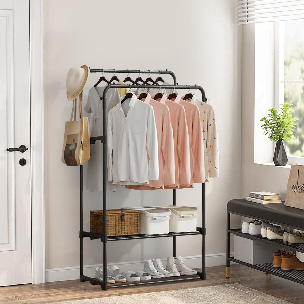 A clothes rack is essential for keeping your garments wrinkle-free, and ours offers ample storage space for suits, dresses, pants, and more. Featuring a high-low rod design, it allows you to hang garments of varying lengths with ease. Crafted from premium metal with a stable base and side bars for added support, this rack is both sturdy and durable. In short, our clothes rack provides a versatile and reliable solution to meet all your garment storage needs, ensuring your clothes remain neatly organized and ready to wear.