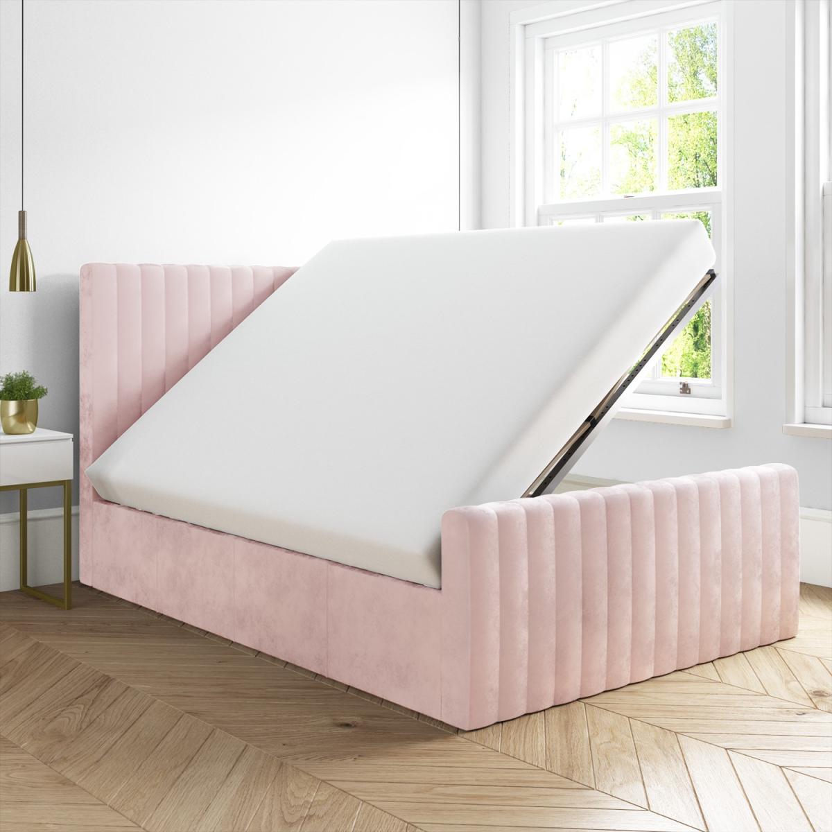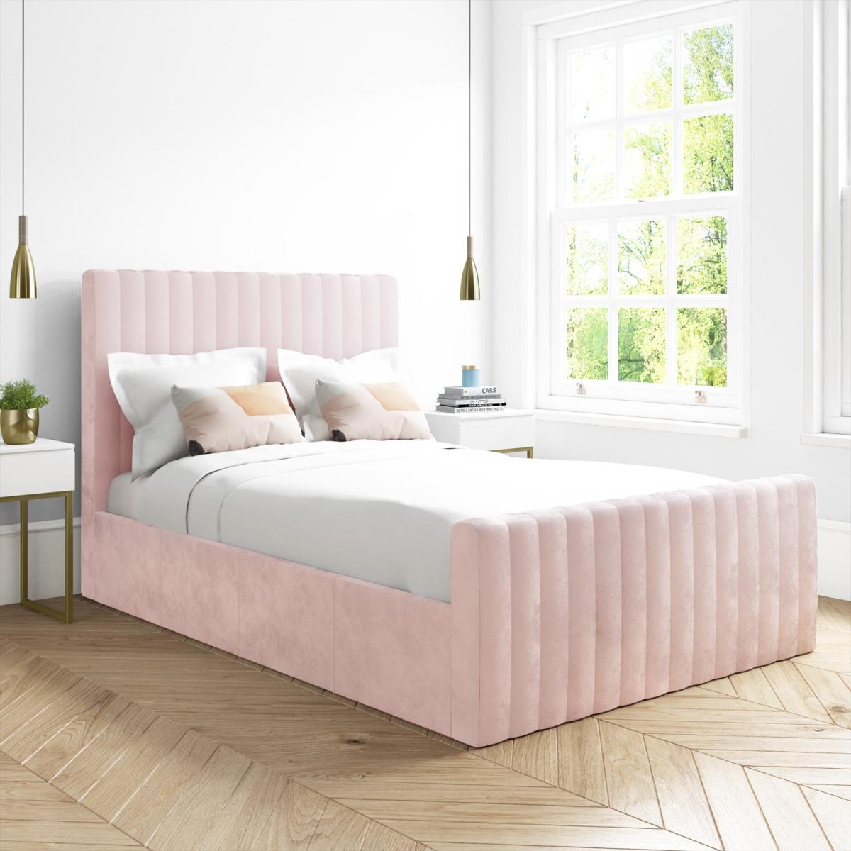 The luxuriously padded headboard, sumptuous smooth velvet and under-bed storage makes the Khloe as stylish as it is practical. The hidden storage area is ideal for keeping things like duvets, seasonal clothing and anything you like, out of the way but close to hand. It features a handy gas-lift mechanism for quick and effortless access to your stored items. Plus, it opens from the side, rather than the end, which make it easier to access all of your stored items. You can even set the storage frame to open on either the left or right-hand side, giving you that extra freedom when it comes to your bedroom layout. Upholstered in a soft blush pink velvet fabric with vertical stitch detailing, this stylish double bed exudes a timeless sophistication that's guaranteed to make an impact in your bedroom. It has a durable frame made from metal and wood, with a sprung slatted bed base for comfortable and durable mattress support. The tall, padded headboard is great for propping yourself up in bed to snuggle down with a good book or in front of the TV. It also features a fabric base to keep your stored items clean and dust-free. The bed fits a standard UK double size (4ft6) mattress. A mattress is not included, so you'll be able to pick the perfect one for you.