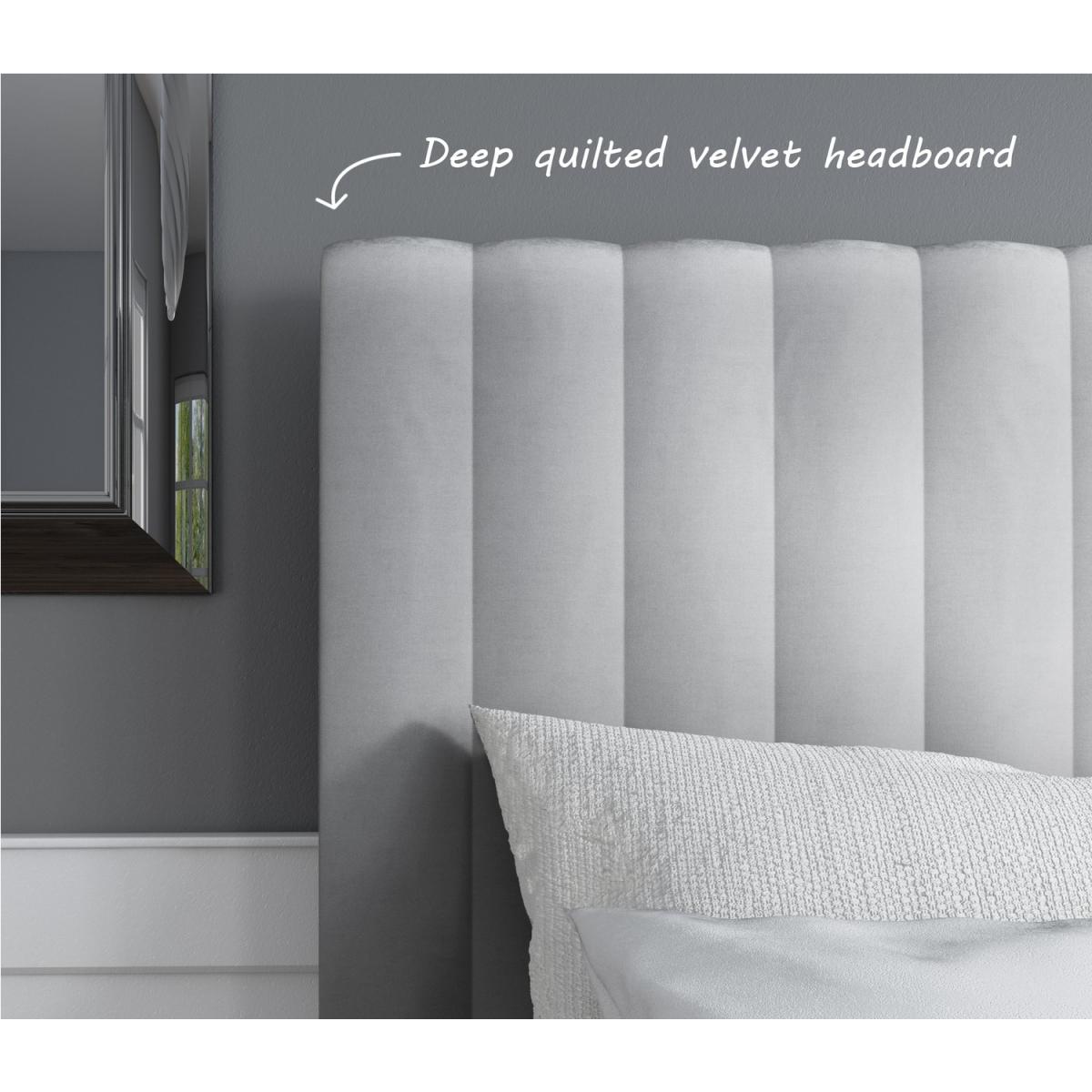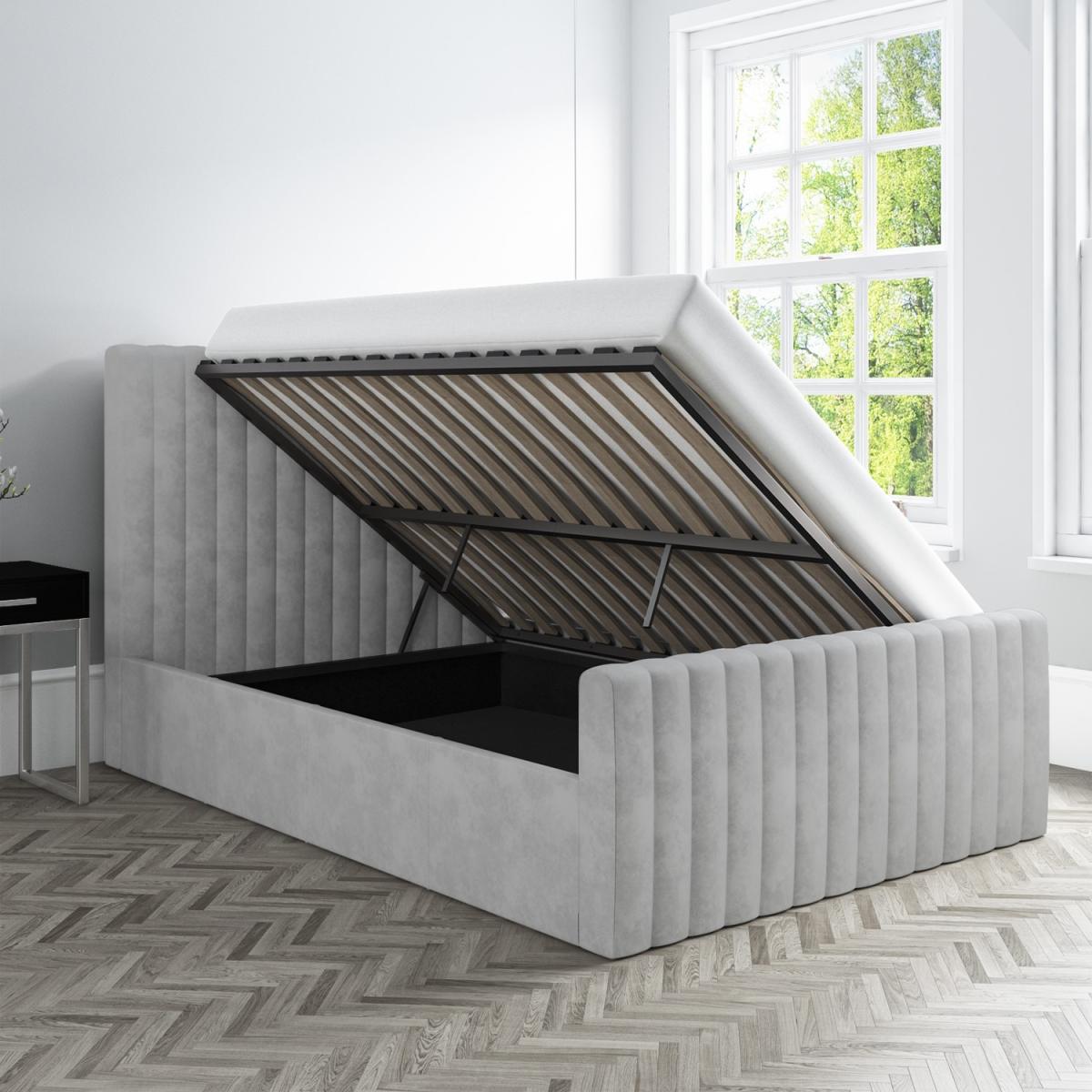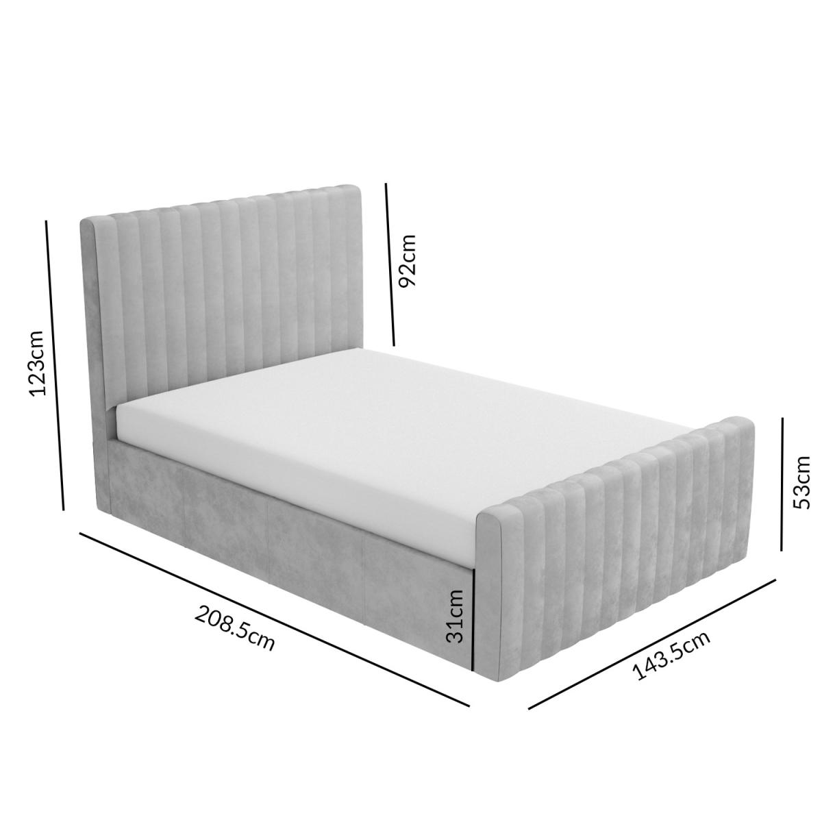 Features we love Easy access side opening storage space with gas lift mechanism. The storage frame can be set up to open from either the left or right hand side to suit your room layout Plenty of storage space the entire area beneath the mattress can be used. Its fabric base helps to protect your stored items from dust Contemporary vertical stitch detailing on the headboard and footboard creates an instant focal point in the bedroom. Upholstered in high-quality soft-touch velvet brings an elegant tone to your bedroom Sprung slatted bed base gives comfortable and durable mattress support. Grey finish makes it easy to coordinate with other bedroom furnishings and decor styles. The tall padded headboard is ideal for comfortably propping yourself up All about me. The luxuriously padded headboard sumptuous smooth velvet and under-bed storage makes the Khloe as stylish as it is practical. The hidden storage area is ideal for keeping things like duvets seasonal clothing and anything you like out of the way but close to hand. It features a handy gas-lift mechanism for quick and effortless access to your stored items. Plus it opens from the side rather than the end which make it easier to access all of your stored items. You can even set the storage frame to open on either the left or right-hand side giving you that extra freedom when it comes to your bedroom layout. Upholstered in a grey velvet fabric with vertical stitch detailing this stylish double bed exudes a timeless sophistication that's guaranteed to make an impact in your bedroom. It has a durable frame made from metal and wood with a sprung slatted bed base for comfortable and durable mattress support. The tall padded headboard is great for propping yourself up in bed to snuggle down with a good book or in front of the TV. It also features a fabric base to keep your stored items clean and dust-free. The bed fits a standard UK double size (4ft6) mattress. A mattress is not included so you'll be able to pick the perfect one for you. Need to know. Size. Standard UK Double (4ft6) Dimensions. W143.5 x D208.5 x H123 cm Storage Dimensions. W138.5 x D193 x H22.5 cm Material. Metal and; wood frame Finish. Upholstered grey velvet Base. Sprung slatted Maximum weight limit. 300kg More info Full ottoman base for extra and discreet bedroom storage Gas lift mechanism gives easy access to storage space. The storage frame can be fitted to open on either the left or right-hand side. Durable wood and metal frame with an upholstered grey velvet finish. Sprung splatted bed base for comfortable and durable mattress support. The fabric base helps protect your items from getting dusty. A mattress is not included with this bed. Fits a standard UK double size mattress (4ft6)Also available as a king size.