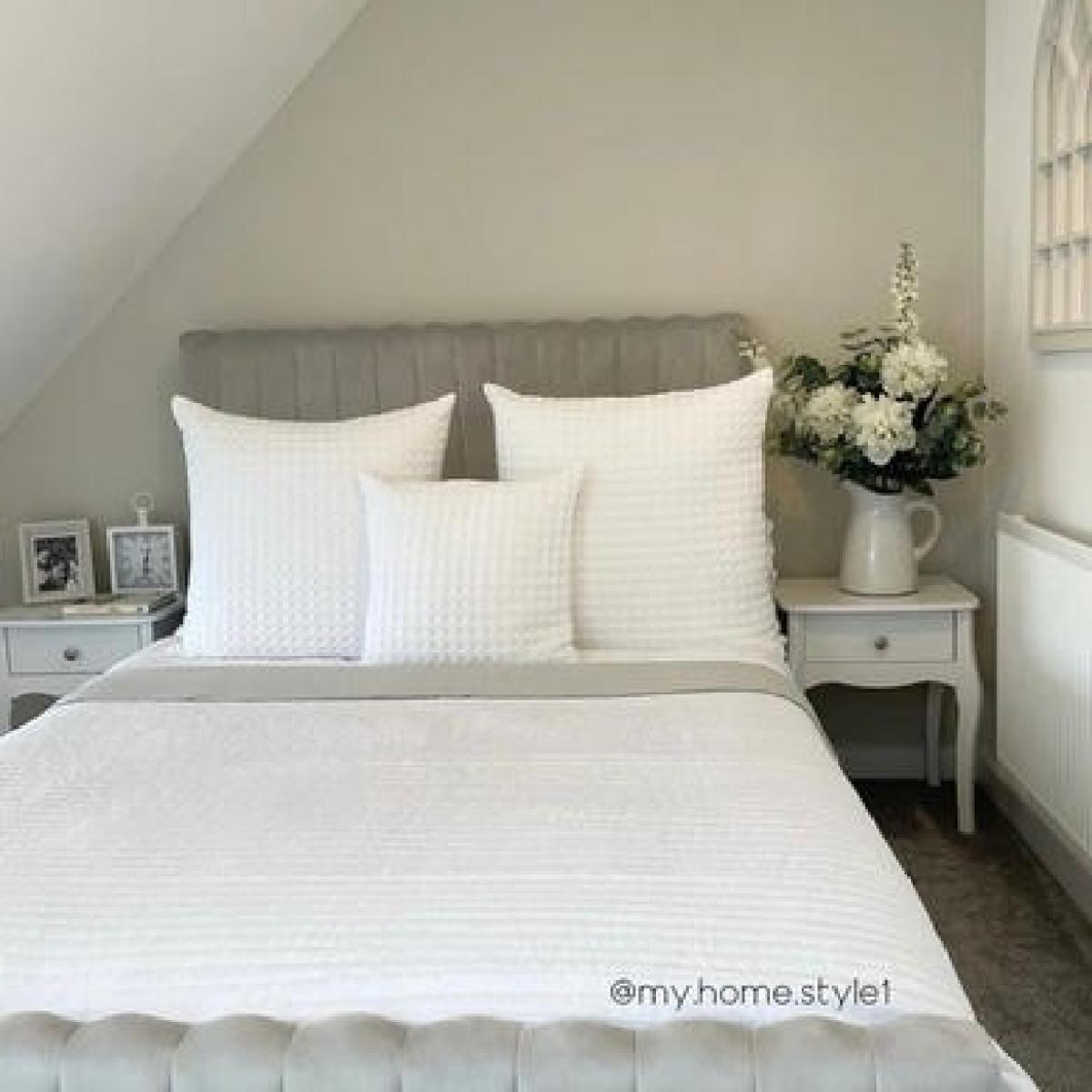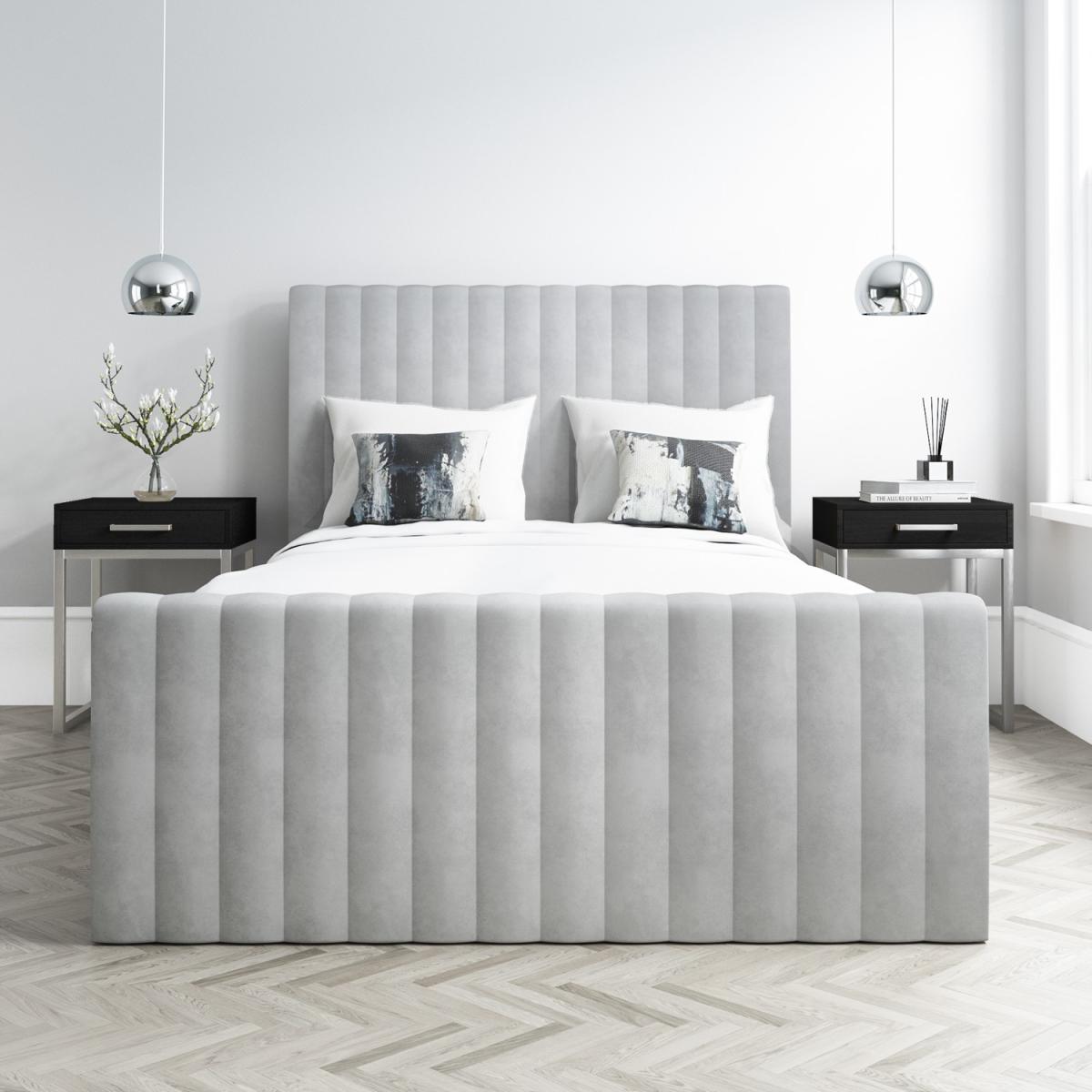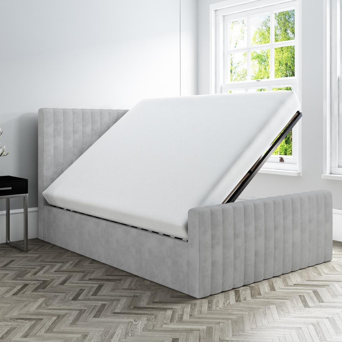 Features we love Easy access side opening storage space with gas lift mechanism. The storage frame can be set up to open from either the left or right hand side to suit your room layout Plenty of storage space the entire area beneath the mattress can be used. Its fabric base helps to protect your stored items from dust Contemporary vertical stitch detailing on the headboard and footboard creates an instant focal point in the bedroom. Upholstered in high-quality soft-touch velvet brings an elegant tone to your bedroom Sprung slatted bed base gives comfortable and durable mattress support. Grey finish makes it easy to coordinate with other bedroom furnishings and decor styles. The tall padded headboard is ideal for comfortably propping yourself up All about me. The luxuriously padded headboard sumptuous smooth velvet and under-bed storage makes the Khloe as stylish as it is practical. The hidden storage area is ideal for keeping things like duvets seasonal clothing and anything you like out of the way but close to hand. It features a handy gas-lift mechanism for quick and effortless access to your stored items. Plus it opens from the side rather than the end which make it easier to access all of your stored items. You can even set the storage frame to open on either the left or right-hand side giving you that extra freedom when it comes to your bedroom layout. Upholstered in a grey velvet fabric with vertical stitch detailing this stylish double bed exudes a timeless sophistication that's guaranteed to make an impact in your bedroom. It has a durable frame made from metal and wood with a sprung slatted bed base for comfortable and durable mattress support. The tall padded headboard is great for propping yourself up in bed to snuggle down with a good book or in front of the TV. It also features a fabric base to keep your stored items clean and dust-free. The bed fits a standard UK double size (4ft6) mattress. A mattress is not included so you'll be able to pick the perfect one for you. Need to know. Size. Standard UK Double (4ft6) Dimensions. W143.5 x D208.5 x H123 cm Storage Dimensions. W138.5 x D193 x H22.5 cm Material. Metal and; wood frame Finish. Upholstered grey velvet Base. Sprung slatted Maximum weight limit. 300kg More info Full ottoman base for extra and discreet bedroom storage Gas lift mechanism gives easy access to storage space. The storage frame can be fitted to open on either the left or right-hand side. Durable wood and metal frame with an upholstered grey velvet finish. Sprung splatted bed base for comfortable and durable mattress support. The fabric base helps protect your items from getting dusty. A mattress is not included with this bed. Fits a standard UK double size mattress (4ft6)Also available as a king size.