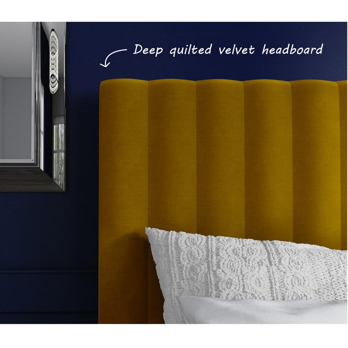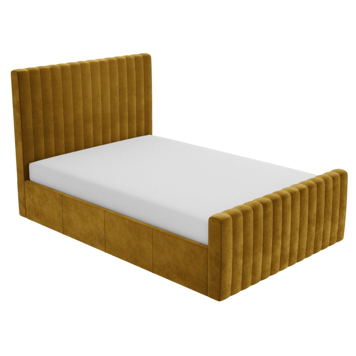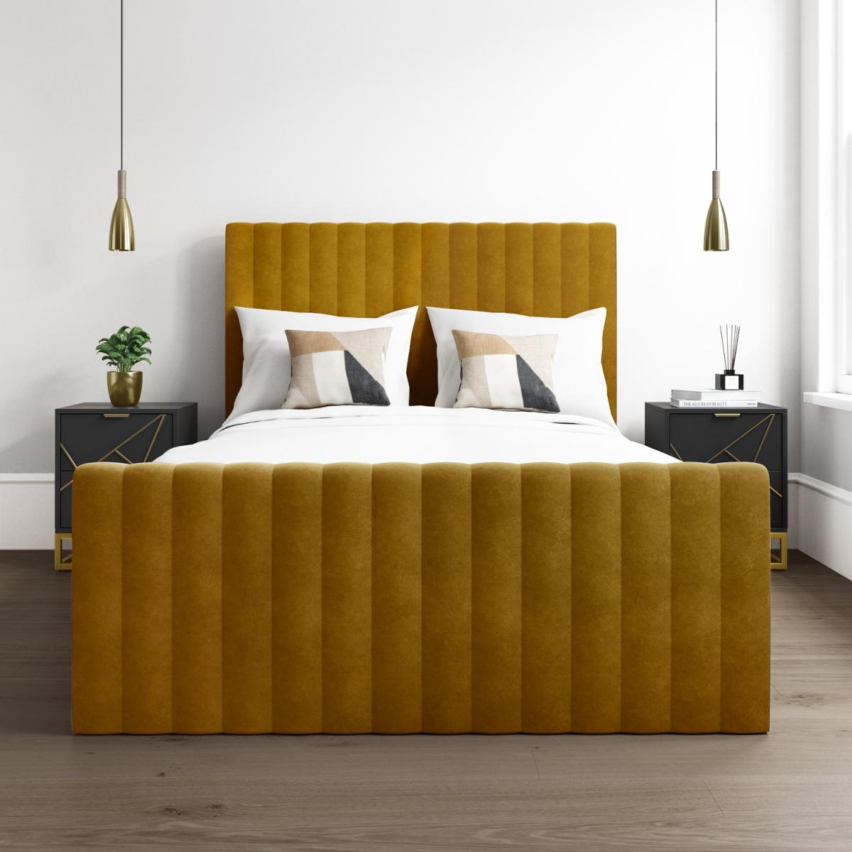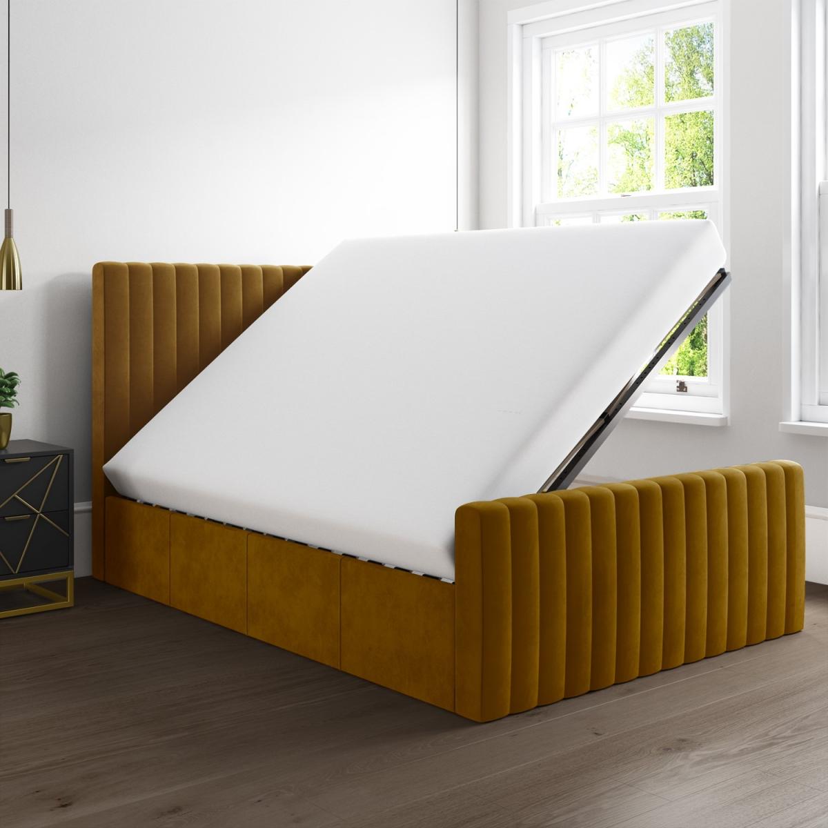 Features we love Easy access side opening storage space with gas lift mechanism. The storage frame can be set up to open from either the left or right hand side to suit your room layout Plenty of storage space the entire area beneath the mattress can be used. Its fabric base helps to protect your stored items from dust Contemporary vertical stitch detailing on the headboard and footboard creates an instant focal point in the bedroom. Upholstered in high-quality soft-touch velvet brings an elegant tone to your bedroom Sprung slatted bed base gives comfortable and durable mattress support. Mustard yellow velvet finish makes a style statement in any bedroom. The tall padded headboard is ideal for comfortably propping yourself up All about me. The luxuriously padded headboard sumptuous smooth velvet and under-bed storage makes the Khloe as stylish as it is practical. The hidden storage area is ideal for keeping things like duvets seasonal clothing and anything you like out of the way but close to hand. It features a handy gas-lift mechanism for quick and effortless access to your stored items. Plus it opens from the side rather than the end which make it easier to access all of your stored items. You can even set the storage frame to open on either the left or right-hand side giving you that extra freedom when it comes to your bedroom layout. Upholstered in a rich mustard velvet fabric with vertical stitch detailing this stylish double bed exudes a timeless sophistication that's guaranteed to make an impact in your bedroom. It has a durable frame made from metal and wood with a sprung slatted bed base for comfortable and durable mattress support. The tall padded headboard is great for propping yourself up in bed to snuggle down with a good book or in front of the TV. It also features a fabric base to keep your stored items clean and dust-free. The bed fits a standard UK double size (4ft6) mattress. A mattress is not included so you'll be able to pick the perfect one for you. Need to know Size. Standard UK Double (4ft6) Dimensions. W143.5 x D208.5 x H123 cm Storage Dimensions. W138.5 x D193 x H22.5 cm Material. Metal and; wood frame Finish. Upholstered in mustard yellow velvet Base. Sprung slatted Max weight limit. 300kg More info Full ottoman base for extra and discreet bedroom storage Gas lift mechanism gives easy access to storage space. The storage frame can be fitted to open on either the left or right-hand side. Durable wood and metal frame with an upholstered mustard yellow finish. Sprung splatted bed base for comfortable and durable mattress support. The fabric base helps protect your items from getting dusty. A mattress is not included with this bed. Fits a standard UK double size mattress (4ft6)Also available as a king size.