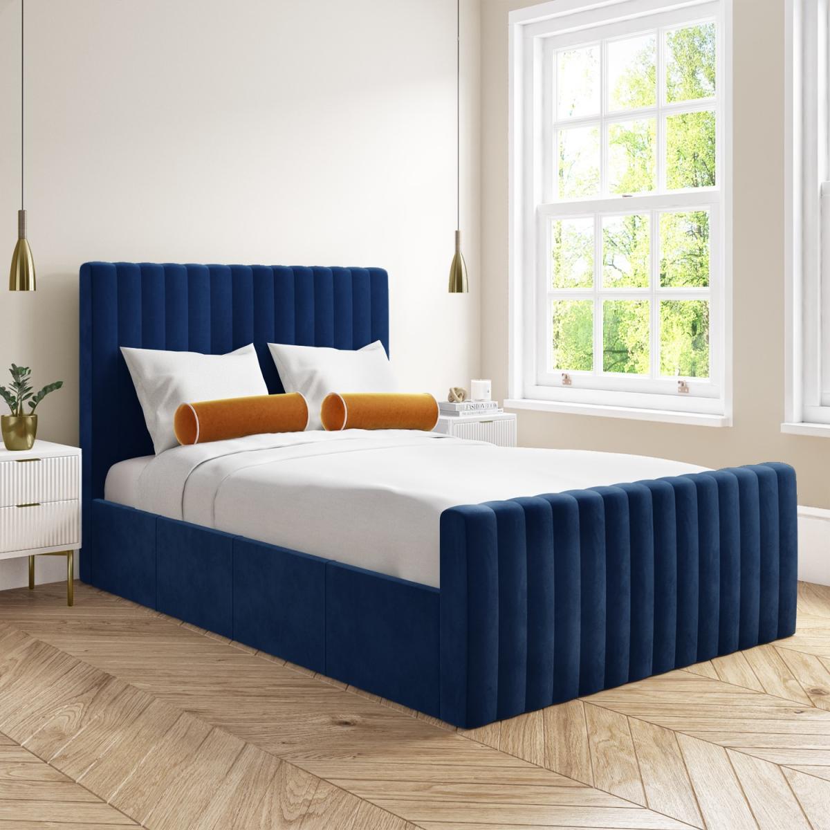 Features we love Easy access side opening storage space with gas lift mechanism. The storage frame can be set up to open from either the left or right hand side to suit your room layout Plenty of storage space the entire area beneath the mattress can be used. Its fabric base helps to protect your stored items from dust Contemporary vertical stitch detailing on the headboard and footboard creates an instant focal point in the bedroom. Upholstered in high-quality soft-touch velvet brings an elegant tone to your bedroom Sprung slatted bed base gives comfortable and durable mattress support. Navy blue finish makes it easy to coordinate with other bedroom furnishings and decor styles. The tall padded headboard is ideal for comfortably propping yourself up All about me. The luxuriously padded headboard sumptuous smooth velvet and under-bed storage makes the Khloe as stylish as it is practical. The hidden storage area is ideal for keeping things like duvets seasonal clothing and anything you like out of the way but close to hand. It features a handy gas-lift mechanism for quick and effortless access to your stored items. Plus it opens from the side rather than the end which make it easier to access all of your stored items. You can even set the storage frame to open on either the left or right-hand side giving you that extra freedom when it comes to your bedroom layout. Upholstered in a navy blue velvet fabric with vertical stitch detailing this stylish double bed exudes a timeless sophistication that's guaranteed to make an impact in your bedroom. It has a durable frame made from metal and wood with a sprung slatted bed base for comfortable and durable mattress support. The tall padded headboard is great for propping yourself up in bed to snuggle down with a good book or in front of the TV. It also features a fabric base to keep your stored items clean and dust-free. The bed fits a standard UK double size (4ft6) mattress. A mattress is not included so you'll be able to pick the perfect one for you. Need to know Size. Standard UK Double (4ft6) Dimensions. W143.5 x D208.5 x H123 cm Storage Dimensions. W138.5 x D193 x H22.5 cm Material. Metal and; wood frame Finish. Upholstered Navy blue velvet Base. Sprung slatted Max weight limit. 300kg More info Full ottoman base for extra and discreet bedroom storage Gas lift mechanism gives easy access to storage space. The storage frame can be fitted to open on either the left or right-hand side. Durable wood and metal frame with an upholstered navy velvet finish. Sprung splatted bed base for comfortable and durable mattress support. The fabric base helps protect your items from getting dusty. A mattress is not included with this bed. Fits a standard UK double size mattress (4ft6)Also available as a king size.