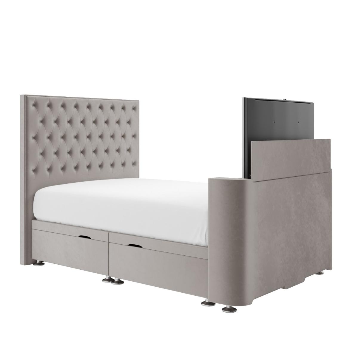 Transform your bedroom into your own private cinema with the Avery TV bed. The padded Chesterfield headboard and sumptuous velvet upholstery create the perfect place to relax and watch your favourite films and shows. The ottoman feature is great for keeping your bedroom clutter-free, and it can be assembled to lift on either side to suit your bedroom layout. Install your TV of choice to the bracket, press the button on the handy remote and watch it rise from the footend.