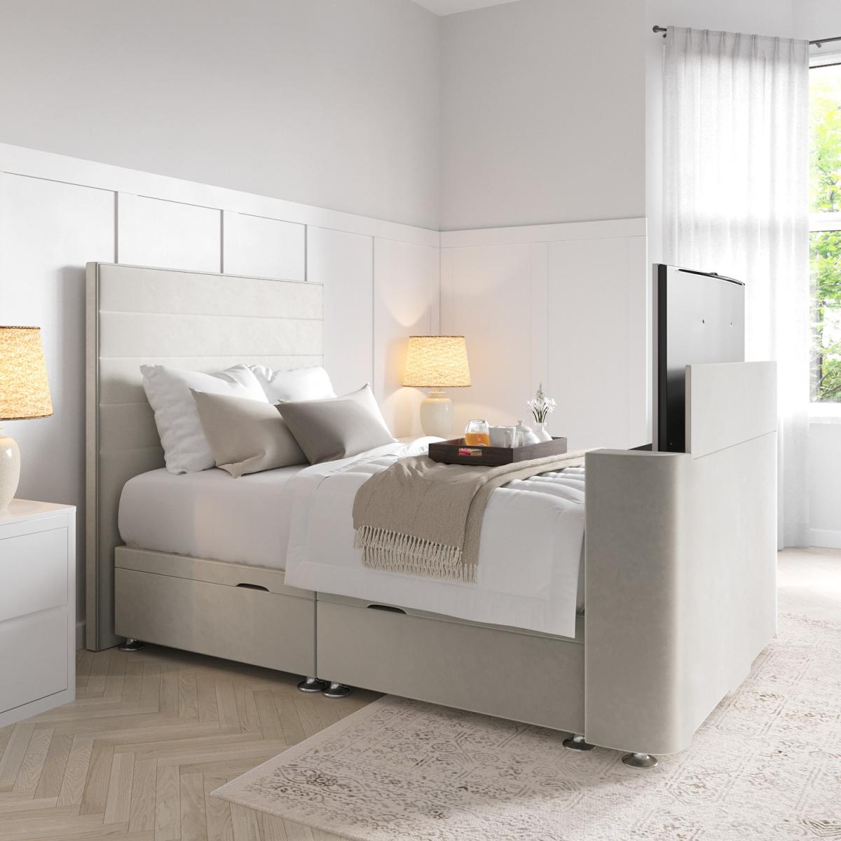 Transform your bedroom into your own private cinema with the Eden TV bed. The padded stripe headboard and sumptuous velvet upholstery create the perfect place to relax and watch your favourite films and TV shows. The ottoman feature is great for keeping your bedroom clutter-free, and it can be assembled to lift on either side to suit your bedroom layout. Install your TV of choice to the bracket, press the button on the handy remote and watch it rise from the footend.