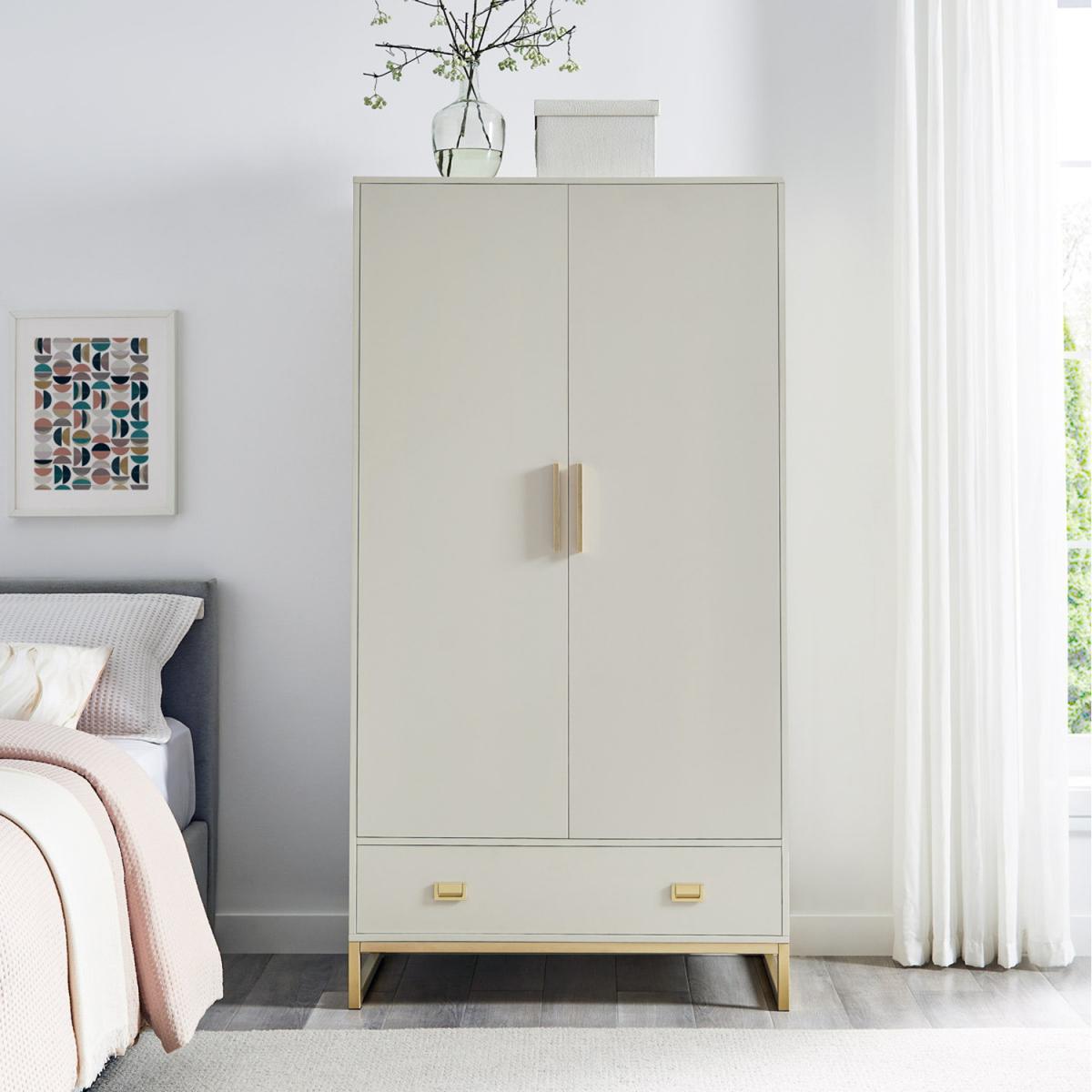 Discover the elegance of our contemporary Elle Stone Double Wardrobe-a harmonious blend of modern design and functionality. Crafted to perfection, its sophisticated stone taupe shade brings a touch of understated luxury to any bedroom. Not just a visual delight, this wardrobe is meticulously designed with ample storage space to keep your outfits organized and easily accessible. Beneath the spacious double doors, you'll find a roomy interior that accommodates everything from your seasonal attire to those special occasion garments. But the true highlight lies in the details. Adorned with gold-coloured handles, this wardrobe seamlessly merges chic aesthetics with practicality. Adding to its versatility, a convenient drawer sits beneath the main compartment. Ideal for stowing away accessories or linens, this drawer glides effortlessly, reflecting the wardrobe's commitment to quality. And the gold doesn't stop at the handles-the wardrobe stands tall on sleek, gold-coloured legs, lending it a distinctive, elevated stance.