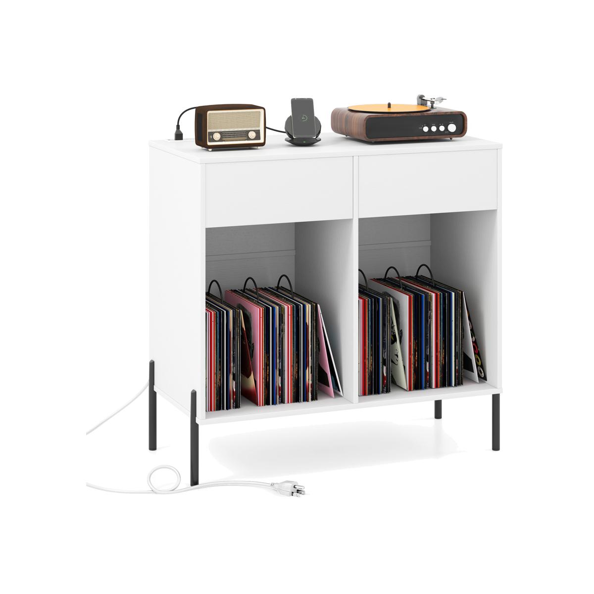 Elevate your audio experience with this record player stand! The convenient charging station allows you to charge multiple devices simultaneously. No more struggling with messy wires! There is a cable hole to maintain a neat appearance. In addition to its spacious top, the record player stand is designed with 2 drawers for storing media items. The open compartments feature removable dividers to suit different needs, providing flexible storage solutions for your vinyl records.