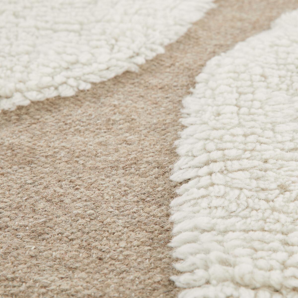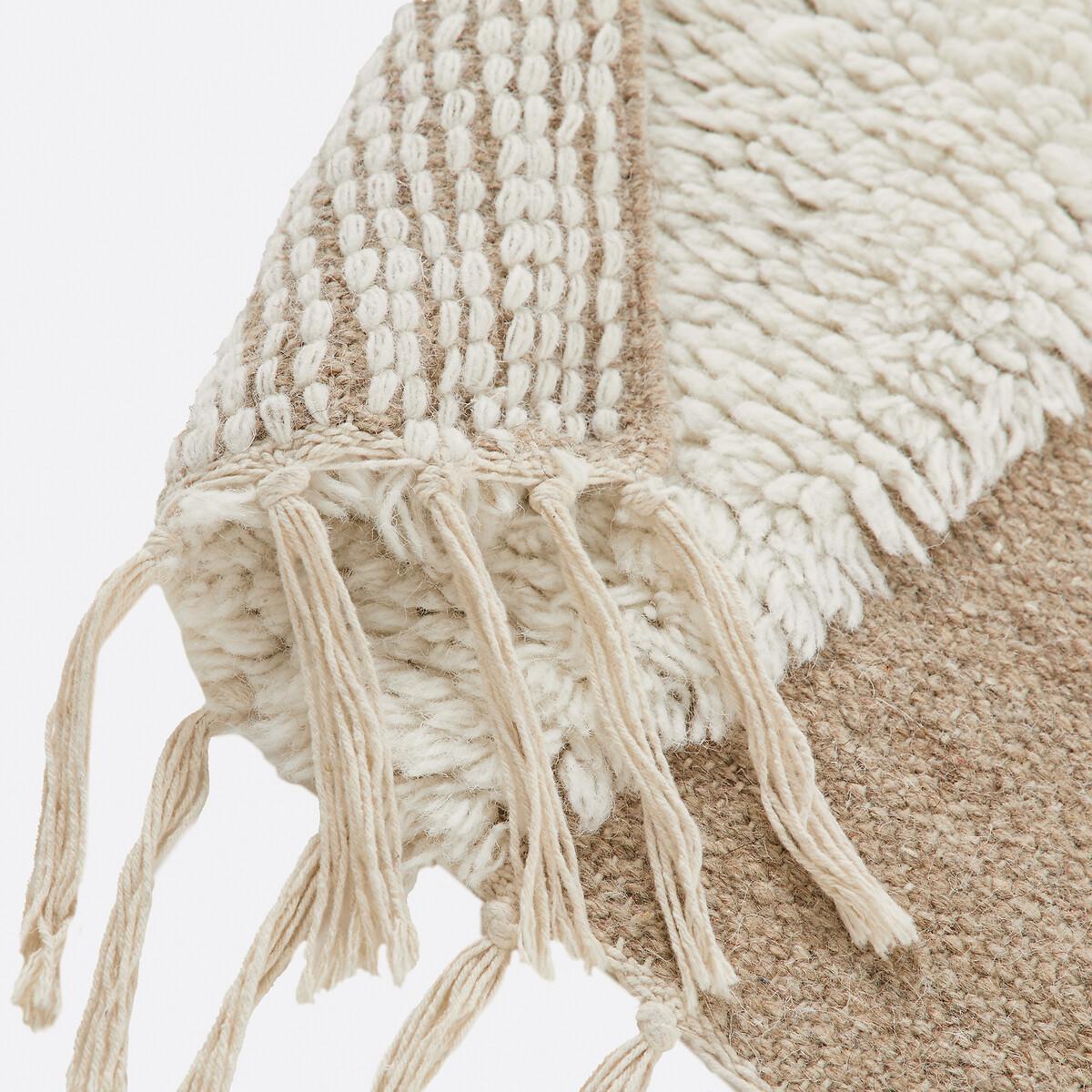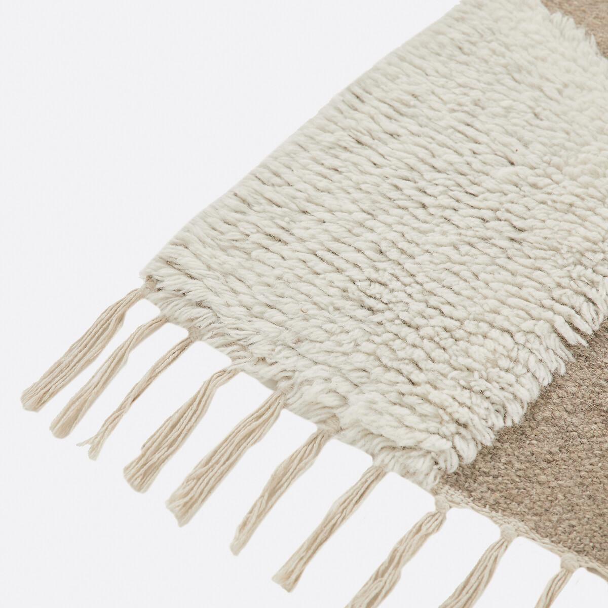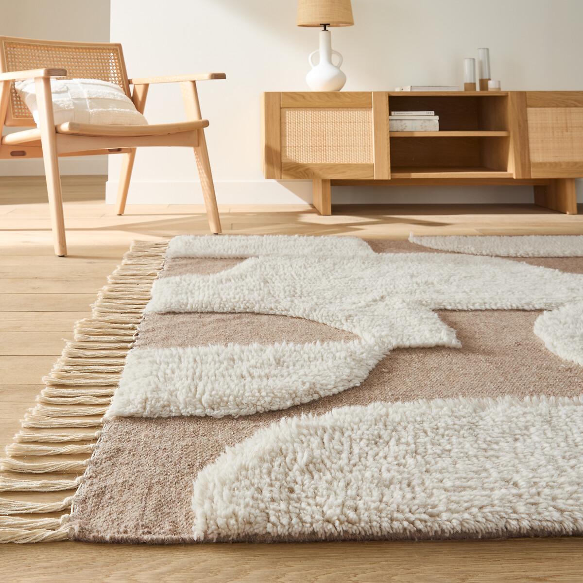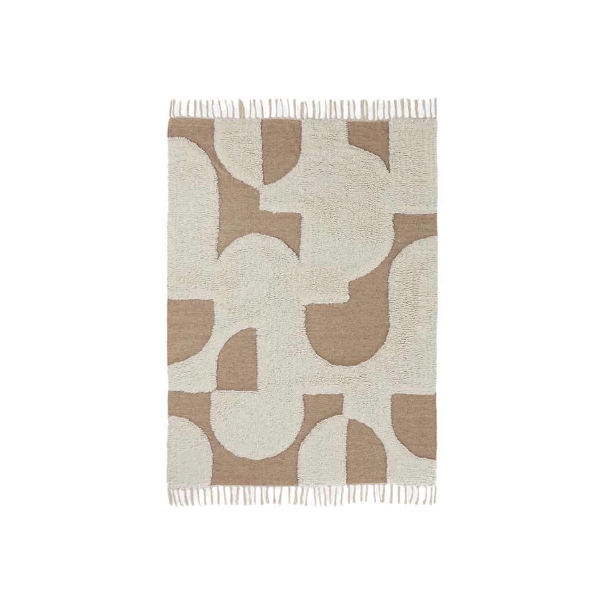 A combination of abstract prints and neutral tones : Hand-woven in wool and cotton, the Douma rug is an exceptional addition to any interior. And gives it warmth, elegance and character. Product Details • 90% wool, 10% cotton • 1650g/m2 • Thickness: 1.2cm • Fringed edging • Weaving type: Handmade • Underfloor heating compatible: No • Interior Use: Yes • For outdoor use: No • Artisanal craftsmanship. Quality Info • Wool is a warm and comfortable fibre. A wool rug is also an excellent thermal and sound insulator. • Hand-braided, each piece is unique and may have small irregularities which make it authentic.. Colours and dimensions may vary slightly. Care advice • Once unrolled, you must wait a few days for the carpet to return to its initial shape.. • To keep the edges flat, roll your mat in the opposite direction. Leave it like this for an hour, then turm it over and place a heavy object on it for 2 hours. • New, the carpet may give off an odour which dissipates over time. Remember to regularly ventilate your room to reduce it. • To preserve its appearance, rotate your rug regularly in one direction or the other to minimise localised wear in the same places (due to successive passages), and loss of colour due to regular light. Care Advice • Some materials are very fibrous (like wool) and you can actually observe pilling in the first weeks of use. : this is normal because the carpet "bursts" by rejecting its excess fibres. Remove lint as much as possible by hand and do not use the vacuum cleaner in brushing mode as this will pull the fibres and tear them out.. The pilling will improve over time. • For maintenance, we advise you to vacuum it very little the first month and then to vacuum it without rubbing too much always without using the brush. • Compatible with robot vacuum cleaners: No • Remove stains immediately with a clean, damp cloth. • Dry clean recommended. Dimensions • Width 120 x Length 170cm • Width 160 x Length 230cm • Width 200 x Length 290cm • OEKO-TEX® Standard 100. Standard 100 certification by OEKO-TEX® tests textile products for harmful substances via an independent, international label.