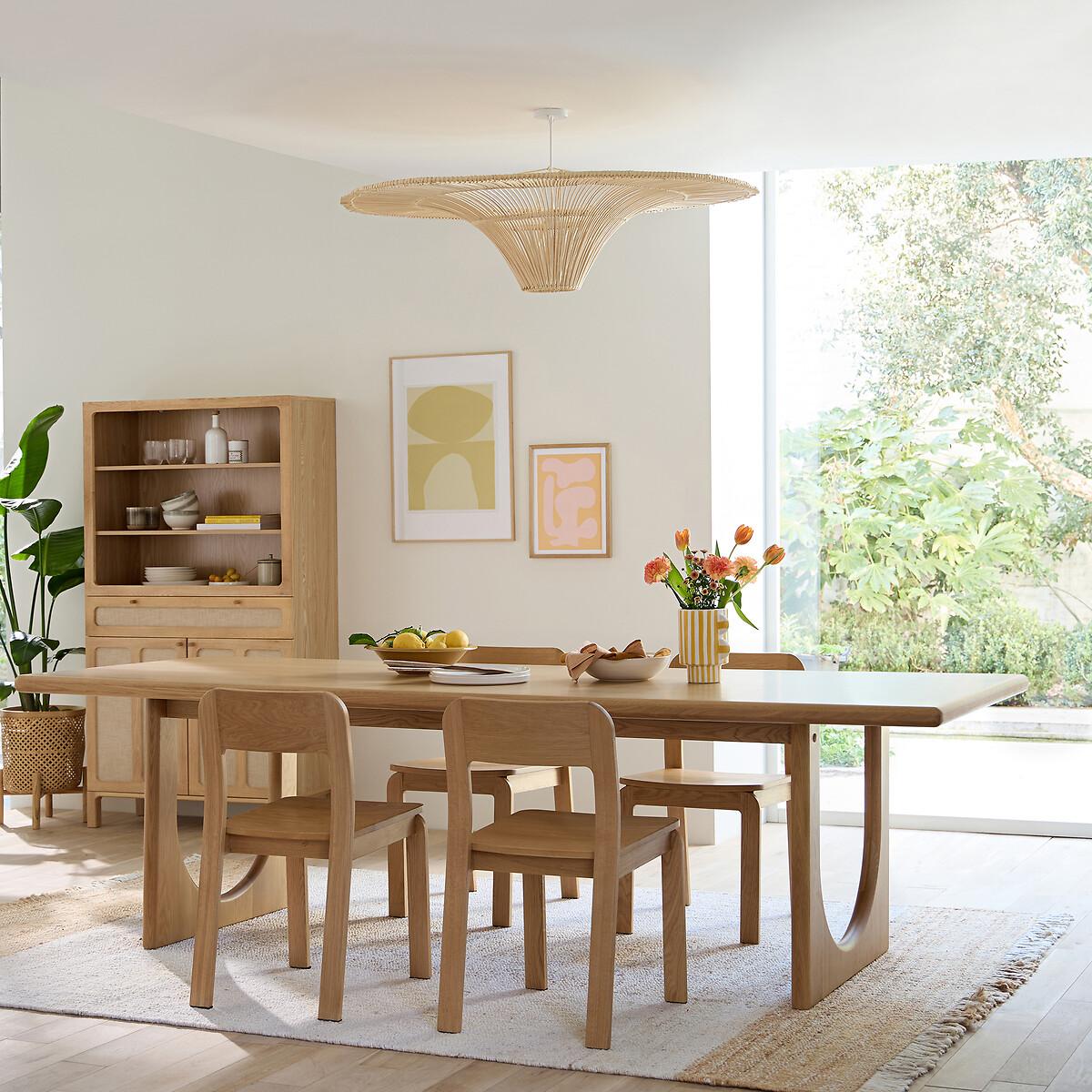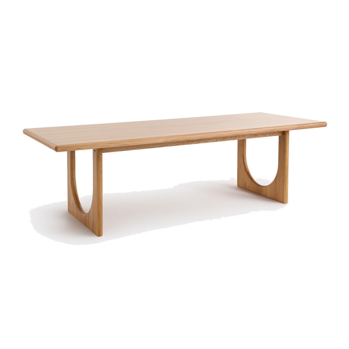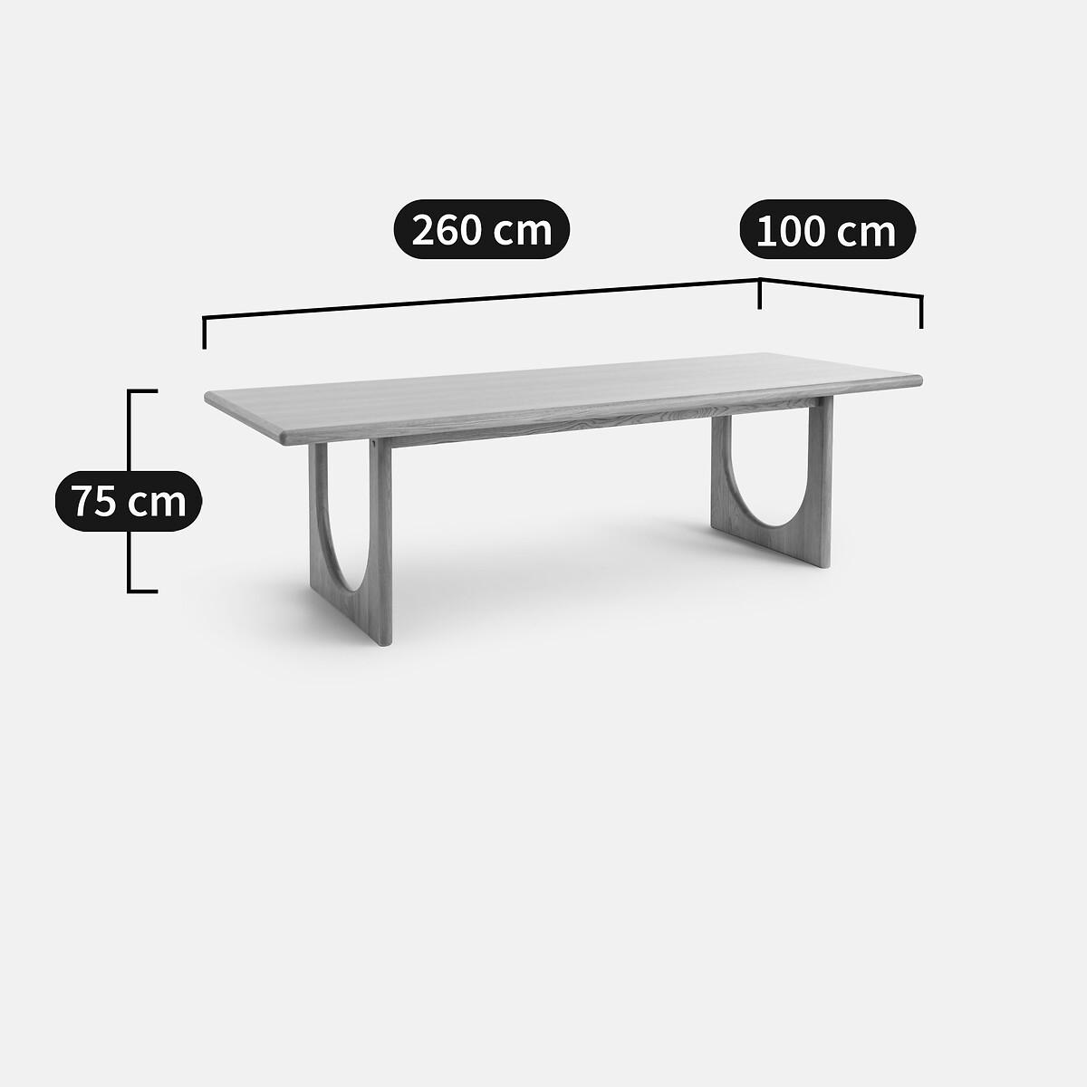 The Douve Table is part of the La Redoute Signatures Collection. A selection of exclusive creations, designed by our in-house design studio. Inspiring, easy to live with, trendy. These products have become our customers' favourites. and no doubt yours!. An internal design by Adrien Edel : "By creating Douve, I wanted to reinterpret the traditional abbey table. It stands out for its contemporary style and sculptural design. FSC® certified solid oak, thick top with rounded edges and inverted arch base: all the beauty of woodwork. "Product Details • Base and top frame in solid oak, top in oak veneered particle board, FSC® certified wood • Top thickness 5cm • Finish: polyurethane varnish • Height-adjustable feet, invisible mechanism • Up to 10 place settings • People required for assembly: 2. Use guidance • To protect your table, consider trivets, coasters and placemats. Dimensions. Overall • Width: 260cm • Height: 75cm • Depth: 100cm • Weight: 78kg. Usable space • Length between legs: 180cm • Length between legs and table end : 35cmDelivery:. Assembly required. Available for home delivery. Note! Please check that all access points are large enough to accommodate your delivery (doors, stairs, lifts). • WOOD FROM SUSTAINABLY MANAGED FORESTS. FSC® certified wood comes from forests that are environmentally, socially and economically well managed. Dimensions and weight of parcel • 2 parcels • W91 x H21 x D84 cm, 29 kg • W270 x H11 x D110 cm, 60 kg