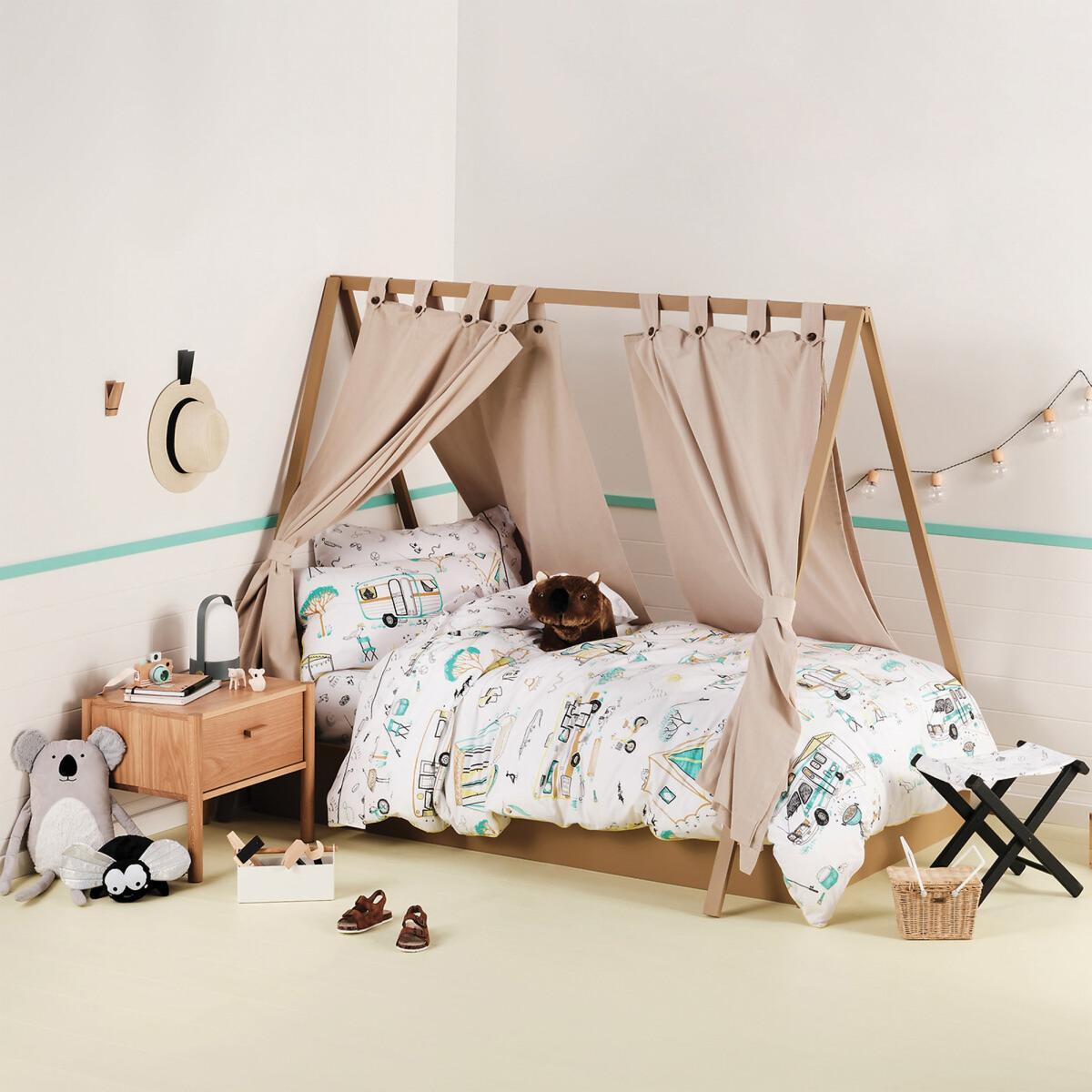 Pack your tent, sleeping bag, bike and marshmallows – we’re going camping! A campsite scene, Down By The River includes beautiful Australian wildlife, all hand-drawn and printed on a crisp white cotton percale ground. Trimmed with fluorescent-yellow cord piping, the set reverses to a black and white print of fishing rods, cricket bats, flash lights and more go-to essentials. Composition: 100% Cotton. This product will be dispatched by one of our trusted suppliers. You’ll be contacted by their selected courier about your delivery.