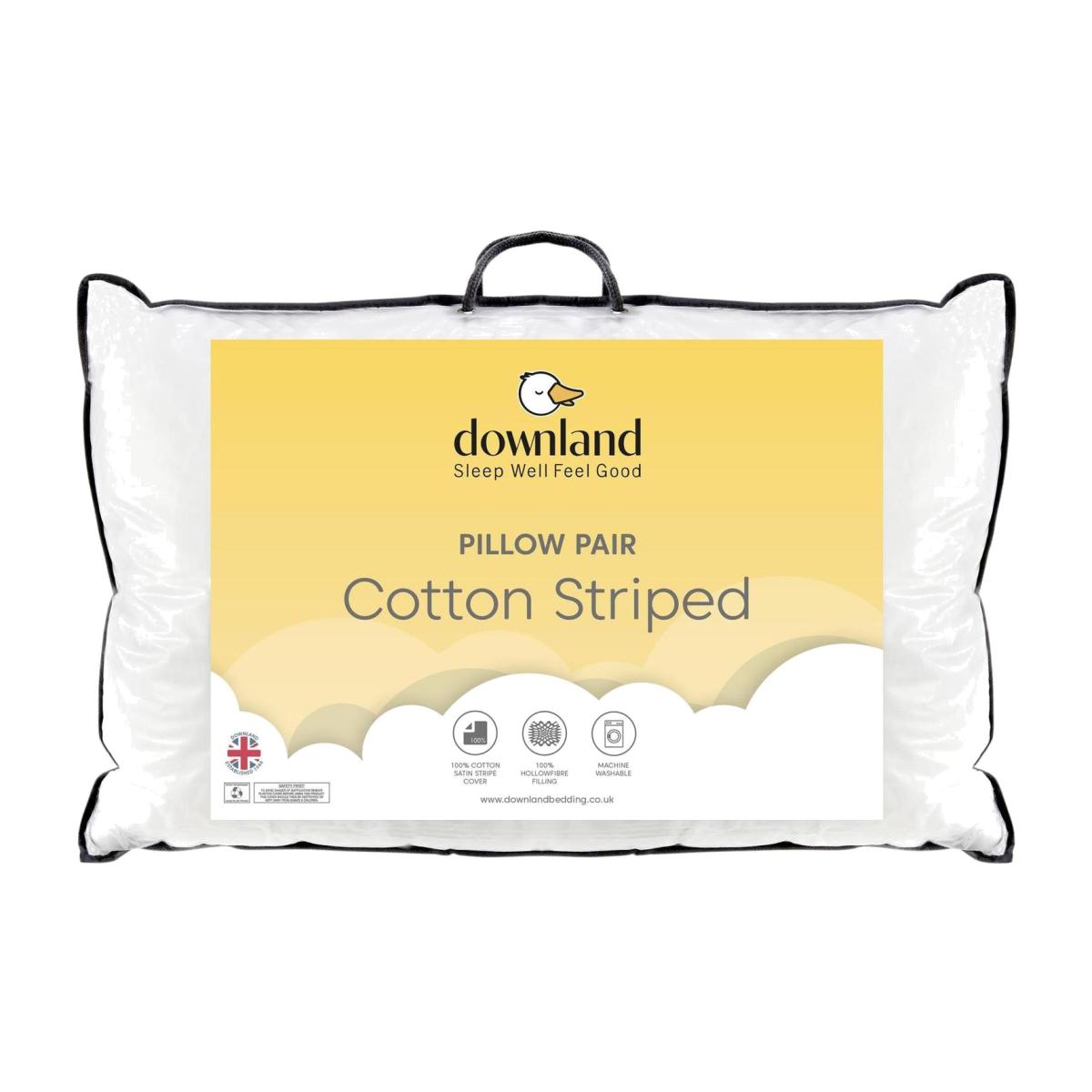 Downland's luxurious Cotton Striped pillows are made with a 100% Cotton Satin Stripe Cover, elegantly blending design and comfort. It's cotton cover and hollowfibre filling makes the pillow a great choice for all year round. The hollowfibre filling also makes Downland's 100% cotton pillow an excellent choice for those looking for luxury without the price tag of natural fillings or suffer from a feather allergy. Pack quantity: 2. Cover made from 100% cotton percale. Filling made from 100% hollowfibre polyester. Ethically sourced and RDS approved. Firm pillow. Suitable for side sleepers. Size L74, W48cm. 0.82kg. Machine washable at 40 C. Suitable for tumble drying. Non-allergenic. Manufacturer's 1 year guarantee.