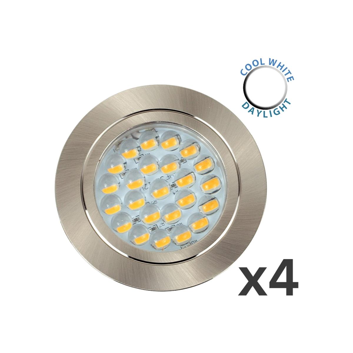 Pack of 4 modern LED caravan boat downlights in a brushed chrome finish. These sleek and stylish lights feature 24 SMD LED chips and give off a cool white light (6000. K). They are supplied with 300mm of fixed cable and 3m of extension cable. Suitable for use with 12V circuits. Please note these lights must NOT be connect to 240V supply.