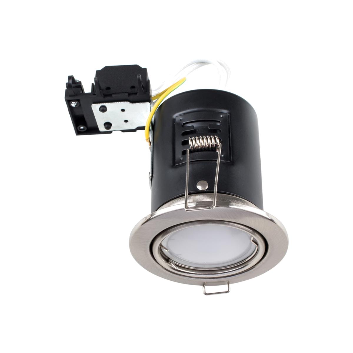 Modern brushed chrome GU10 fire rated tiltable downlight. Simply change the light direction to your preferred position. Features 90 minute fire rating and comes complete with terminal block and pre-fitted spring clips. Supplied with product guidelines and full fitting instructions. No transformer required. 1 x 50w GU10 Halogen Bulb Is Required - Not Supplied. Note This Fire Rated Downlight is NOT suitable for use with I-joists (engineered timber joists), please check the material of your joists before purchase.