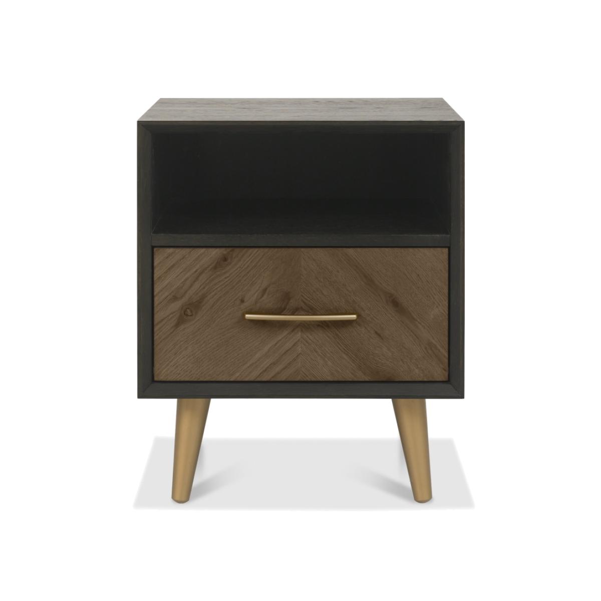 Fusing mid-century and contemporary styling, the Sienna bedroom range features chevron patterned rustic oak veneer headboards, drawer fronts and doors, in a stunning fumed oak finish. Wire-brushed oak veneers frame each piece in a dark peppercorn stain that is also reflected in the colour of the cabinet interiors and bedstead. Contrasting satin brass handles and conical-shaped legs add a glamorous touch to the collection, which is further accentuated with design choices like the mitred and bevelled frames, and soft-close drawer runners. All screens vary in colour reproduction and whilst every effort has been made to display the colour as accurately as possible it is for guidance only. Dimensions Height: 56cm Width: 46cm Depth: 43cm