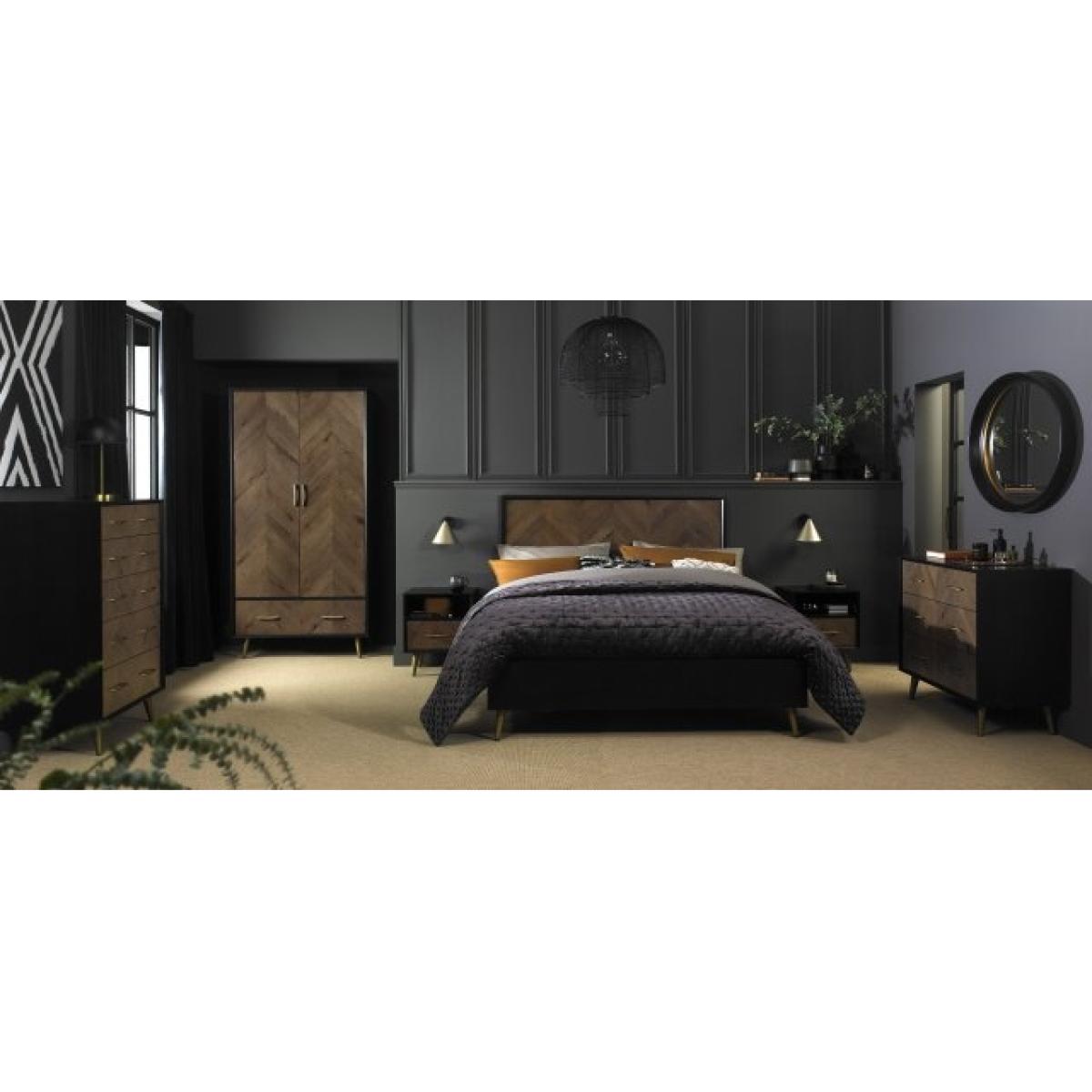 Fusing mid-century and contemporary styling, the Sienna bedroom range features chevron patterned rustic oak veneer headboards, drawer fronts and doors, in a stunning fumed oak finish. Wire-brushed oak veneers frame each piece in a dark peppercorn stain that is also reflected in the colour of the cabinet interiors and bedstead. Contrasting satin brass handles and conical-shaped legs add a glamorous touch to the collection, which is further accentuated with design choices like the mitred and bevelled frames, and soft-close drawer runners. Assembly Required All screens vary in colour reproduction and whilst every effort has been made to display the colour as accurately as possible it is for guidance only. Dimensions Double: Product Depth: 202cm Product Width: 145cm Product Height: 120cm King Product Depth: 211cm Product Width: 159cm Product Height: 120cm Super King Product Depth: 211cm Product Width: 190cm Product Height: 120cm