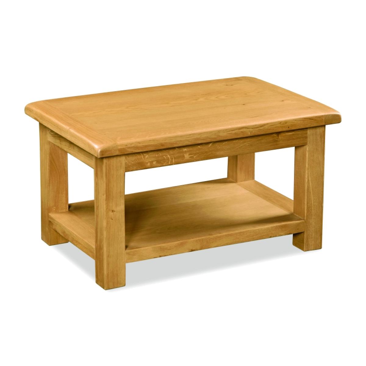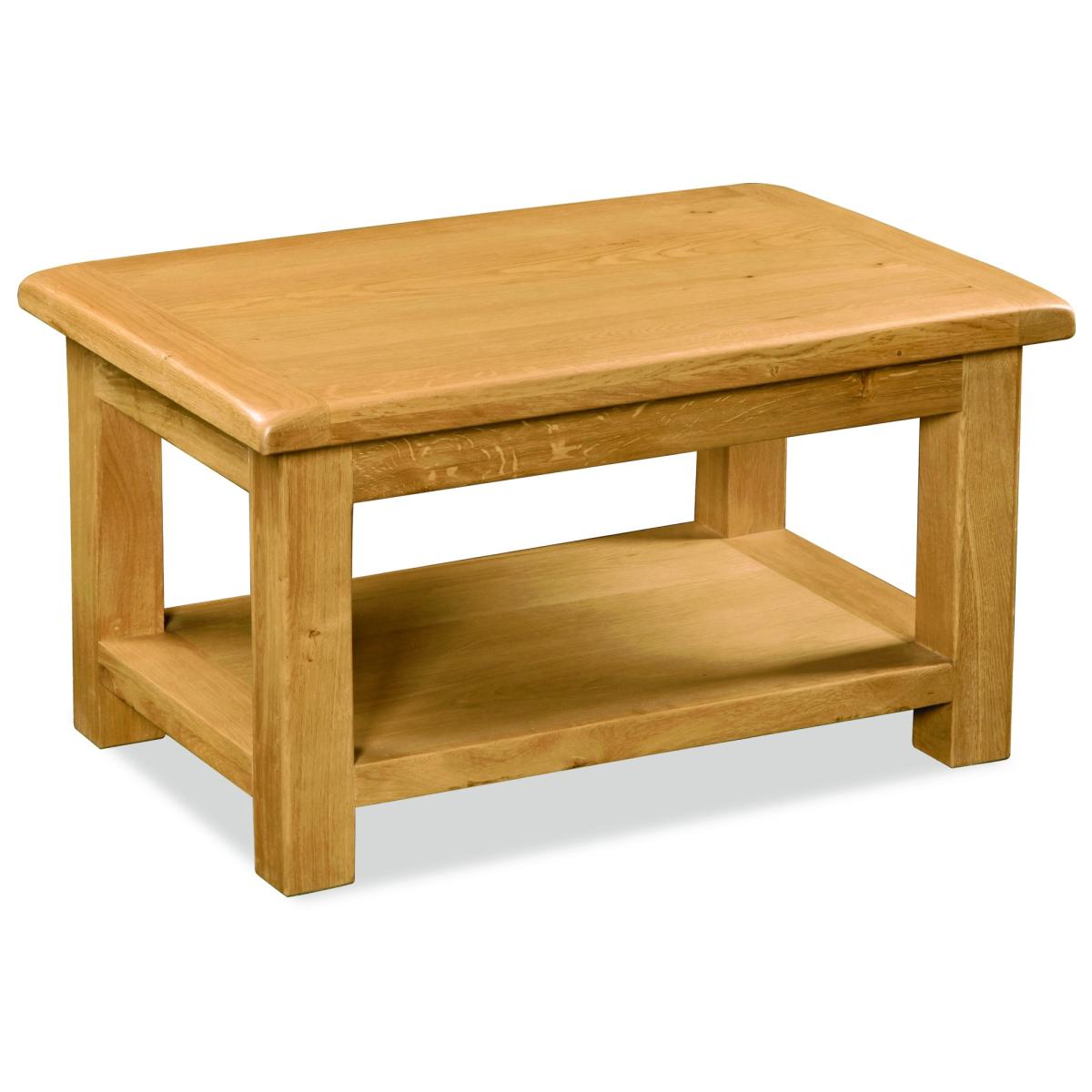 The Ascot Coffee Table is a robust, attractive unit placing in your living room for when you have guests over. This Coffee Table benefits from an attractive oak finish that is both hard wearing and easy to wipe clean. The Ascot Coffee Table has a rectangular top for placing your dinner and drinks upon and lower shelf area for storing your bags or magazines upon. This Coffee Table is kept well supported legs allowing you to dust and clean underneath. The Ascot is a proven collection of oak furniture for every room in the house offering a rustic style to your home. Pieces include dining tables, chairs, coffee tables and much more. The slightly rustic waxed finished exudes a feeling of comfort and easy to live with charm. The huge selection of products gives ample scope for finding the right size option for any room. The thick wooden tops add charm and a classic look. These are practical designs coupled with the odd innovative and quirky pieces, attractively and timelessly presented. Height: 50cm Width: 90cm Depth: 60cm