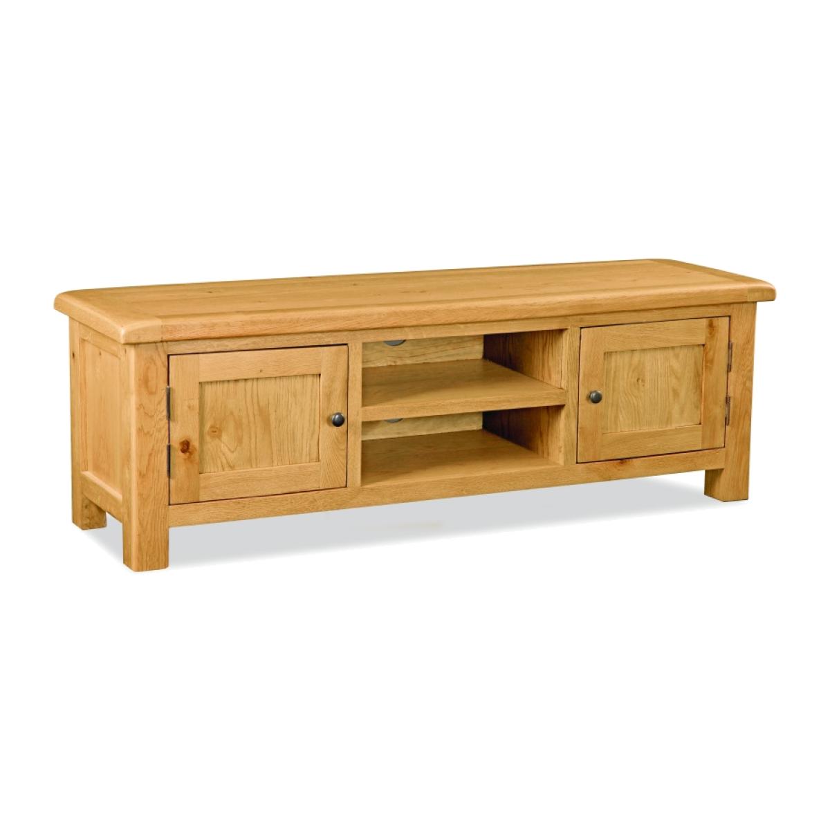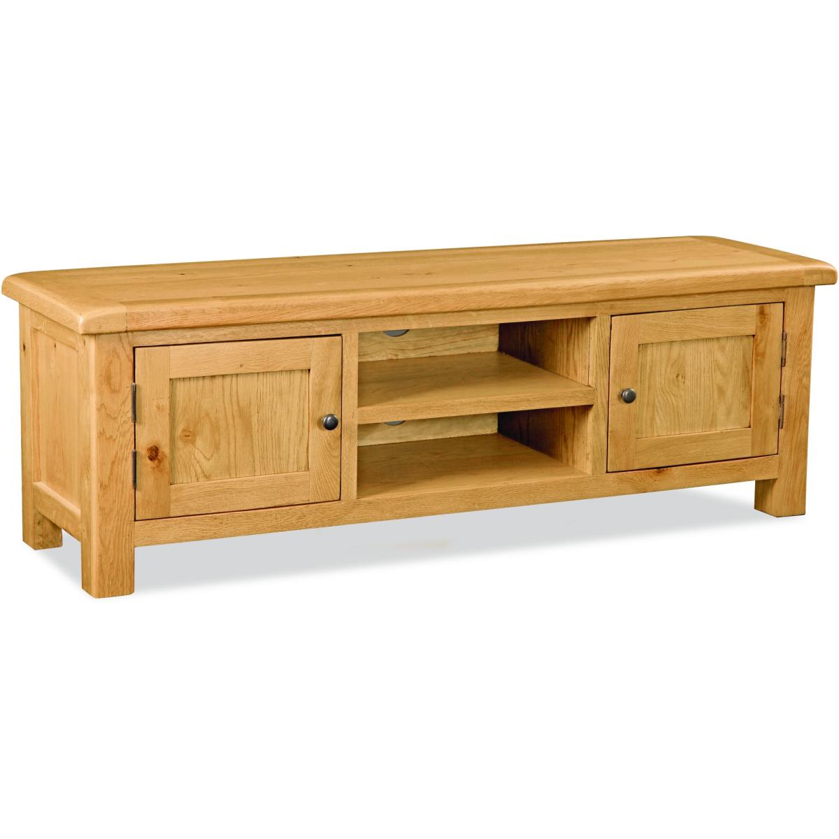 The Ascot Extra Large TV Unit has a stylish way to keep your entertainment equipment neat, tidy and organized. This TV Unit is perfect for large home and can be placed in the living room or bedroom to give you a better viewing position for the television. This TV Unit has spacious top, two doors and a built-in shelf, providing an ample storage space for your electronic gadgets. The Ascot Extra Large TV Unit has been crafted using solid oak that has been lovingly natural finish that will add charm and sophistication to any living room. This Extra Large TV Unit has 2 cupboard allowing ample space for your satellite dish, DVD player and movie collection and ample top space to hold a wide range of flat screen TV's and provides a fantastic view. Ascot is a proven collection of oak furniture for every room in the house offering a rustic style to your home. Pieces include dining tables, chairs, coffee tables and much more. The slightly rustic waxed finished exudes a feeling of comfort and easy to live with charm. The huge selection of products gives ample scope for finding the right size option for any room. The thick wooden tops add charm and a classic look. These are practical designs coupled with the odd innovative and quirky pieces, attractively and timelessly presented. Height: 50cm Width: 150cm Depth: 44cm