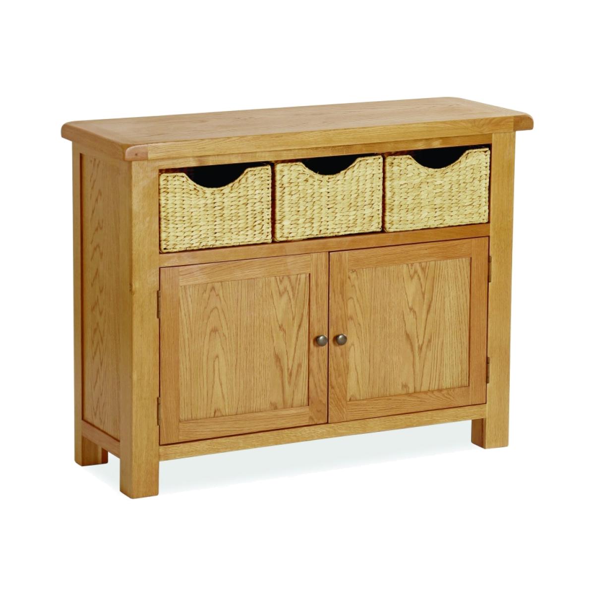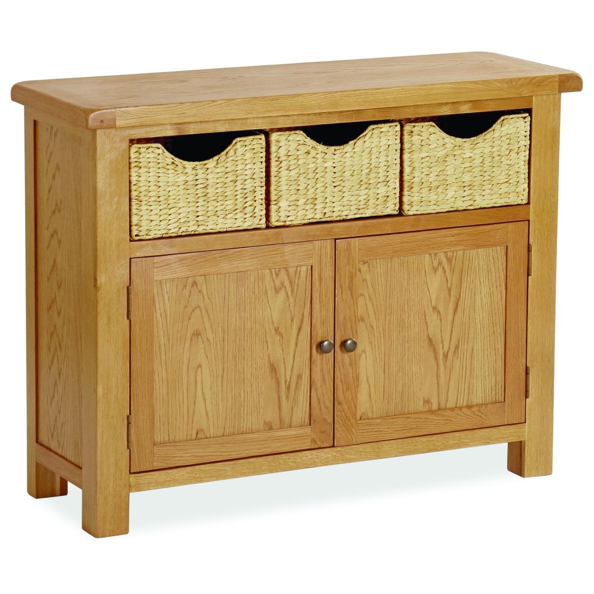 The Ascot Oak Sideboard With Baskets is the perfect size to fit most size living rooms. This Sideboard has solid oak with natural finish and metal handle provide a focal point in any dining or living room. Featuring a very elegant frame with 2 Doors and 3 basket drawers offering plenty of internal storage space for storing away everything from plates and crockery to glassware and the like. Also this sideboard has spacious top surface prove useful as it provides space to place vases, lamps, ornaments and more. Ascot is a proven collection of oak furniture for every room in the house offering a rustic style to your home. Pieces include dining tables, chairs, coffee tables and much more. The slightly rustic waxed finished exudes a feeling of comfort and easy to live with charm. The huge selection of products gives ample scope for finding the right size option for any room. The thick wooden tops add charm and a classic look. These are practical designs coupled with the odd innovative and quirky pieces, attractively and timelessly presented. This item comes with classic woven baskets which are great to store those bits and bobs that are always lying around. Height: 85cm Width: 110cm Depth: 38cm