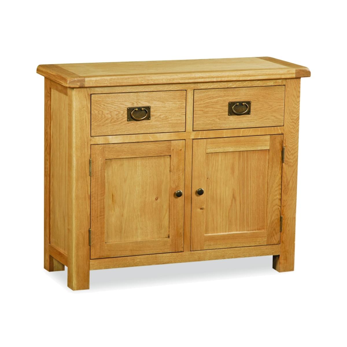 The Ascot Small Sideboard adds rustic elegance to your living room or dining room. Two generously sized drawers and two roomy Cupboards offering lots of space for your everyday kitchen items with a fixed central self, with a solid wide surface to show off your family photos or ornaments. Built using solid american white oak and high quality real oak veneers to add strength with dovetailed draw joints used throughout. A waxed finish that shows off the wood’s warm colouring, rich grain and natural beauty, finished off with brass effect handles. Ascot is a proven collection of oak furniture for every room in the house offering a rustic style to your home. Pieces include dining tables, chairs, coffee tables and much more. The slightly rustic waxed finished exudes a feeling of comfort and easy to live with charm. The huge selection of products gives ample scope for finding the right size option for any room. The thick wooden tops add charm and a classic look. These are practical designs coupled with the odd innovative and quirky pieces, attractively and timelessly presented. Height: 86cm Width: 104cm Depth: 40cm