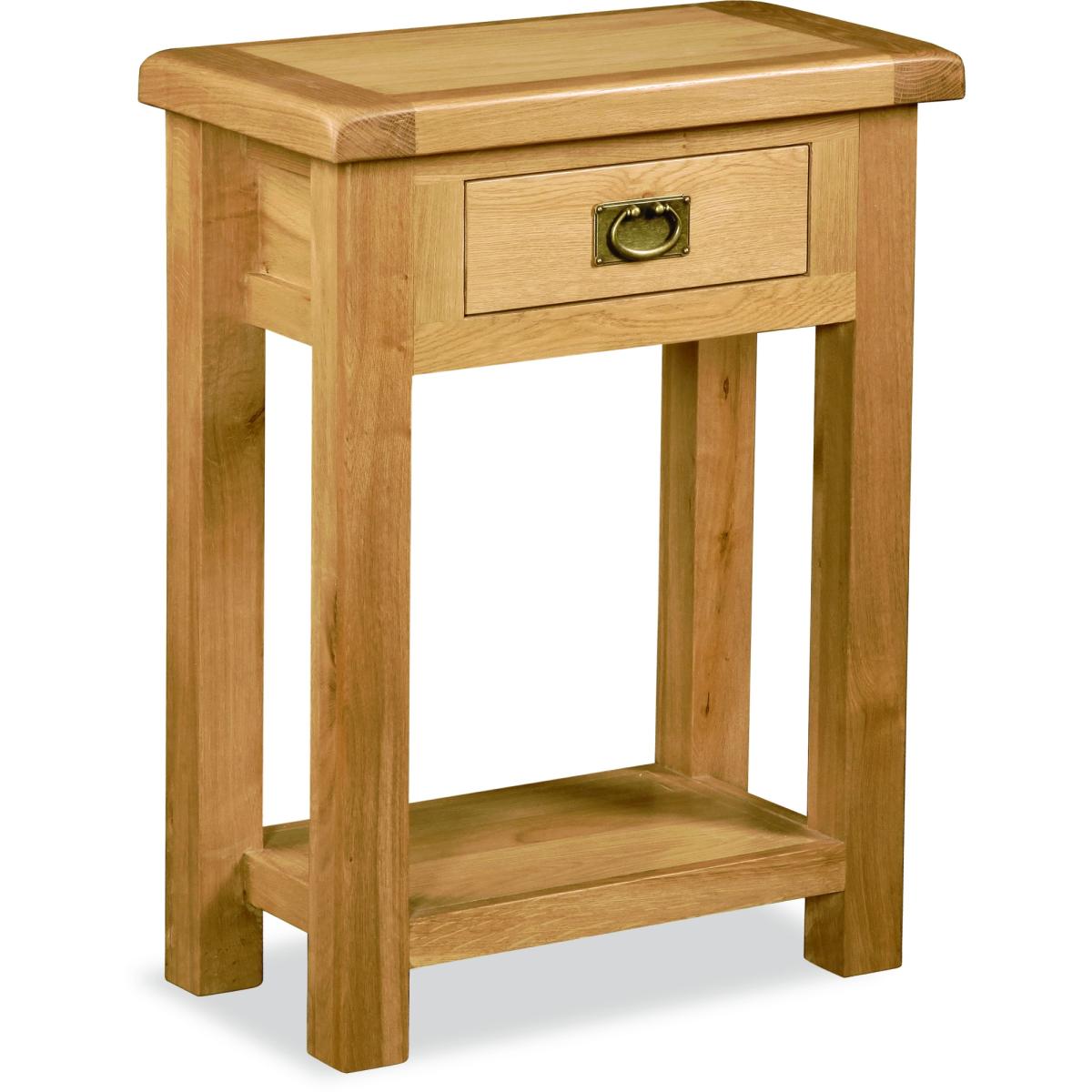 The Ascot Telephone Table is ideal for hallway or living room use and features a single drawer for additional storage. This elegant Telephone Table is a luxurious mix of solid oak and oak veneer construction with natural finish and cleverly designed to look like black metal handles to add stylish detail. The Ascot Telephone Table has single drawer to store keys, wallets and mail allowing you to maintain a neat and tidy hallway. This Telephone Table has wide surface for your landline or wireless router and also the perfect size for photos or a vase of flowers, making it a great option for dressing up your space. Ascot is a proven collection of oak furniture for every room in the house offering a rustic style to your home. Pieces include dining tables, chairs, coffee tables and much more. The slightly rustic waxed finished exudes a feeling of comfort and easy to live with charm. The huge selection of products gives ample scope for finding the right size option for any room. The thick wooden tops add charm and a classic look. These are practical designs coupled with the odd innovative and quirky pieces, attractively and timelessly presented. Height: 85cm Width: 65cm Depth: 35cm