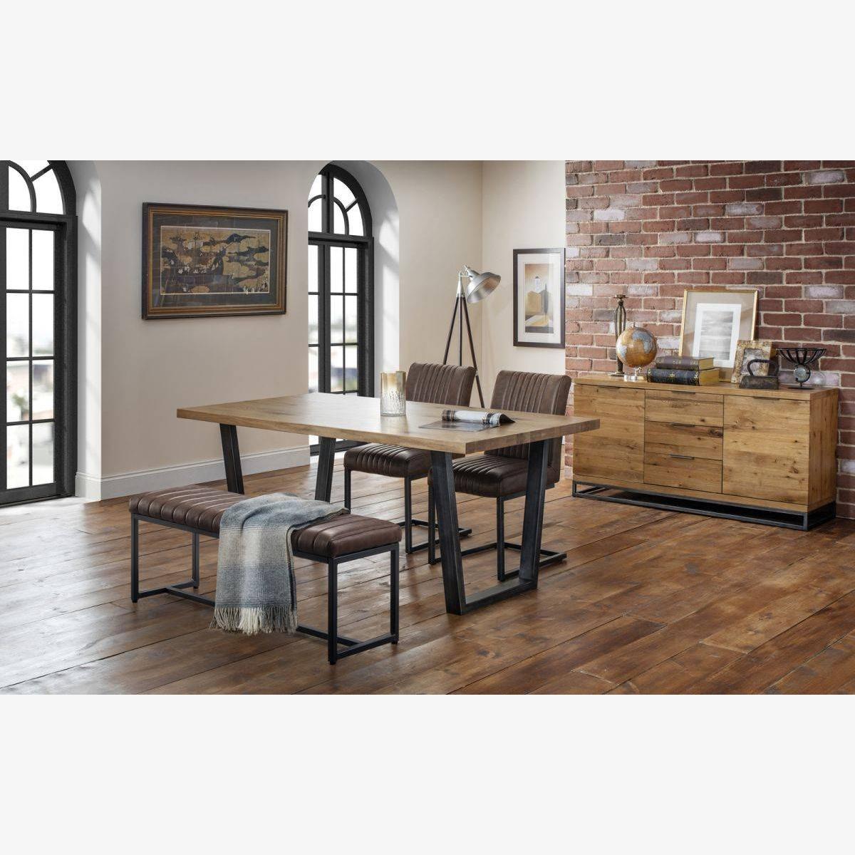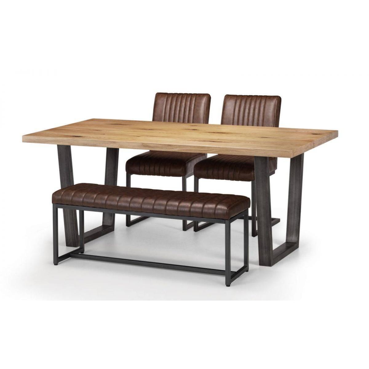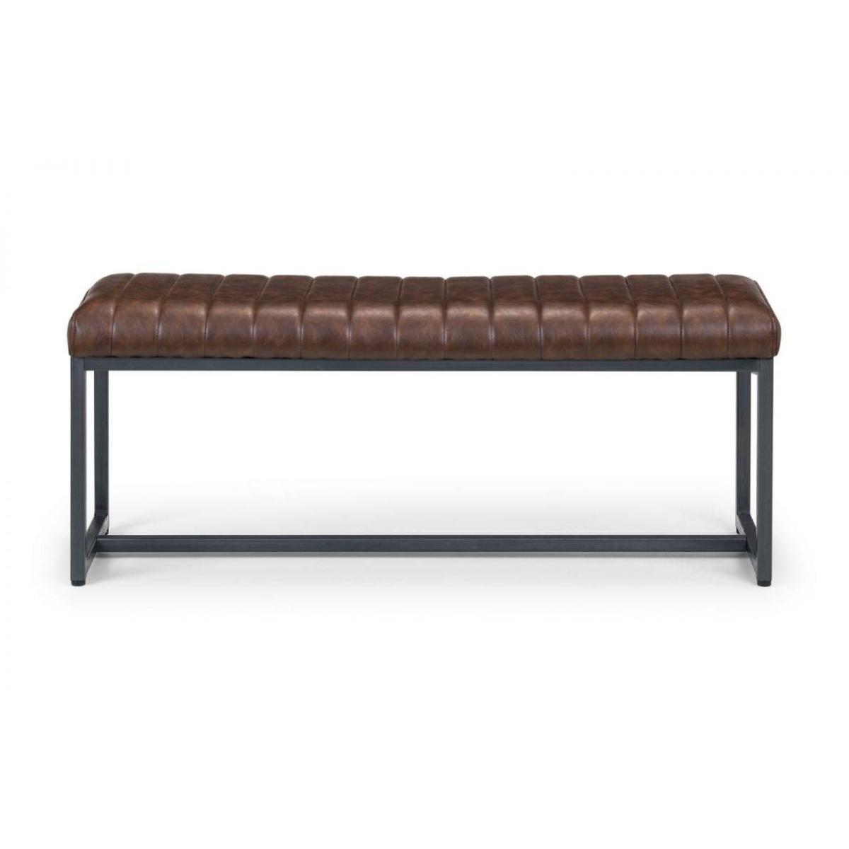 Upholstered in a vintage brown faux leather finish, this upholstered bench offers a stunning retro design. The Brooklyn Upholstered Bench offers a vintage edge featuring industrial style gunmetal frame. This spacious bench can seat up to 2 people, perfect for a wide range of modern decor. Part of the Julian Bowen Brooklyn Dining and Occasional Collection. Dimensions: 40.5cm (D) x 121cm (W) x 47cm (H)Assembly required.