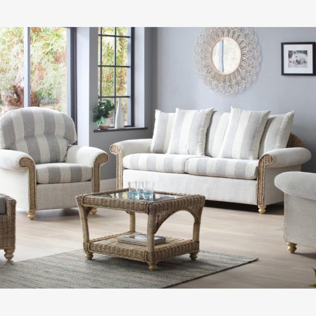 Modern and comfortable, the Samford 2-Seater Scatterback Sofa and 2 Armchairs Suite is a stylish addition to any household. Different from the traditional indoor cane and rattan furniture, the Samford 2-Seater Sofa Suite is available in a wide selection of fabrics and fits in with the rest of the Samford range impeccably or would look equally as great as standalone pieces. Not only is this a beautiful furniture set, but it is also a natural, hand-crafted, ethical product, manufactured from sustainably farmed materials. The Samford collection is ideal if you are searching for a new, stylish, and contemporary couch or want to give your conservatory, kitchen area, summer house, or even living room, a real sense of modern elegance. The set includes a 2-Seater Sofa, 2 Armchairs and soft, foam-filled seat cushions with supportive fibre-filled back cushions that are Dacron wrapped for longevity as well as a comfortable plump finish. The Samford collection features a sustainably farmed rattan frame and Pirelli webbing has been used in the base of the furniture for a sturdy foundation; designed to last for many years to come. The cushion covers are removable for dry clean only. Includes: 1 x 2-seater sofa, 2 x armchairs Handmade Sustainable Rattan Frames Assembled Frames No Assembly Required 2-Seater Dimensions: Height: 99cm Width: 156cm Depth: 90cm Armchair Dimensions: Height: 99cm Width: 100cm Depth: 90cm All screens vary in colour reproduction and whilst every effort has been made to display the colour as accurately as possible it is for guidance only.