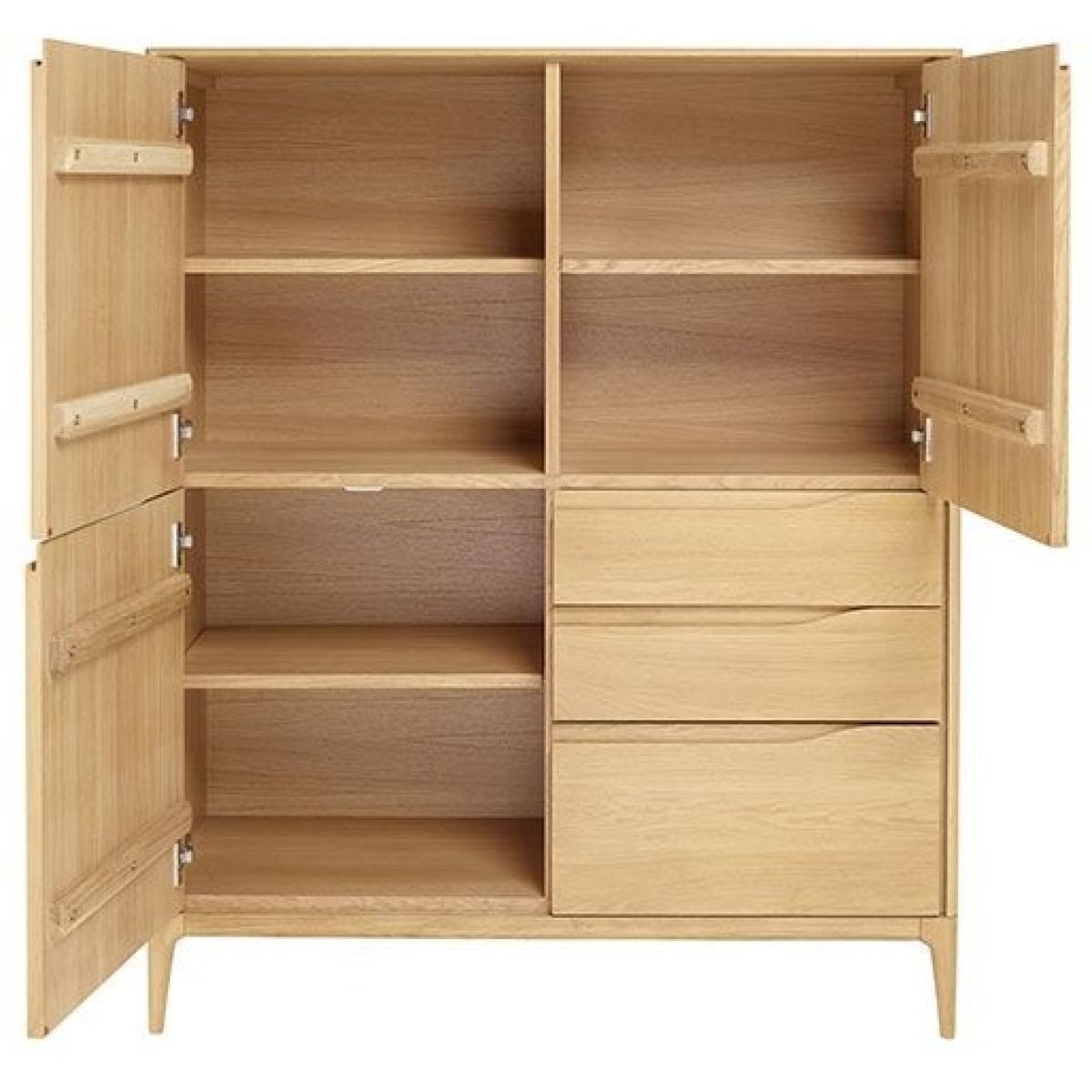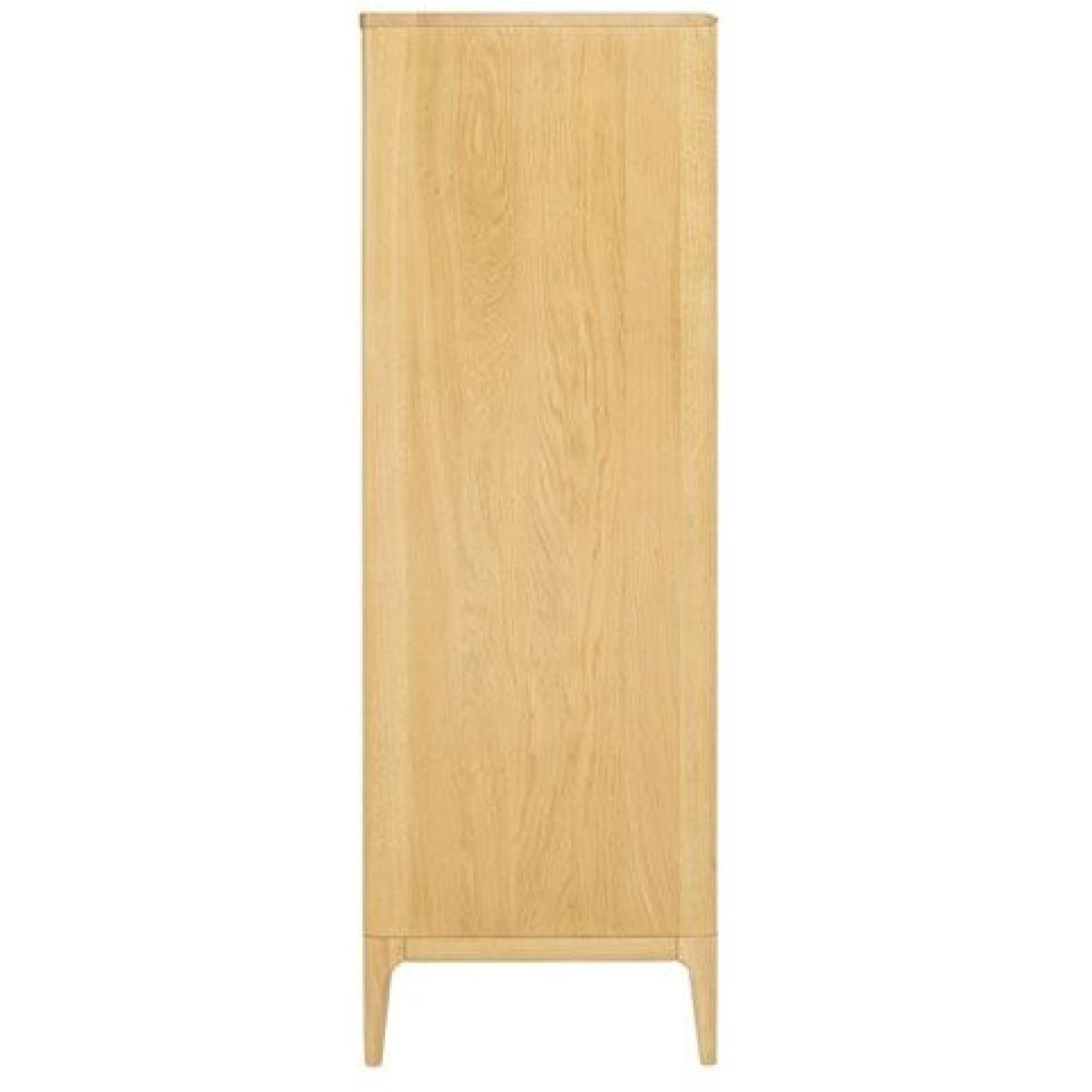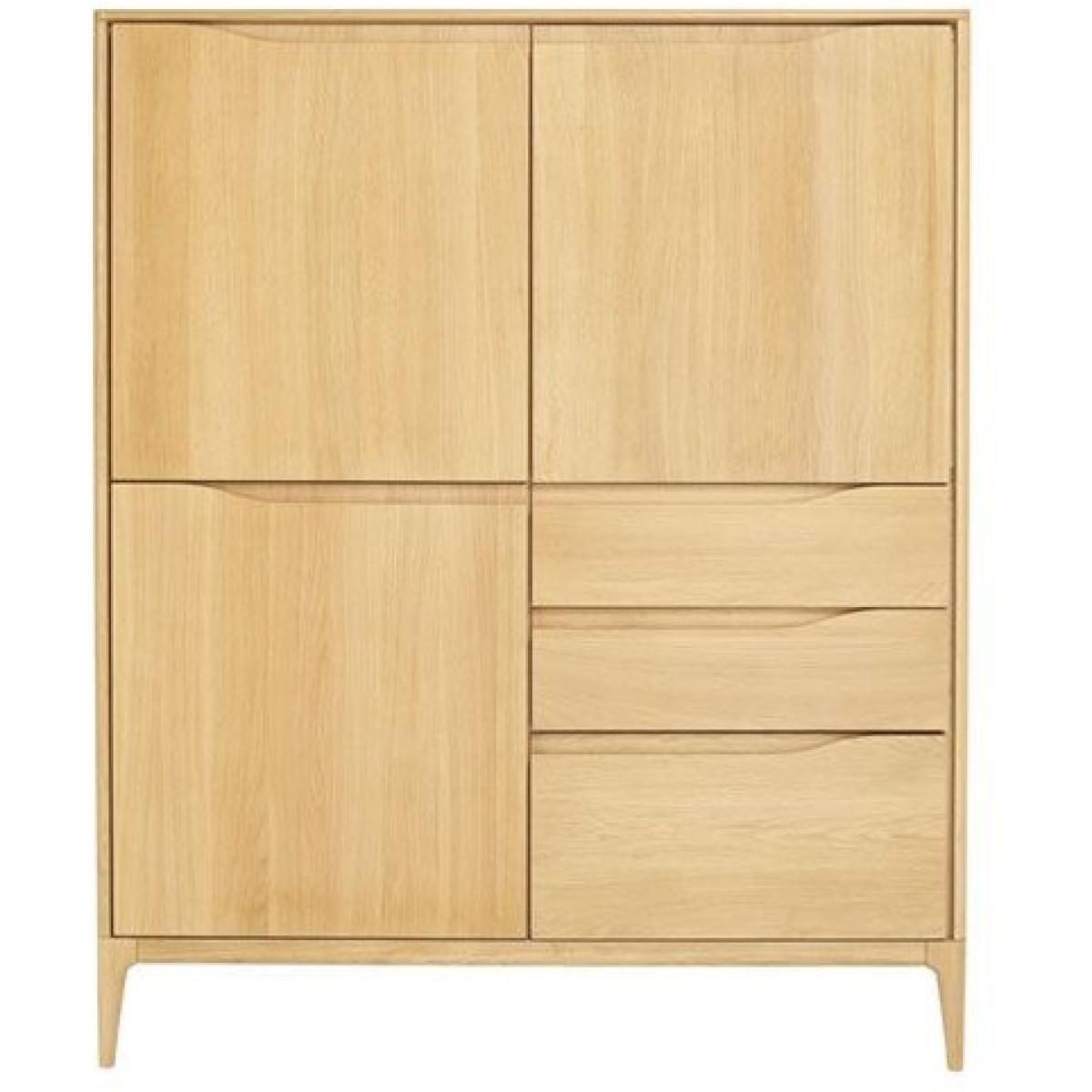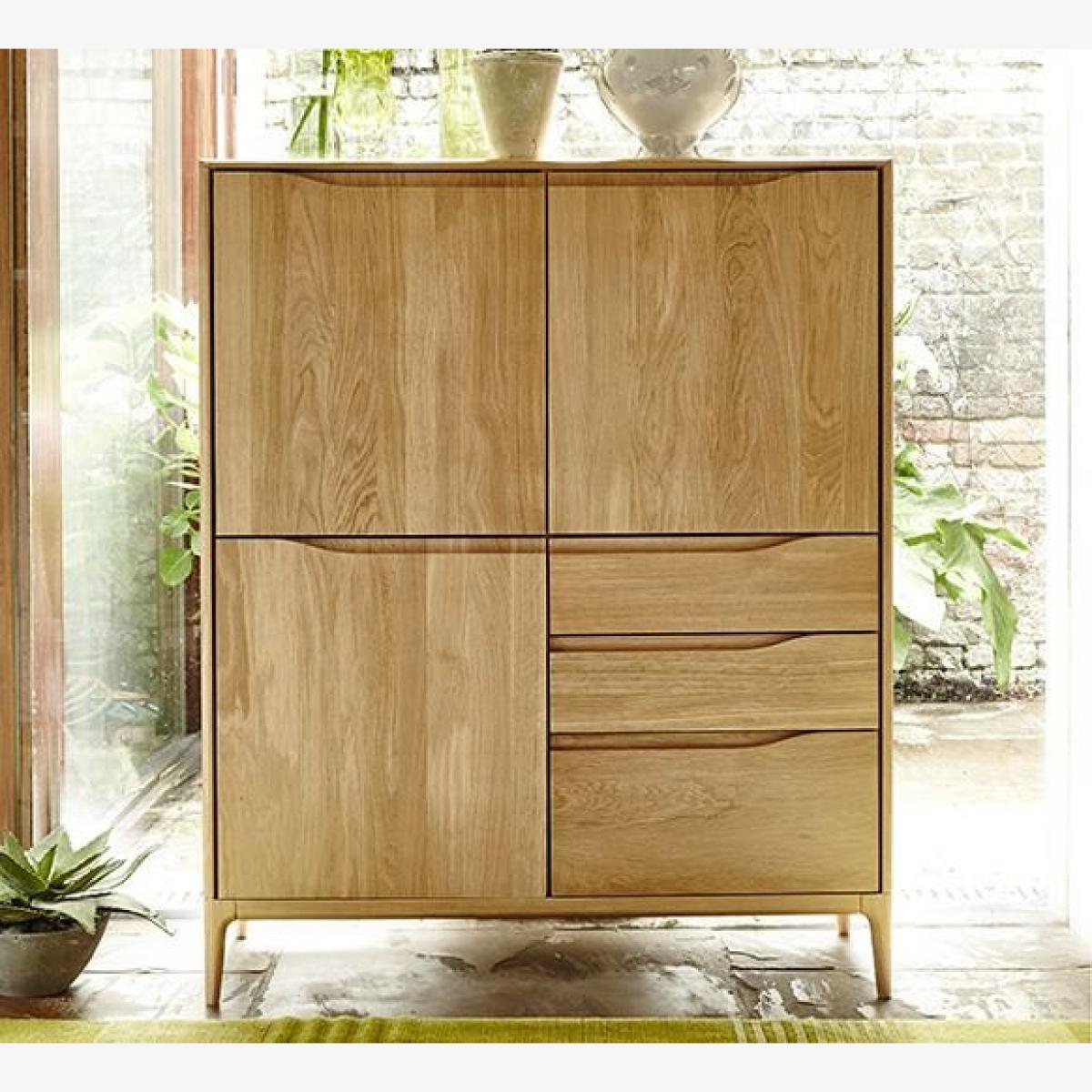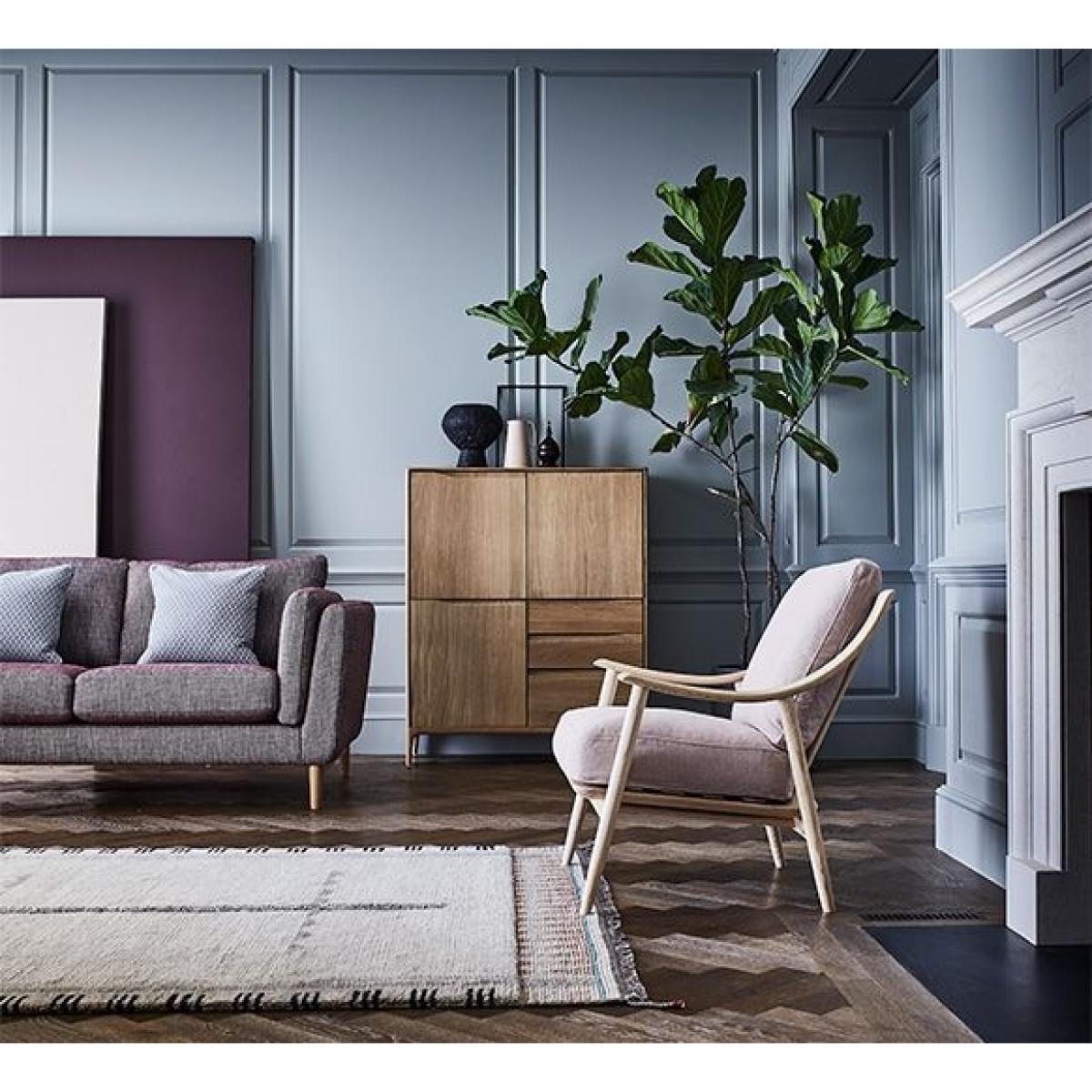 Romanas style is modern, including cabinets and sideboards with a low contemporary outline; but with subtle detailing and soft shapes the range remains understated. Detailing includes shaped legs, whose easy organic lines belie the complexity of manufacture. The shaped edge to the top panels echoes the softness of ercols vintage mid-century designs, but cut into the carcass it gives a streamlined feel to the silhouette. A high level of craftsmanship is used in creating the organic shapes in the range. Complex construction is further evidenced in flush, sculpted curves across joints and in the close fit of the curved tops into the recessed tops of the cabinet carcasses. This striking oak high board is a statement piece of furniture, combining modern styling with practical storage. Three large storage cupboards, all with adjustable shelves for complete flexibility, in addition there are two standard drawers and a third extra deep drawer for extra storage all have convenient soft close mechanisms. The front edge of the high board top has the signature soft curve, and the legs have the fluid organic curves and chamfers, that characterise Romana. Fluid wave-shaped cut-out recesses provide the door and drawer handles, another design signature of the range. This beautiful piece of oak furniture is finished in a clear matt lacquer to display the natural timber to the full. Dimensions:Width: 108cmDepth: 45cmHeight: 132cmDisclaimer:Wood is a natural material, consequently the grain pattern will vary from piece to piece. Cabinets and chests over 60cm tall should be fixed to the wall to ensure stability, anti-tip kits with fixtures will be provided. The fixing of these pieces to the wall will not be carried out by our delivery partner. Please follow the product instructions and immediately attach to a wall as stated. Upholstered furniture, images and the fabric visualiser are designed to act as a guide of how a piece will look. Pattern placement, exact colour and texture of a fabric can vary from this. Before ordering, we recommend viewing the fabric and wood finish in store and ordering samples to view at home. While we endeavour to ensure that the stated dimensions are as accurate as possible, due to manufacturing tolerances, these may vary slightly.