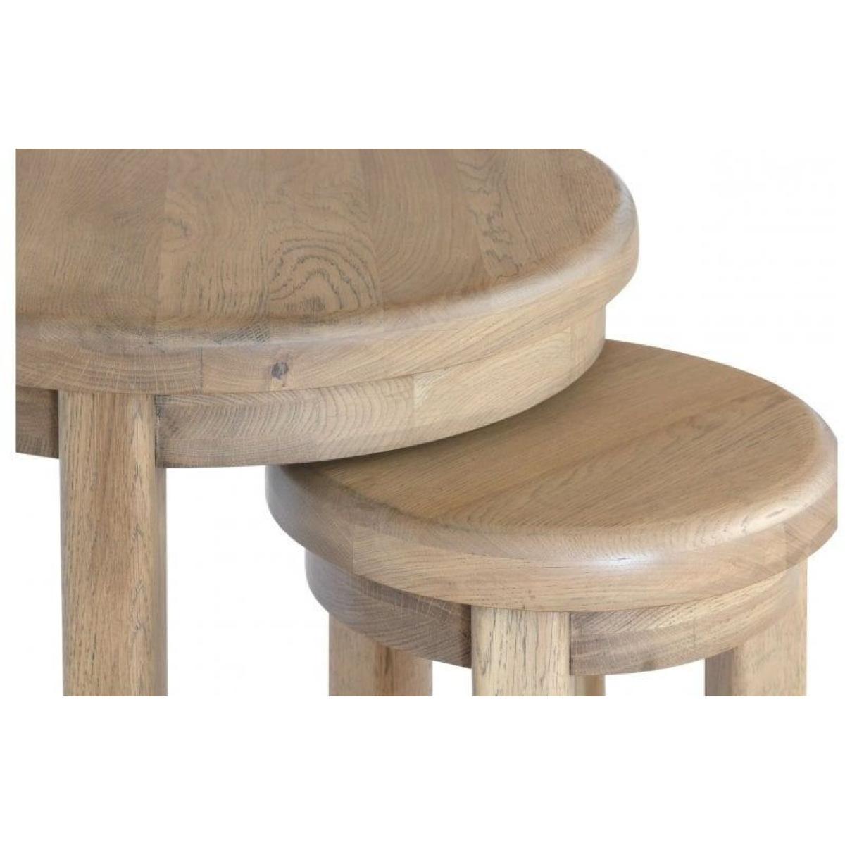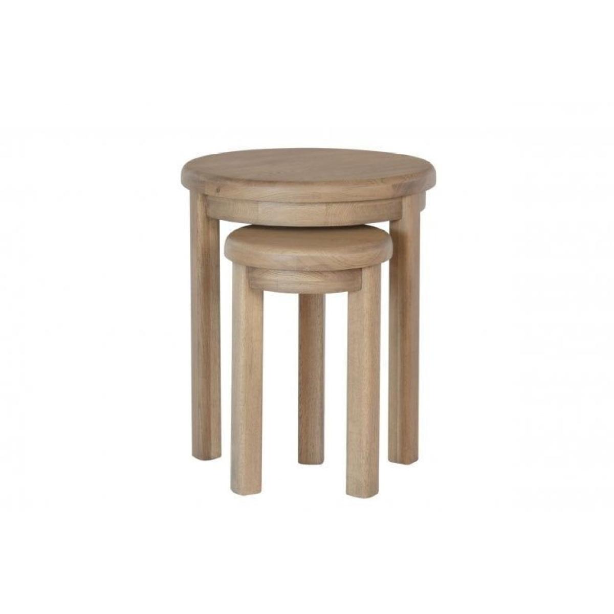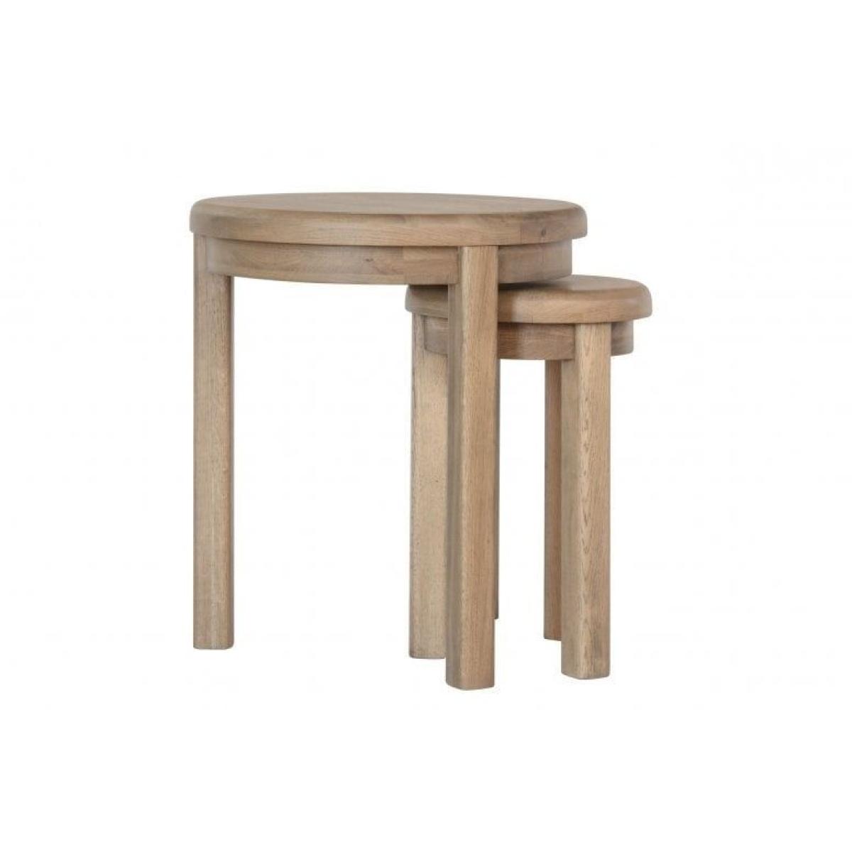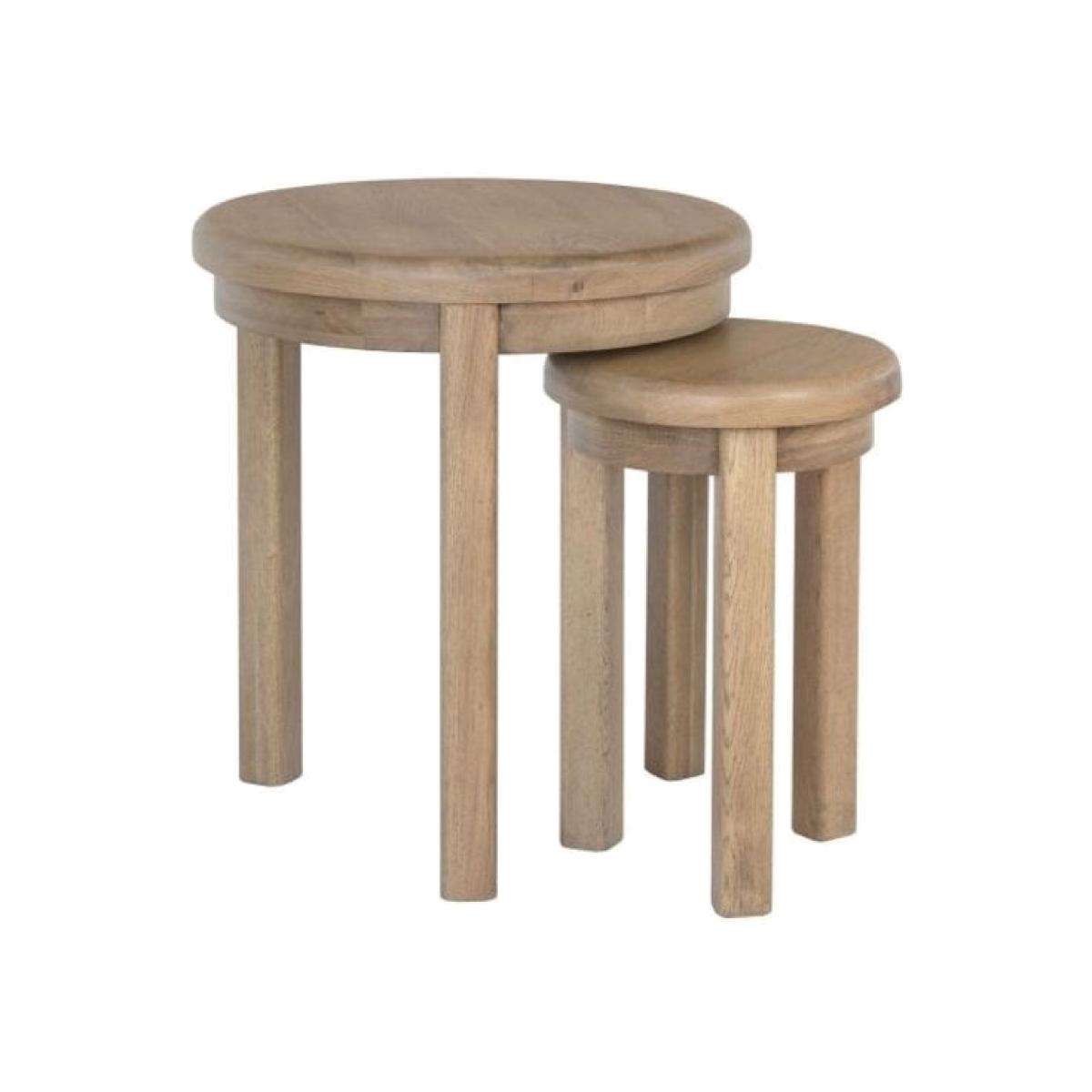 I love this set for their practical yet classic design. The round shape makes them flexible for various room layouts, whether as side tables or handy extra surfaces. They work particularly well in understated, Scandinavian-inspired interiors due to their natural wood finish, bringing warmth without clutter. When styling, consider stacking them next to a sofa for easy access, or using them as plant stands or for display on a neutral rug to add dimension. An added bonus is their compact size, making them versatile for small spaces or areas where multi-functionality is key.