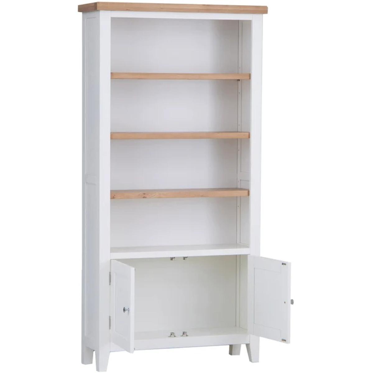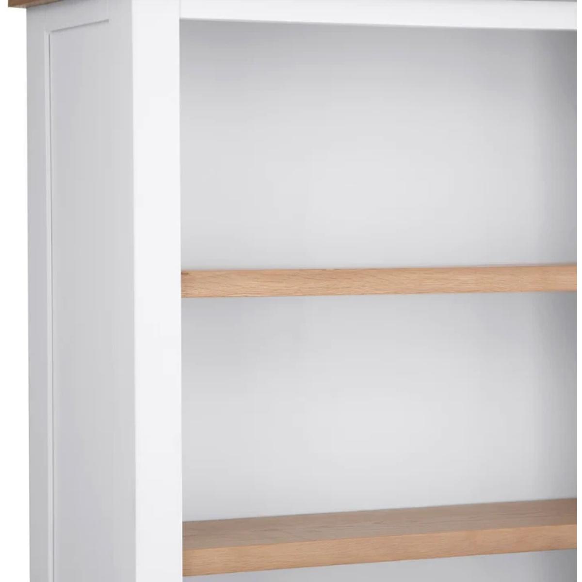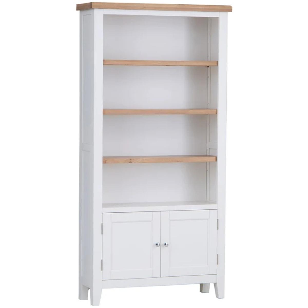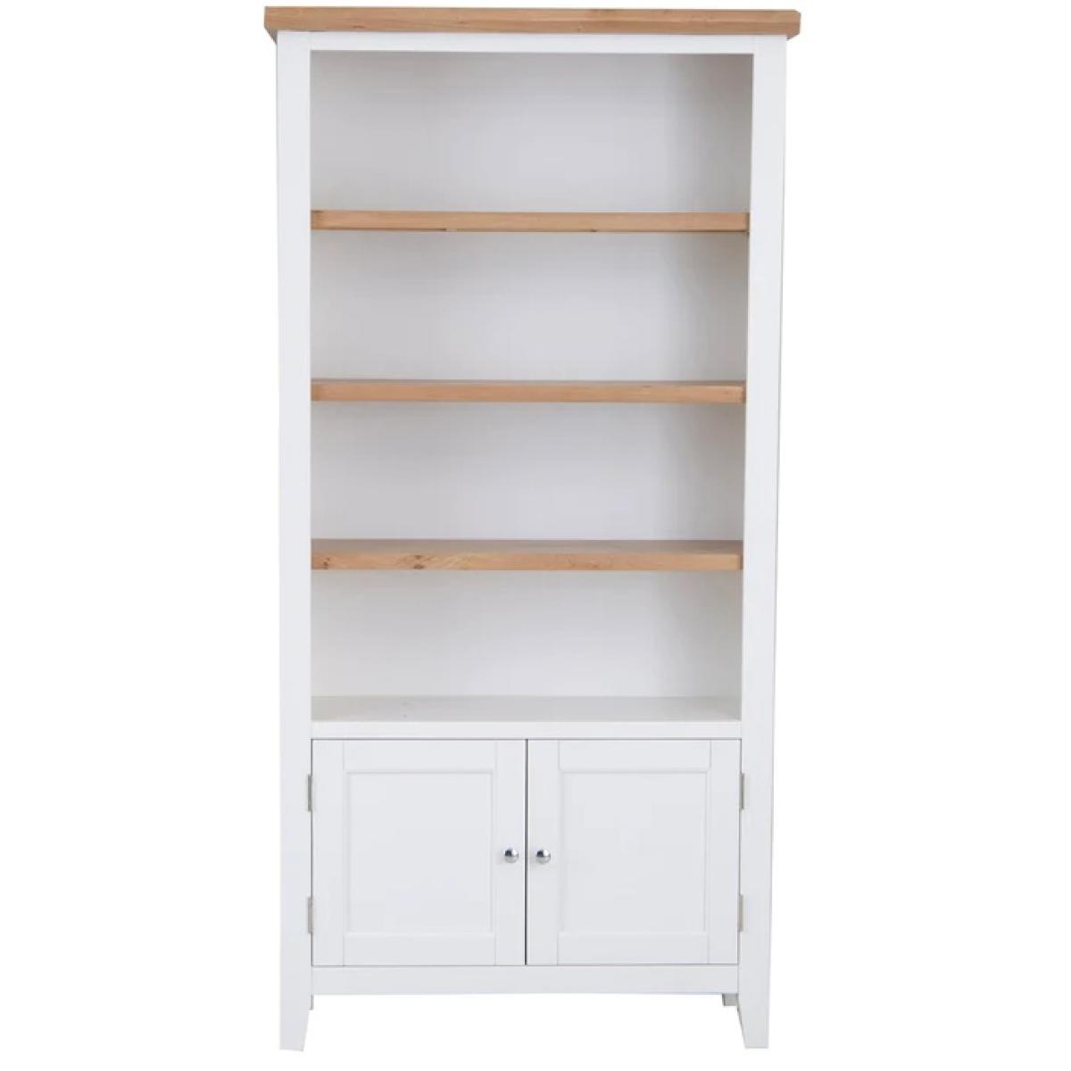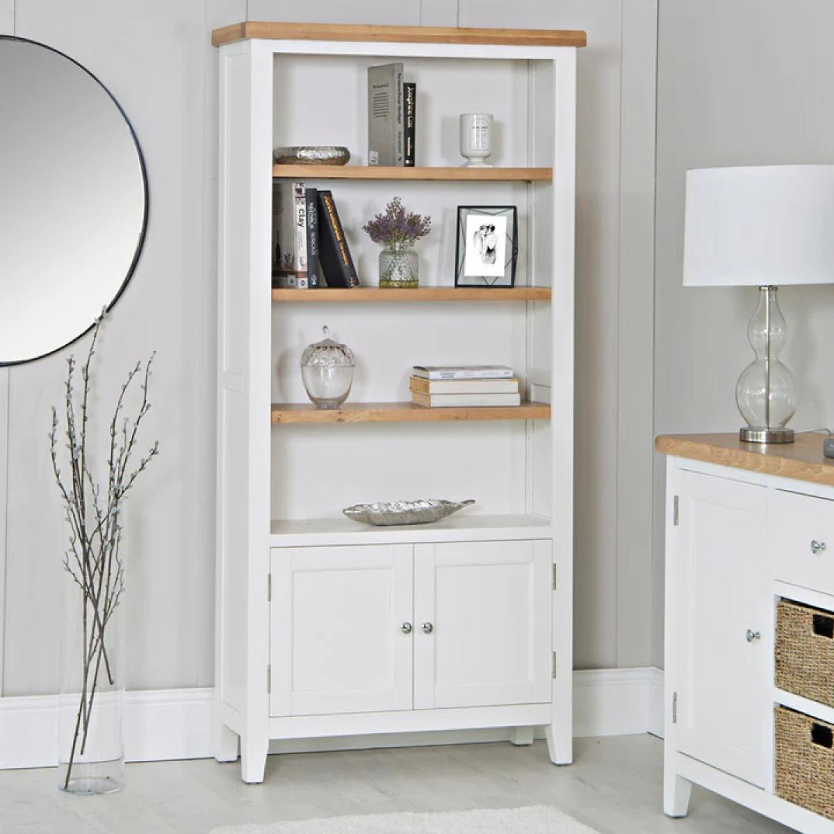 Product Description With washed oak tops and a beautifully painted finish and chrome elements, this dining collection seamlessly blends rustic warmth with contemporary design, adding a classic but stylish feel to any dining space. This Easton Large Wide Bookcase in White is a welcome addition to your living space. This range is also available in Grey. Features: Part Assembled Cupboards for Storage Chrome Handles Available in a White or Grey Finish. Quality Oak Top for Durability Modern Style Country Design Made From Solid Oak, Pine & Real Veneer. Dimensions: Height: 180cm Width: 90cm Depth: 30cm All screens vary in colour reproduction and whilst every effort has been made to display the colour as accurately as possible it is for guidance only.
