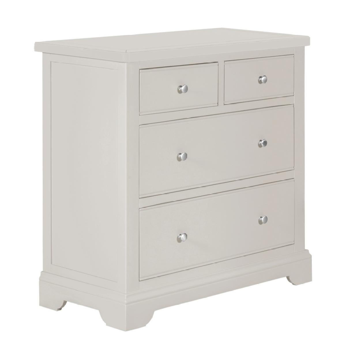 Loire Grey Painted 2+2 Drawer Chest will add a rich tone to your home, and will compliment the rest of your home furniture. This practical cabinet poses of 4 drawers, 2 small and 2 large drawers making it a superb addition to the storage space in your room. The delicate grey painted finish with groove detailing on the drawer fronts and metal silver knobs.  This would suit any bedroom, adding class and elegance with its soft look finish complemented by rounded corners. MDF and Pine Material Grey Painted Finish Chrome Drawer Knob Net Product Weight: 34 kg Height: 91.6cm Width: 95cm Depth: 43.1cm