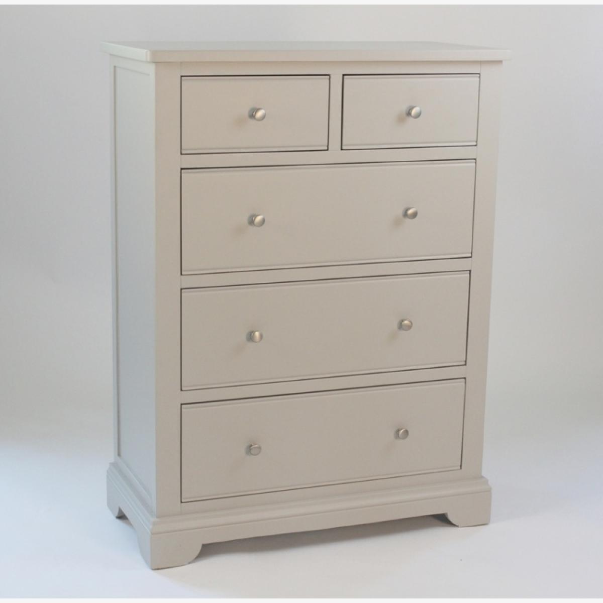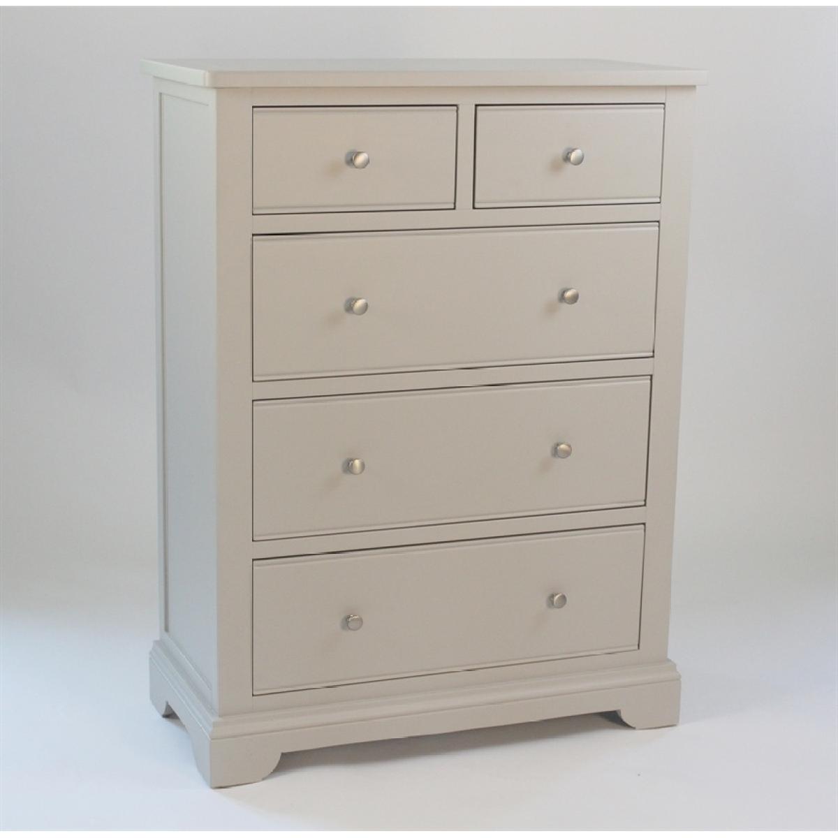 Loire 2+3 Drawer Chest destined to contribute a long-lasting and highly useful presence to any bedroom it graces. The 5 sturdy drawers offering a large capacity for bulk storage and top can hold lamps, photos or ornaments and can be wiped clean with minimal effort. The delicate grey painted finish with groove detailing on the drawer fronts and metal silver knobs give a rich and bold look, perfect for modern design tastes. MDF and Pine Material Grey Painted Finish Chrome Knob Net Product Weight-42 kg Height: 122.6cm Width: 89cm Depth: 43.1cm