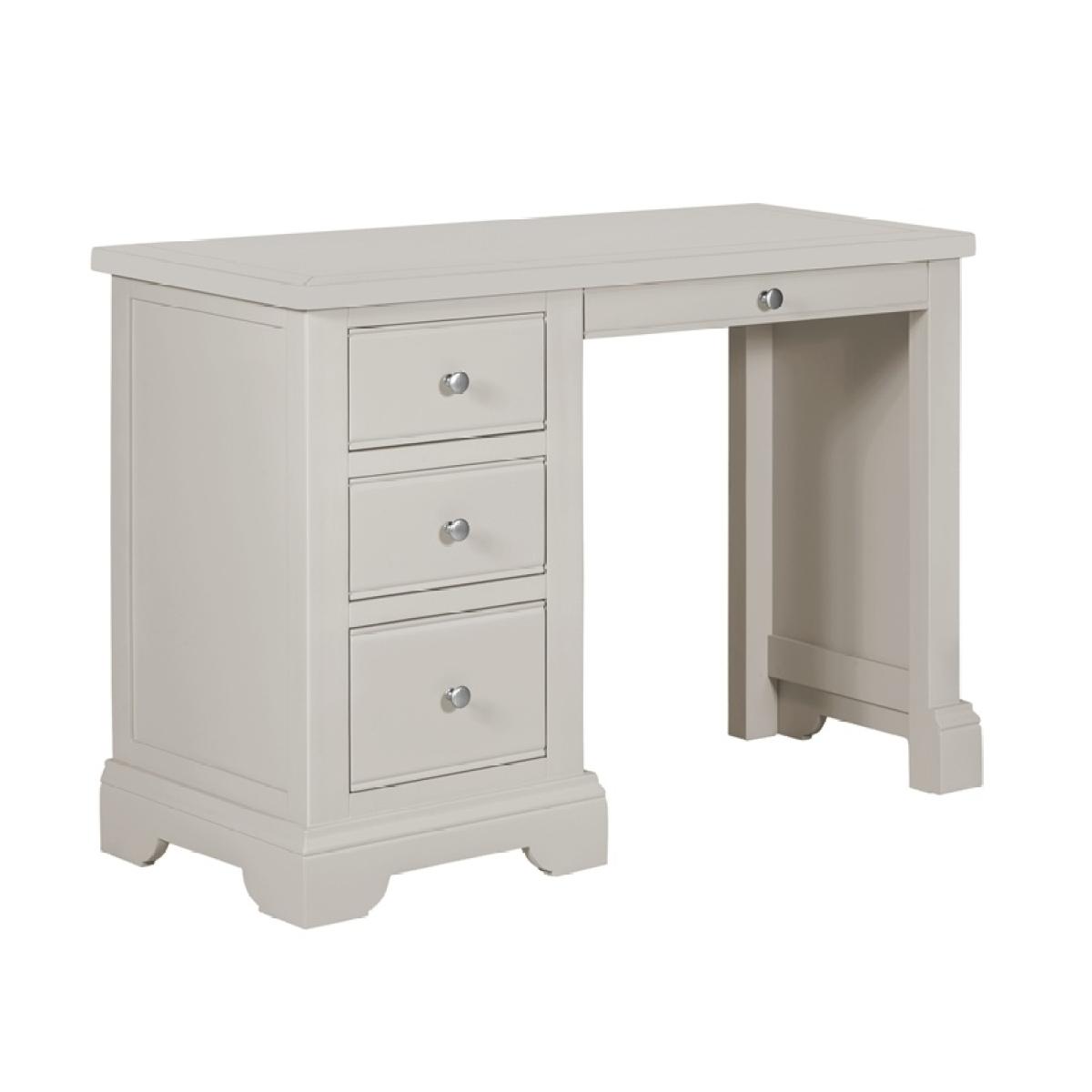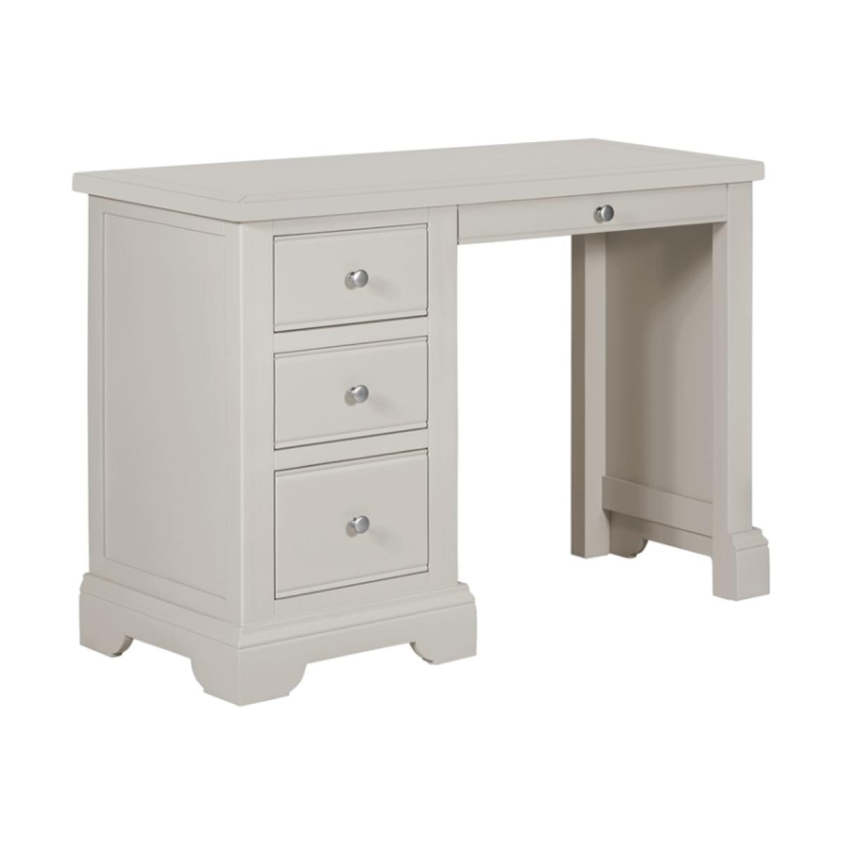 The Loire Grey Painted Dressing Table is ideal for use as either a dressing table, or as a desk for the home office. Made from beautiful grey painted finish and silver metal knobs, this unit will bring brightness to your home and stay on trend. With three spacious drawers down one side as well as a handy under desk drawer that’s ideal for storing all the bits and bobs that you normally lose the Loire dressing table would be a perfect fit in any home. MDF and Pine Material Grey Painted Finish 3 Drawer with Desk Drawer Chrome Knob Net Product Weight-27 kg Height: 76.6cm Width: 112.5cm Depth: 43.1cm