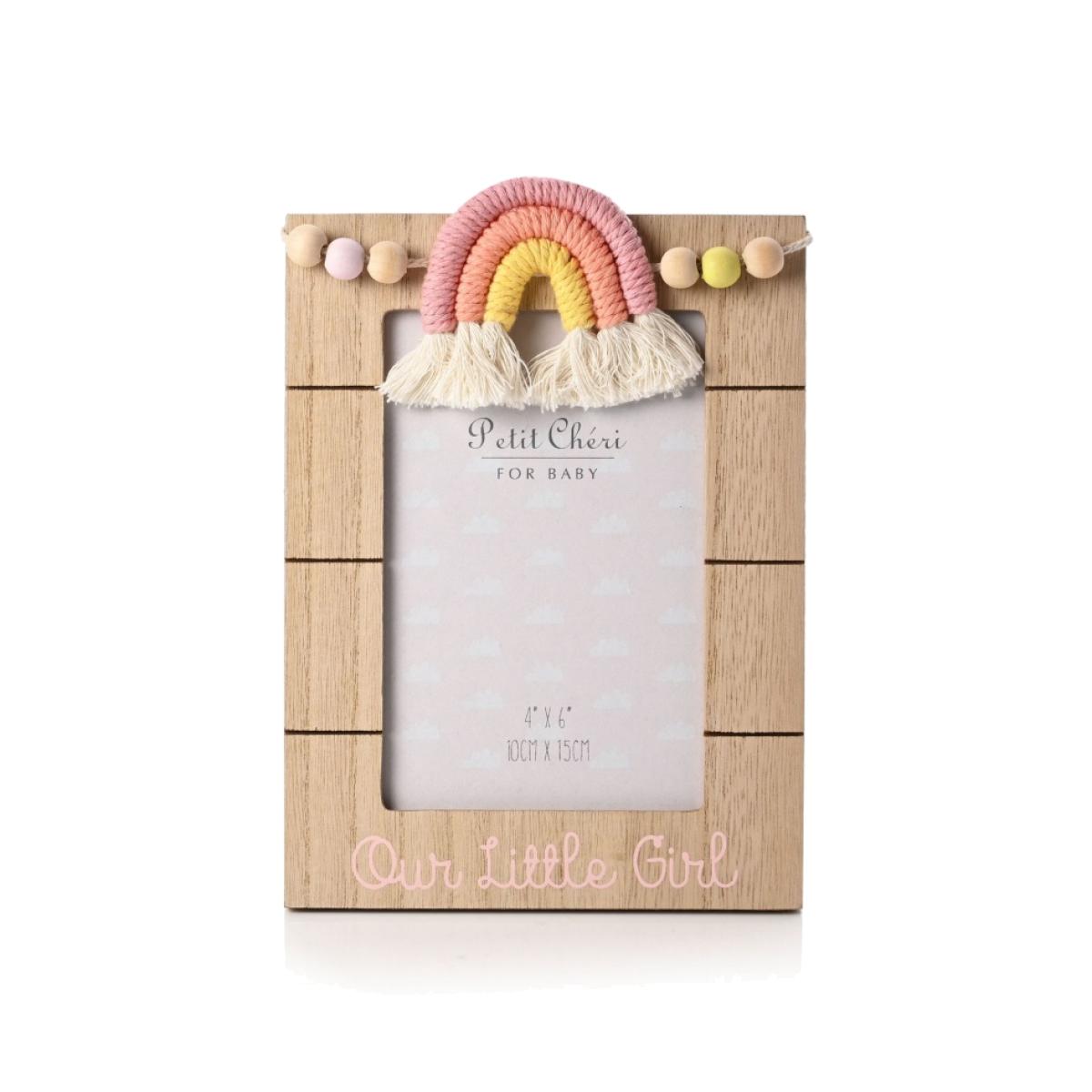 This unique wooden photoframe would make a beautiful home for your favourite photos of your little girl. The beautiful macrame rainbow embellishment perfectly compliments the pink tones of the rest of the frame. This would make a charming addition to your child39;s bedroom or nursery. Details:. *MDF Photo Frame with Macrame rainbow *perfect for photos of your little girl *4 x 6 *Packaging dimensions:H 214, W 36, D 158mm *Product dimensions:H 30, W 324, D 147mm