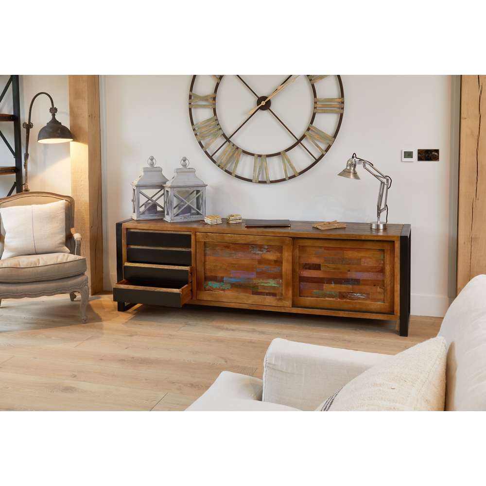 Differing to the stereotypical oak sideboard, the ultra-chic Downtown Modern Ultra Large Sideboard presents a wonderful and functional design with a stunning appearance. Complete with four drawers on the left hand side of the piece, with a two sliding doors which can be opened to reveal two large shelves on the right, it will be incredibly useful in whichever room it is placed in. Supported by a steel frame and with splashes of colour throughout the wood, this extra-large sideboard will certainly be a conversational point in your living area.