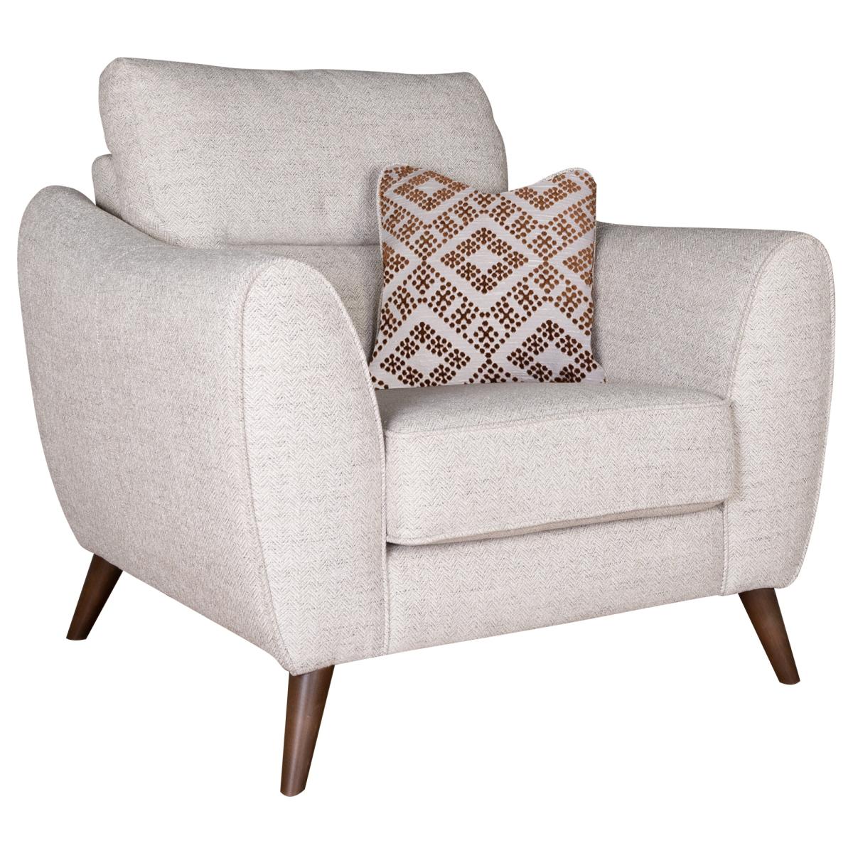The Molly Chair is a cosy and comfortable chair.  Both comfortable and stylish, the Molly's high back is supportive and the fibre back cushions add extra comfort. Reversible high density foam seats offer a comfortable and supportive sit whilst maintaining their shape. Behind the scenes, the frame boasts dowelled, screwed, glued, and stapled joinery, serpentine seat springs end elasticated back webbing. To improve the longevity of your hand-made furniture, we recommend periodically rotating cushions. Pick from a choice of on-trend fabric colours plus feather filled scatter cushions. One side of the scatter will match the body cover with the other your favourite from the selection available. Choose your preferred foot colour from walnut or mid oak for the finishing touches. Please note: All dimensions are approximate. Allow tolerance of +/- 2.5cm. Dimensions Height: 99cm Width: 84cm Depth: 100cm