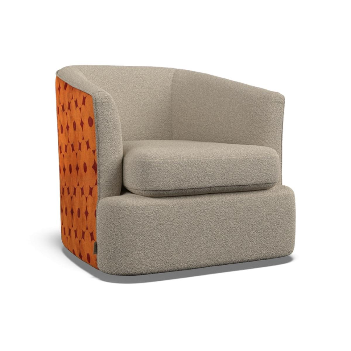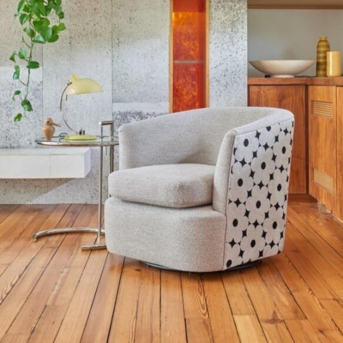 Orla Kiely's upholstered furniture collection brings to life her playful combination of colour and pattern to add a pop of fun to your everyday. Each piece is directly influenced by Orla to apply her signature modern twist to mid-century style. Every item is handmade to order in the UK, allowing for endless authentic Orla Kiely looks to be created using the wide range of colour and exclusive pattern available. The range consists of furniture to suit any space, from large corner sofas to small accent chairs and stools, with all hardwood timber frames backed by a 10 year manufacturer warranty. In addition to our sofa range, we have designed a collection of vintage-inspired accent chairs. A great way to add style to any room, these pieces can be ordered on their own or with any of our sofa ranges. Available in a large selection of official Orla Kiely fabrics, these authentic pieces of furniture are sure to become cherished items in any home for years to come. Sculptural design is the hallmark of the Callan, the bold curves and forms sit on a hidden swivel base. Available in a range of fully plain chairs or patterned backs with a plain seat and front, creating a subtly playful aesthetic that can hold its own as the centrepiece in any room in your home. Features Seat Cushions: Foam Filled Frame guarantee: 10 years Dimensions :H 73cm x W 78cm x D 83cm All screens vary in colour reproduction and whilst every effort has been made to display the colour as accurately as possible it is for guidance only