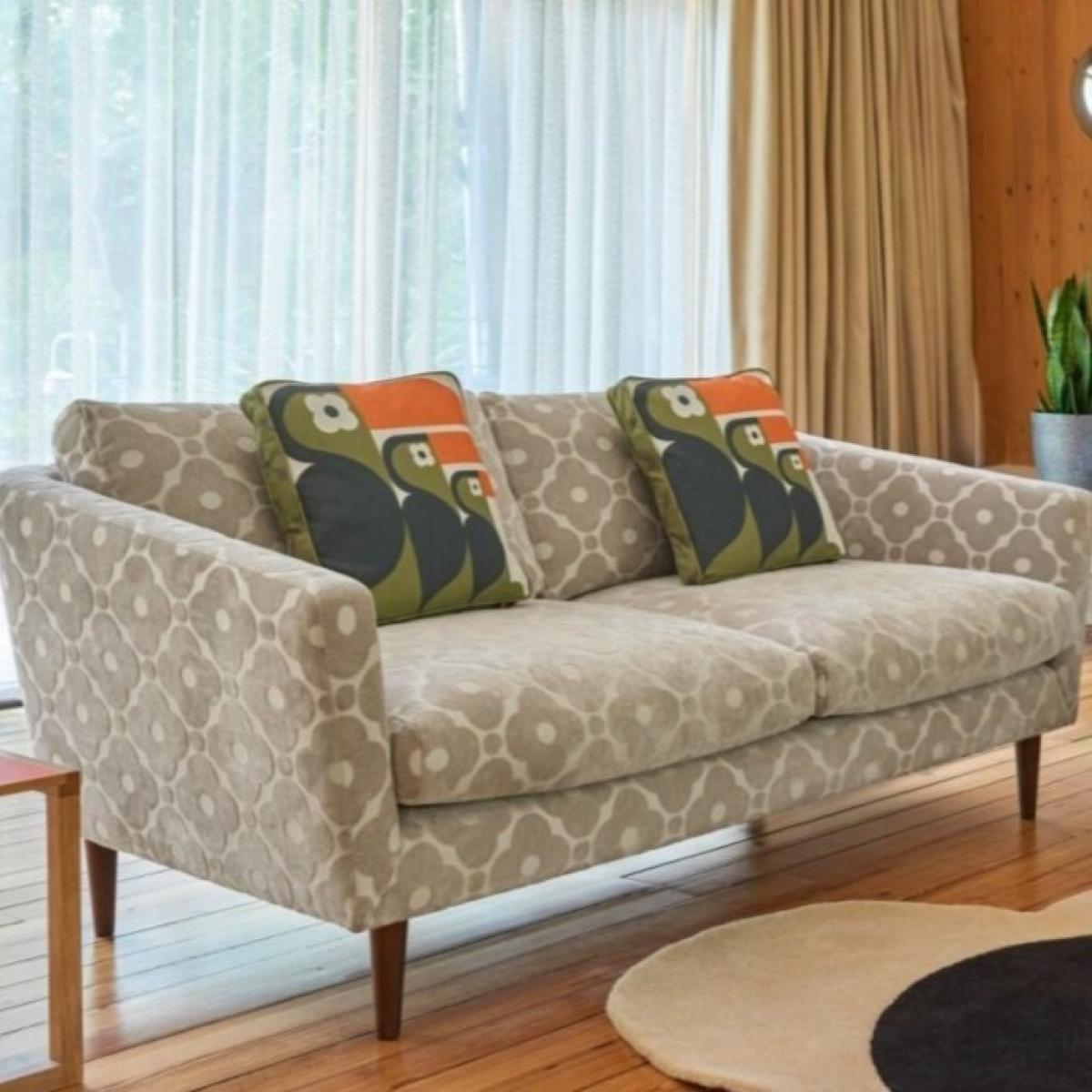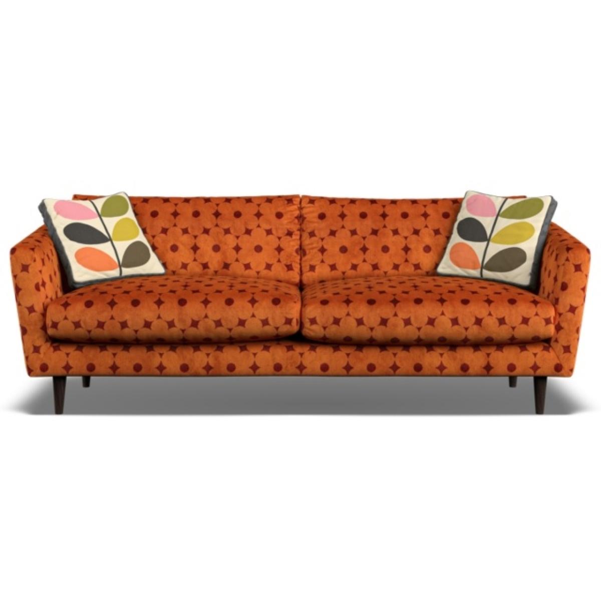 Orla Kiely's upholstered furniture collection brings to life her playful combination of colour and pattern to add a pop of fun to your everyday. Each piece is directly influenced by Orla to apply her signature modern twist to mid-century style. Combining the best of British craftsmanship with the design excellence of Orla Kiely, each one of our sofas is hand-made to order in the UK. Each piece in the range has been personally approved by Orla herself and all fabrics have been hand-picked by the Queen of Prints. Every sofa features official brand detailing such as woven tags and the signature Stem printed lining cloth. The frames are made from hard wood, sourced from sustainable forests, and are pinned, screwed, and glued to ensure maximum strength and stability. Each piece is built to last and comes with a 10-year guarantee on all hardwood frames and steel springs. Inspired by elements of classic Scandinavian design, combining fluid curves and tailored lines, the plush and sophisticated Dorsey range invites you to sink in and stay a while. With an elegant, curved silhouette, the Dorsey range is perfect for cozy living rooms with a Nordic design sensibility. Dimensions: Height 81cm Width 190cm Depth 93cm Seat cushions are composed with a feather topper for a super-comfortable sit Available in a colourful range of plain and patterned fabrics, plus exclusive Orla Kiely scatters of your choice. All screens vary in colour reproduction and whilst every effort has been made to display the colour as accurately as possible it is for guidance only.