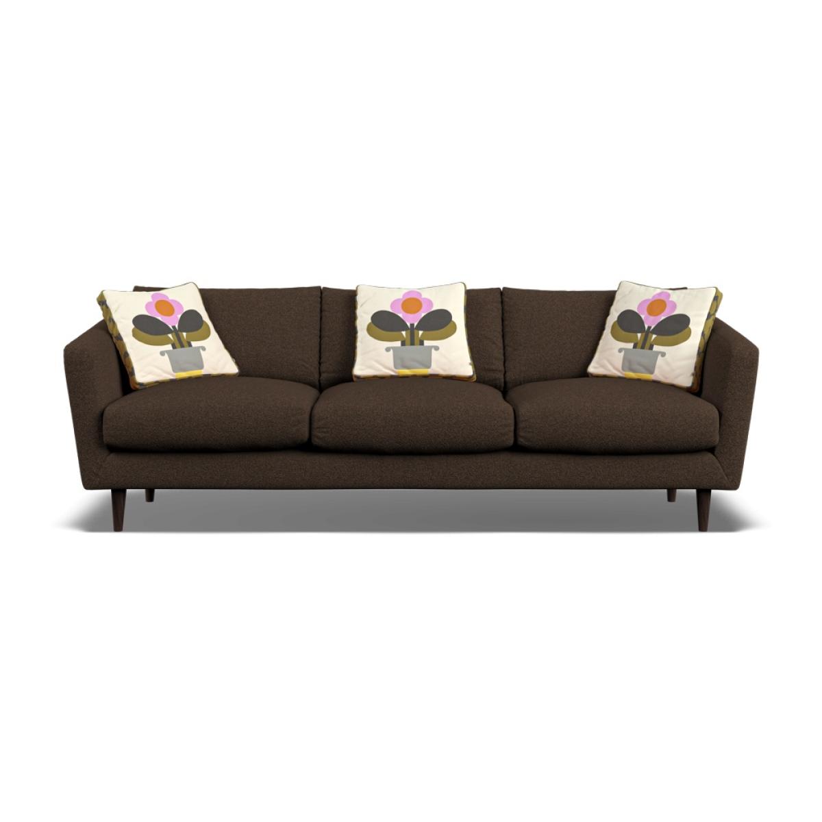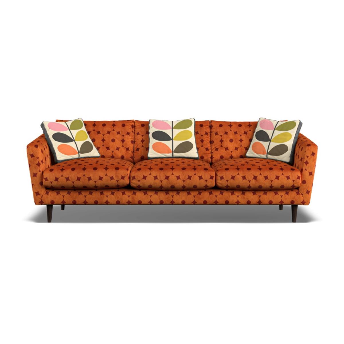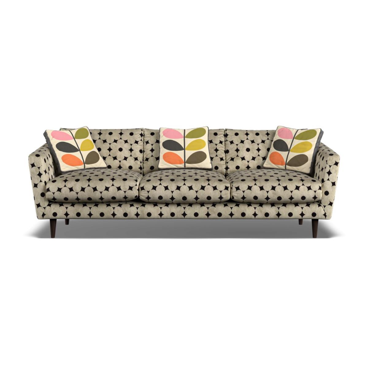 Orla Kiely's upholstered furniture collection brings to life her playful combination of colour and pattern to add a pop of fun to your everyday. Each piece is directly influenced by Orla to apply her signature modern twist to mid-century style. Inspired by elements of classic Scandinavian design, combining fluid curves and tailored lines, the plush and sophisticated Dorsey range invites you to sink in and stay a while. With an elegant, curved silhouette, the Dorsey sofa is perfect for cozy living rooms with a Nordic design sensibility. Every item is handmade to order in the UK, allowing for endless authentic Orla Kiely looks to be created using the wide range of colour and exclusive pattern available. The range consists of furniture to suit any space, from large corner sofas to small accent chairs and stools, with all hardwood timber frames backed by a 10 year manufacturer warranty. Combining the best of British craftsmanship with the design excellence of Orla Kiely, each piece in the range has been personally approved by Orla herself and all fabrics have been hand-picked by the Queen of Prints. Every sofa features official brand detailing such as woven tags and the signature Stem printed lining cloth. The frames are made from hard wood, sourced from sustainable forests, and are pinned, screwed, and glued to ensure maximum strength and stability. XL Sofa Dimensions: Height: 81cm Width: 235cm Depth: 93cm Features: Seat cushions are composed with a feather topper for a super-comfortable sit Available in a colourful range of velvets and textured fabrics, plus exclusive Orla Kiely scatters of your choice. 10 year guarantee on all hardwood frames and steel springs. Handmade in the UK All screens vary in colour reproduction and whilst every effort has been made to display the colour as accurately as possible it is for guidance only.
