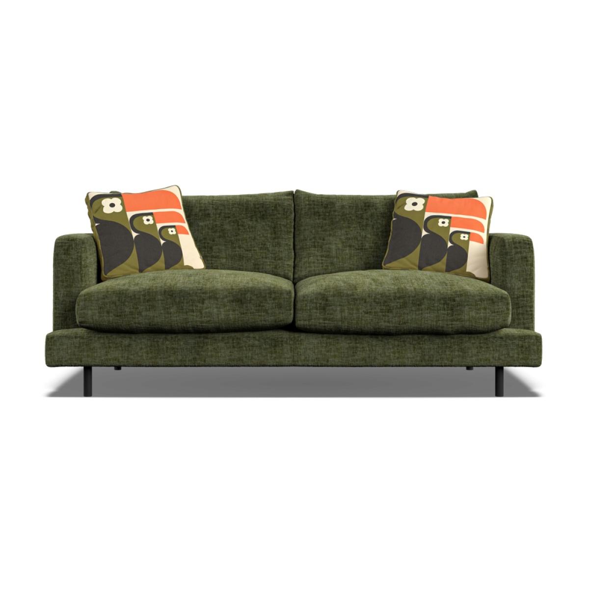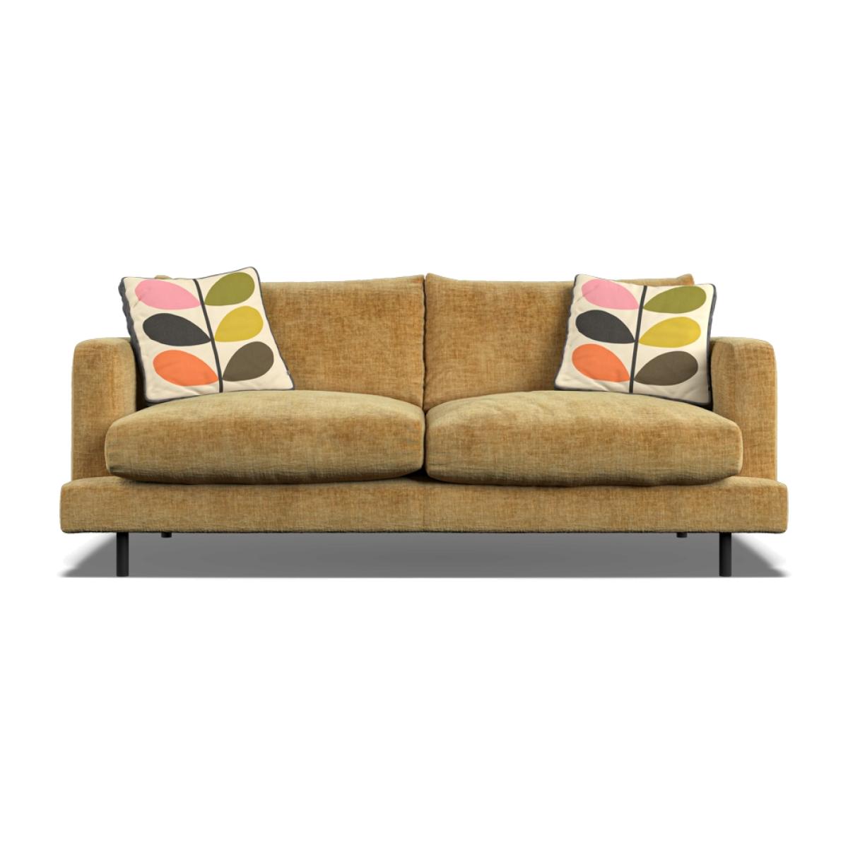 Orla Kiely's upholstered furniture collection brings to life her playful combination of colour and pattern to add a pop of fun to your everyday. Each piece is directly influenced by Orla to apply her signature modern twist to mid-century style. Every item is handmade to order in the UK, allowing for endless authentic Orla Kiely looks to be created using the wide range of colour and exclusive pattern available. The range consists of furniture to suit any space, from large corner sofas to small accent chairs and stools, with all hardwood timber frames backed by a 10 year manufacturer warranty. Combining the best of British craftsmanship with the design excellence of Orla Kiely, each one of our sofas is hand-made to order in the UK. Each piece in the range has been personally approved by Orla herself and all fabrics have been hand-picked by the Queen of Prints. Every sofa features official brand detailing such as woven tags and the signature Stem printed lining cloth. The frames are made from hard wood, sourced from sustainable forests, and are pinned, screwed, and glued to ensure maximum strength and stability. Each piece is built to last and comes with a 10 year guarantee on all hardwood frames and steel springs. The Larch has ultra-clean lines, a low-profile stance and narrow set back arms. Available either with architectural black powder-coated steel legs for a light, floating appearance, or more traditional tapered wood. Subtle features like the wrap over front seat pads and lowbacks give Larch a laid-back modern aesthetic. Dimensions Height 79cm  Width 190cm  Depth 95cm. Seat height: 44cm Seat width: 168cm Seat depth: 60cm Arm height: 63cm Leg height: 15cm Seat cushions are composed with a feather topper for a super-comfortable sit. Available in a colourful range of velvets and textured fabrics, plus exclusive Orla Kiely scatters of your choice. All screens vary in colour reproduction and whilst every effort has been made to display the colour as accurately as possible it is for guidance only.