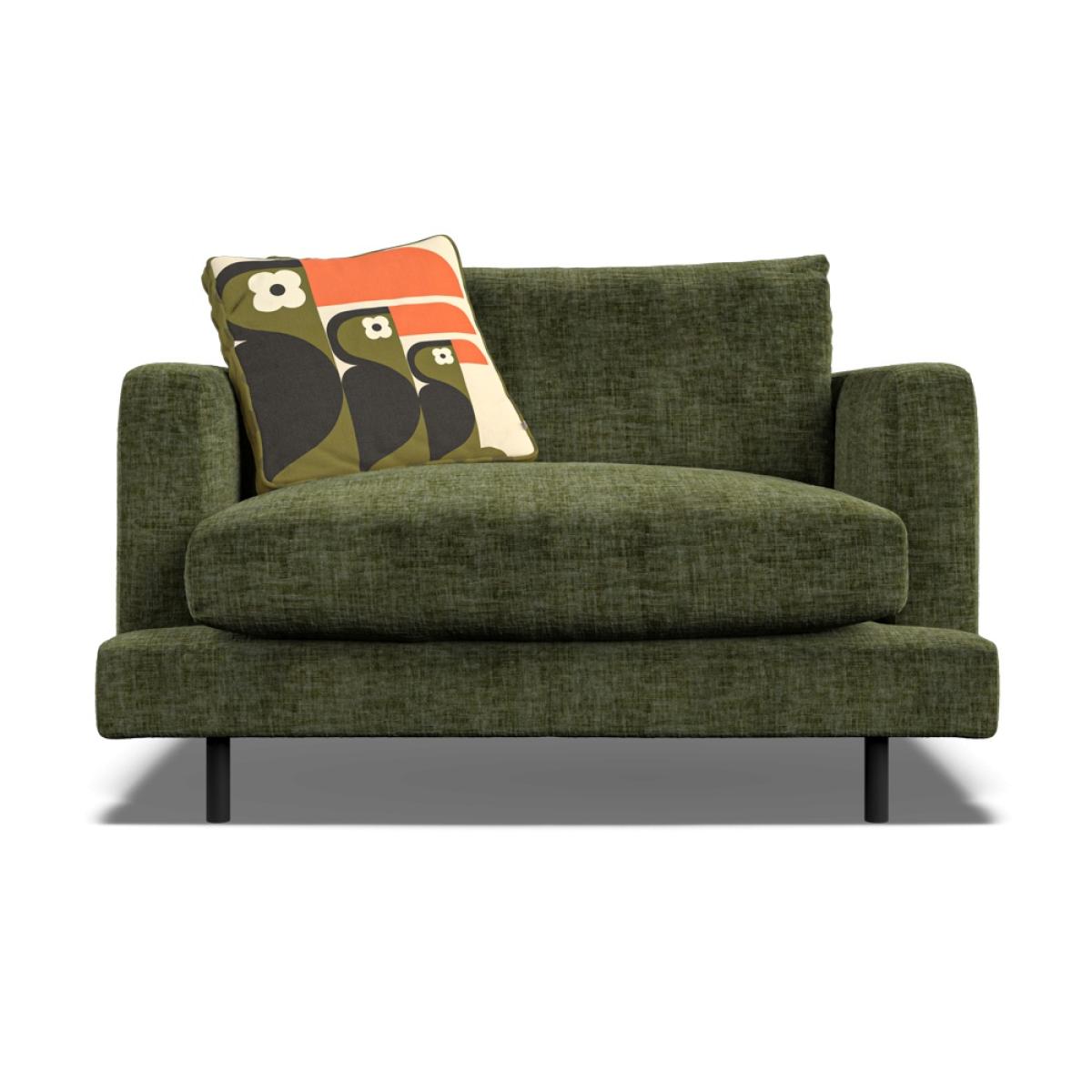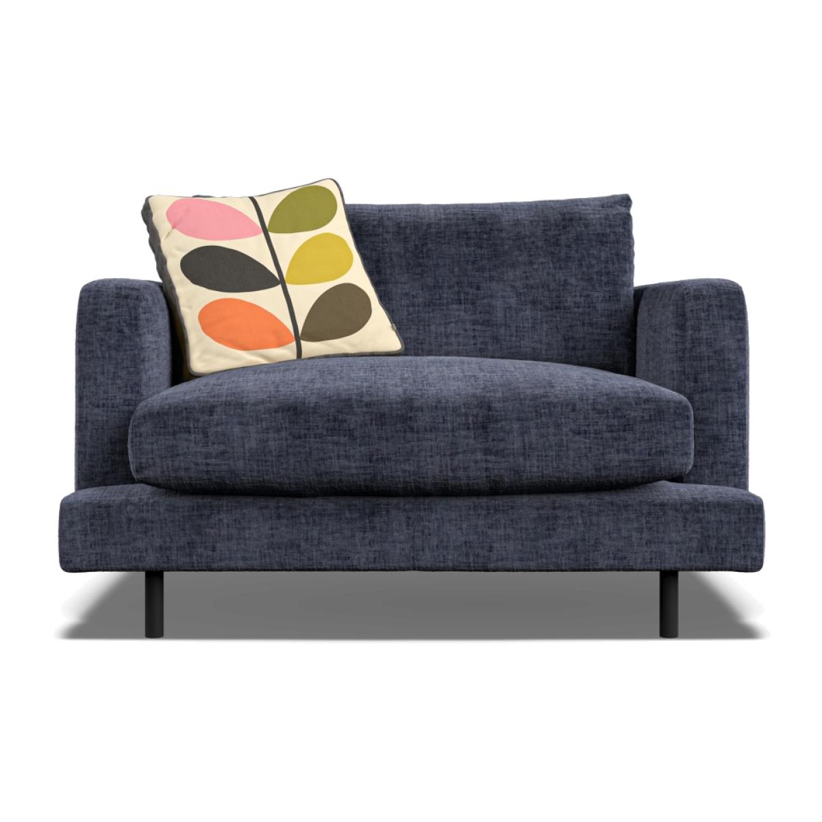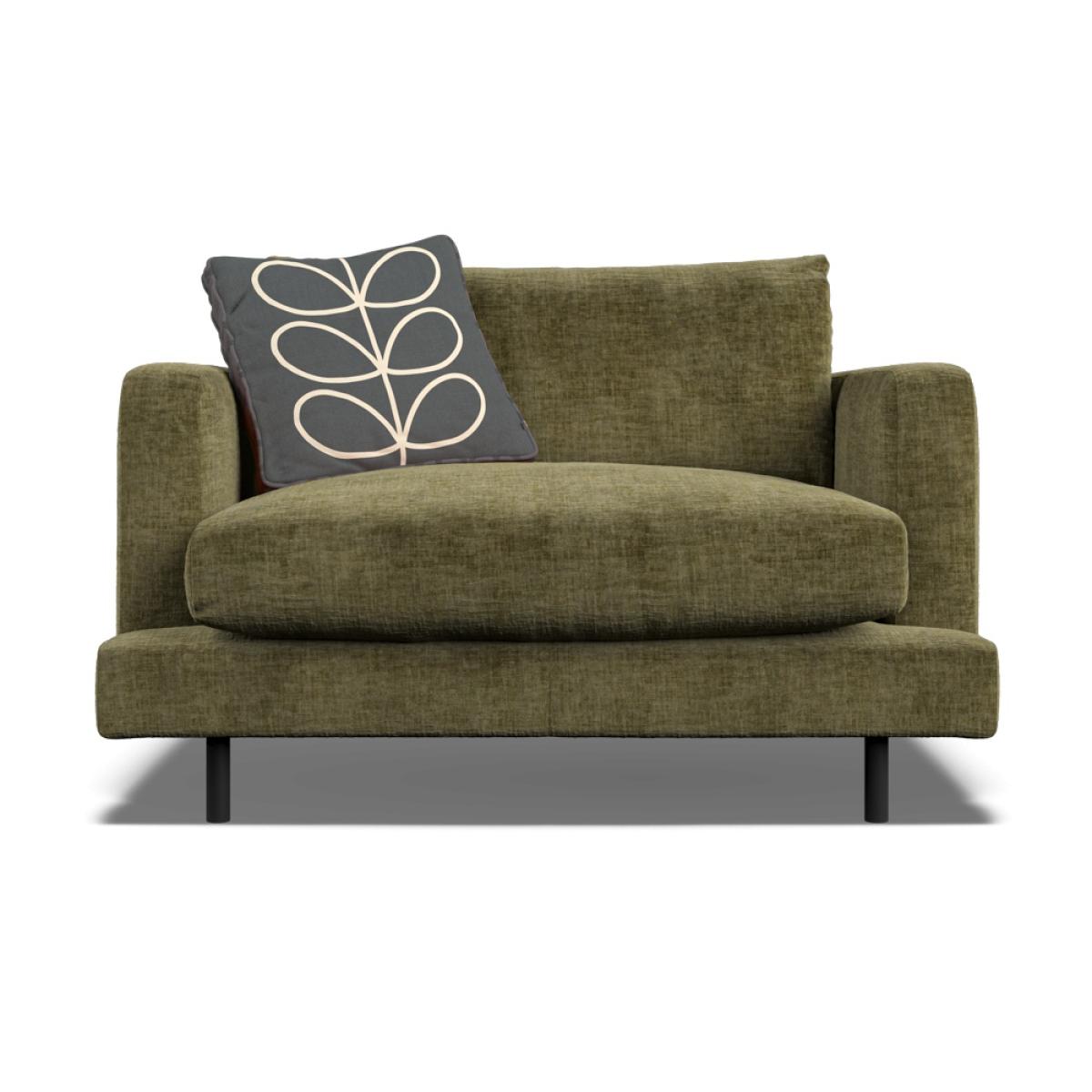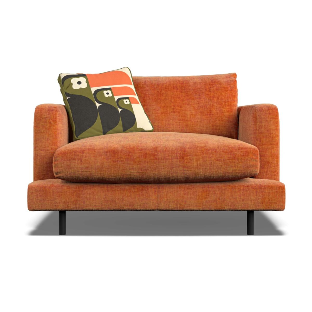Orla Kiely's upholstered furniture collection brings to life her playful combination of colour and pattern to add a pop of fun to your everyday. Each piece is directly influenced by Orla to apply her signature modern twist to mid-century style. Every item is handmade to order in the UK, allowing for endless authentic Orla Kiely looks to be created using the wide range of colour and exclusive pattern available. The range consists of furniture to suit any space, from large corner sofas to small accent chairs and stools, with all hardwood timber frames backed by a 10 year manufacturer warranty. Combining the best of British craftsmanship with the design excellence of Orla Kiely, each one of our sofas is hand-made to order in the UK. Each piece in the range has been personally approved by Orla herself and all fabrics have been hand-picked by the Queen of Prints. Every sofa features official brand detailing such as woven tags and the signature Stem printed lining cloth. The frames are made from hard wood, sourced from sustainable forests, and are pinned, screwed, and glued to ensure maximum strength and stability. Each piece is built to last and comes with a 10 year guarantee on all hardwood frames and steel springs. The Larch has ultra-clean lines, a low-profile stance and narrow set back arms. Available either with architectural black powder-coated steel legs for a light, floating appearance, or more traditional tapered wood. Subtle features like the wrap over front seat pads and lowbacks give Larch a laid-back modern aesthetic. Seat cushions are composed with a feather topper for a super-comfortable sit. Available in a colourful range of velvets and textured fabrics, plus exclusive Orla Kiely scatters of your choice. Dimensions H 79cm x W 120cm x D 95cm. All screens vary in colour reproduction and whilst every effort has been made to display the colour as accurately as possible it is for guidance only.