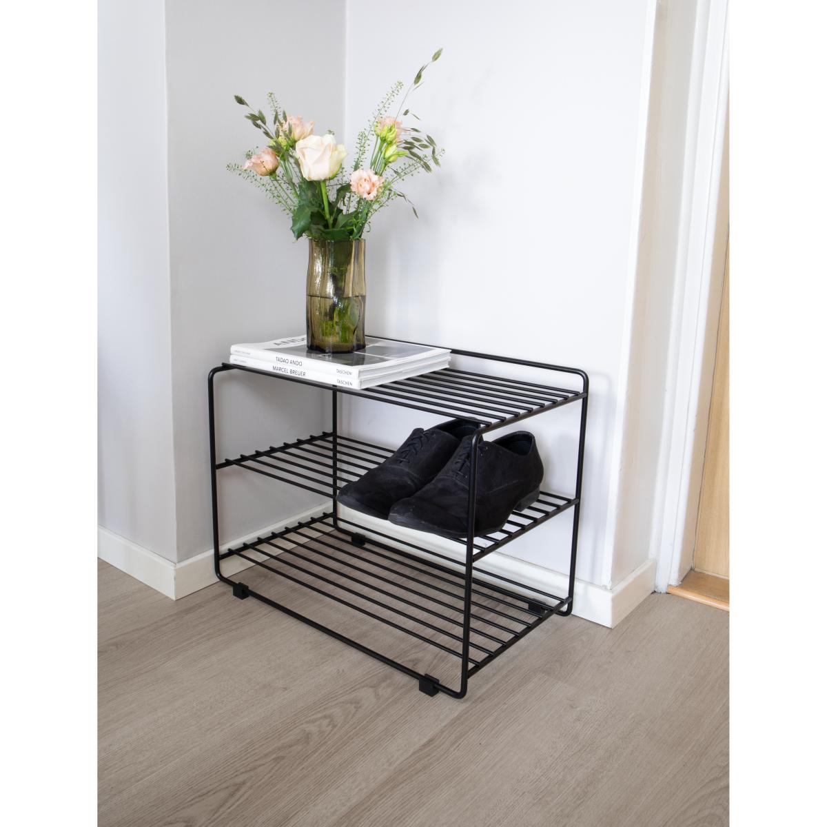 I like how this slim black shoe rack keeps footwear neatly organised without eating into your hallway or wardrobe space. Its open-slatted design makes it easy to see and grab pairs at a glance, while the matte black finish slots effortlessly into contemporary, industrial or Scandi-inspired interiors. For styling, group shoes by height or colour to create a tidy look, and consider placing a shallow tray or basket on the top shelf for keys and sunglasses. In a hallway you could lean a narrow mirror above it to reflect light, or tuck a small plant pot beside it to soften the lines. It’s equally useful in a bedroom or utility room and can be paired with woven storage boxes on the top tier for extra organisation.