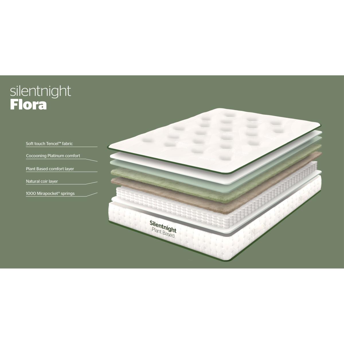 Experience a rejuvenating nights sleep like no other with the Flora mattress by Silentnight, a masterpiece powered by the wonders of nature. Handcrafted in the UK to boost your sleep experience, this mattress is an oasis of comfort infused with natures best-kept secrets. As you immerse yourself into the natural embrace of the Flora, an innovative layer comprised of bamboo, kapok, flax and aloe vera awaits to cocoon you in refreshing bliss throughout the night. Coir fibres, made from the husk of ripe coconuts work alongside Silentnight’s covested Mirapocket spring system to give you springy comfort with enhanced breathability, ensuring you wake up feeling refreshed and ready to take on the day with ease. Medium Tension - Good all rounder for front, side or back sleepers Features: 1000 Mirapocket Springs - Each mattress with Mirapocket technology contains individual small springs, which are housed in their own separate fabric pockets. Each spring helps to spread your weight evenly across the bed providing the perfect, firm support and comfort that's second to none. It offers zonal support for perfect spinal alignment. This system eliminates roll-together so less partner disturbance. Platinum Comfort Layer - With its superb pressure relief, Silentnight’s Platinum Comfort layer is comparable to memory foam, however it is foam free and provides 10 times more breathability which is great for hot sleepers. This layer can be recycled at the end of the mattress’ life span. Plant Based Comfort Layer - A fusion of naturally cooling, anti-allergenic and protecting fibres have been sustainably plucked from nature and crafted into Silentnight’s innovative Plant Based Comfort Layer. Bamboo, Kapok, Flax, and Aloe Vera join forces to make each night a soothing sleep experience, ensuring you wake up revitalised and invigorated with a refreshing, natural boost each morning. Coir Fibres - Super resilient and packed with sleep-enhancing goodness, choir is made from the husk of ripe coconuts which forms springy and breathable fibres. Coir is often compared to horsehair due to its resilience and bounciness, and when combined with it’s anti-allergy properties and breathability, it makes it the perfect mattress filling! Tencel™ Cover - Innovative and sustainable Tencel™ fibres are woven into the mattress cover and sides to create a cool-touch sleep surface. Tencel™ fibres help to drawer heat and moisture away from your body as you sleep, whilst providing antibacterial protection, for a refreshing and more hygienic sleep. Hand-Tufted - The traditional method of mattress upholstery where the fillings are secured by hand with tufts from the top of the mattress to the bottom to ensure all loose fillings are secured to provide the perfect finish. Side Stitching - Extends the sleeping area to the mattress edge by supporting the mattress walls. Flag-stitched Handles - Handles on both sides for ease of positioning. Mattress Cover - 67% Viscose, 33% Lyocell Easy Care - No need to turn, but regular rotation from head to toe will extend the mattresses life span. Mattress Dimensions: Single - W 90cm x L 190cm (4ft6) x D 26.5cm (10.4”) - Weight - 21kg Double - W 135cm (4ft6) x L 190cm (6ft3) x D 26.5cm (10.4”) - Weight - 32kg King - W 150cm (5ft) x L 200cm (6ft6) x D 26.5cm (10.4”) - Weight - 37.5kg Super King - W 180cm (6ft) x L 200cm (6ft6) x D 26.5cm (10.4”) - Weight - 45kg