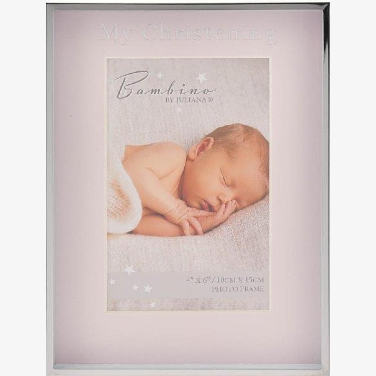A Christening Day frame from BAMBINO BY JULIANA®.This affectionately decorated frame offers beautifully soft tones to celebrate an important day. The silver metal frame features a soft pink mount which surrounds the portrait aperture and is completed by its ‘My Christening’ silver decal. It is suitable for either wall hanging or freestanding display around the home. Product Dimensions 205 h 155 w 25 d mm. The frame is packaged in a branded closed box.